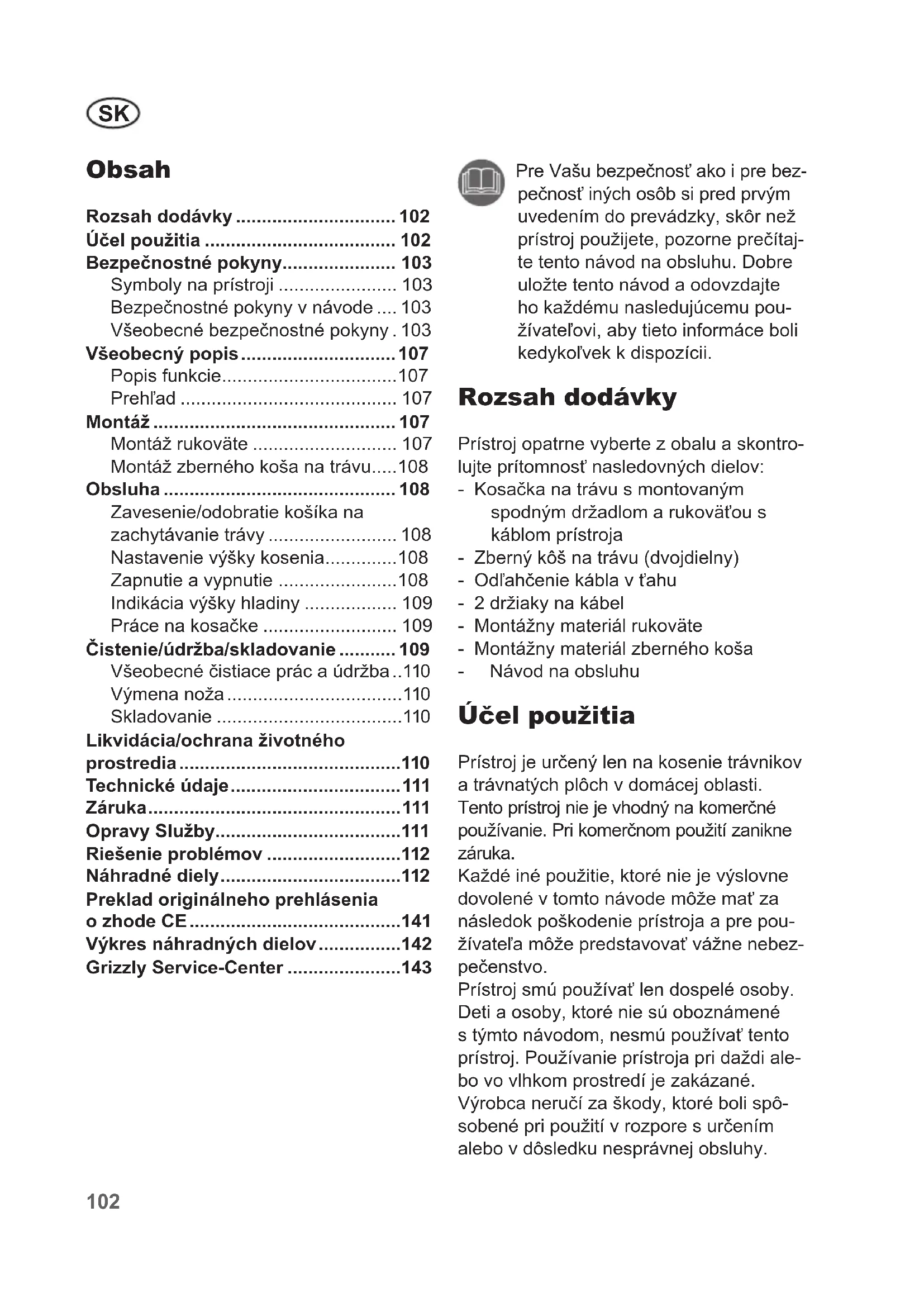- Pre Vašu bezpečnosť ako i pre bez- pečnosť iných osôb si pred prvým uvedením do prevádzky, skôr než prístroj použijete, pozorne prečítaj- te tento návod na obsluhu. Dobre uložte tento návod a odovzdajte ho každému nasledujúcemu pou- žívateľovi, aby tieto informáce boli kedykoľvek k dispozícii. Rozsah dodávky Prístroj opatrne vyberte z obalu a skontro- lujte prítomnosť nasledovných dielov: - Kosačka na trávu s montovaným spodným držadlom a rukoväťou s káblom prístroja - Zberný kôš na trávu (dvojdielny) - Odľahčenie kábla v ťahu - 2 držiaky na kábel - Montážny materiál rukoväte - Montážny materiál zberného koša - Návod na obsluhu Účel použitia Prístroj je určený len na kosenie trávnikov a trávnatých plôch v domácej oblasti. Tento prístroj nie je vhodný na komerčné používanie. Pri komerčnom použití zanikne záruka. Každé iné použitie, ktoré nie je výslovne dovolené v tomto návode môže mať za následok poškodenie prístroja a pre pou- žívateľa môže predstavovať vážne nebez- pečenstvo. Prístroj smú používať len dospelé osoby. Deti a osoby, ktoré nie sú oboznámené s týmto návodom, nesmú používať tento prístroj. Používanie prístroja pri daždi ale- bo vo vlhkom prostredí je zakázané. Výrobca neručí za škody, ktoré boli spô- sobené pri použití v rozpore s určením alebo v dôsledku nesprávnej obsluhy. Obsah Rozsah dodávky p. 102