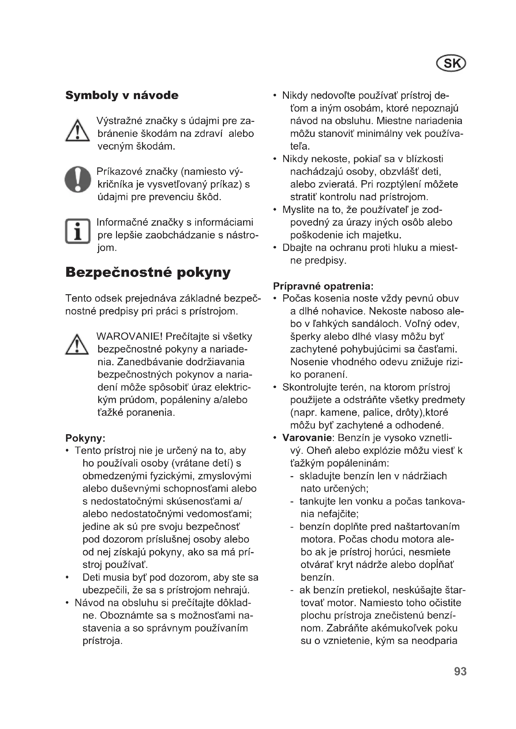 poškodeniu prístroja a predstavovať váž- ne nebezpečenstvo pre používateľa. Prístroj je určený len na používanie do- spelými osobami. Deti ako aj osoby, ktoré nie sú oboznámené s týmto návodom, nemôžu prístroj používať. Obsluhujúci alebo používateľ je zodpovedný za úrazy iných osôb, alebo za škody na ich majet- ku.Výrobca nezodpovedá za škody, ktoré boli spôsobené používaním nezodpove- dajúcim účelu použitia alebo nesprávnou obsluhou prístroja. Pre Vašu bezpečnosť ako i pre bezpečnosť iných osôb si pred prvým uvedením do prevádzky, skôr než prístroj použijete, pozorne prečítajte tento návod na obslu- hu. Dobre uložte tento návod a odovzdajte ho každému nasledujúcemu používa- teľovi, aby tieto informáce boli kedykoľvek k dispozícii.92