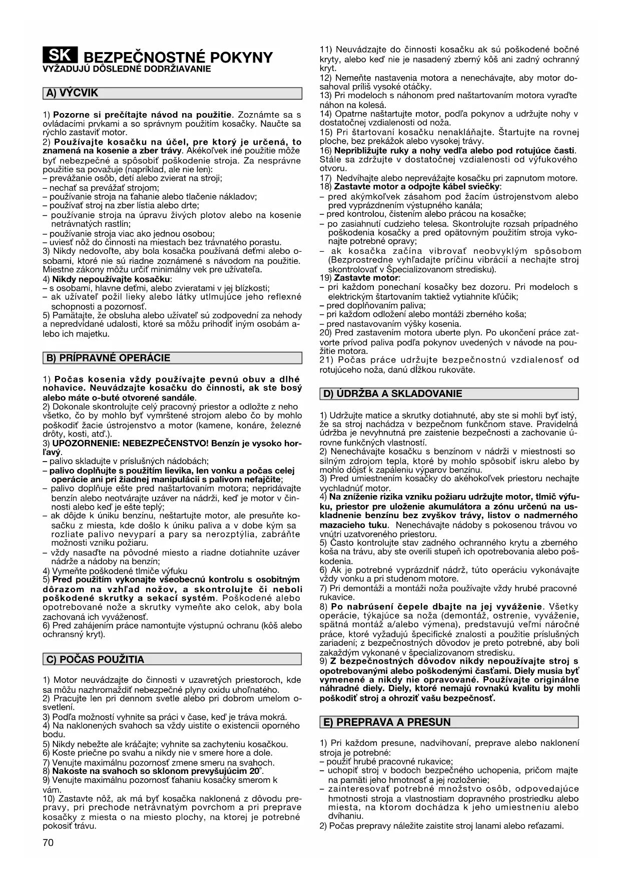 BEZPEČNOSTNÉ POKYNY - Používaniu vašej kosačky musíte venova náležitú pozornos. Za týmto účelom boli na stroji umiestnené symboly, ktoré majú za cie pripomína vám hlavné pokyny, spojené s jeho použitím. Ich význam je vysvetlený v nasledujúcej časti. Doporučujeme vám pozorne si prečíta bezpečnostné pokyny uvedené v príslušnej kapitole tohto návodu.