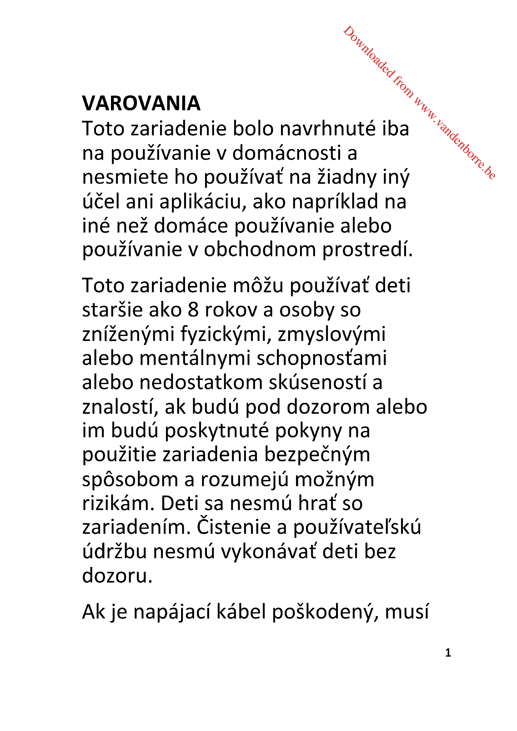 Downloaded from www.vandenborre.beVAROVANIA Toto zariadenie bolo navrhnuté iba na používanie v domácnosti a nesmiete ho používaƛ na žiadny iný úēel ani aplikáciu, ako napríklad na iné než domáce používanie alebo používanie v obchodnom prostredí. Toto zariadenie môžu používaƛ deti staršie ako 8 rokov a osoby so zníženými fyzickými, zmyslovými alebo mentálnymi schopnosƛami alebo nedostatkom skúseností a znalostí, ak budú pod dozorom alebo im budú poskytnuté pokyny na použitie zariadenia bezpeēným spôsobom a rozumejú možným rizikám. Deti sa nesmú hraƛ so zariadením. istenie a používateűskú údržbu nesmú vykonávaƛ deti bez dozoru. Ak je napájací kábel poškodený, musí