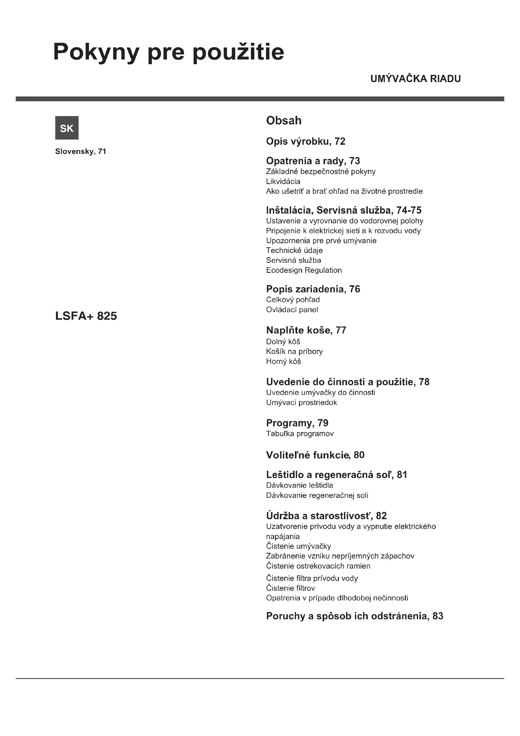 Pokyny pre použitie Obsah Opis výrobku, 72 Opatrenia a rady, 73 Základné bezpečnostné pokyny Likvidácia Ako ušetriť a brať ohľad na životné prostredie Inštalácia, Servisná služba, 74-75 Ustavenie a vyrovnanie do vodorovnej polohy Pripojenie k elektrickej sieti a k rozvodu vody Upozornenia pre prvé umývanie Technické údaje Servisná služba Ecodesign Regulation Popis zariadenia, 76 Celkový pohľad Ovládací panel Naplňte koše , 77 Dolný kôš Košík na príbory Horný kôš Uvedenie do činnosti a použitie, 78 Uvedenie umývačky do činnosti Umývací prostriedok Programy, 79 Tabuľka programov Voliteľné funkcie , 80 Leštidlo a regeneračná soľ, 81 Dávkovanie leštidla Dávkovanie regeneračnej soli Údržba a starostlivosť, 82 Uzatvorenie prívodu vody a vypnutie elektrického napájania Čistenie umývačky Zabránenie vzniku nepríjemných zápachov Čistenie ostrekovacích ramien Čistenie ltra prívodu vody Čistenie ltrov Opatrenia v prípade dlhodobej nečinnosti Poruchy a spôsob ich odstránenia, 8372