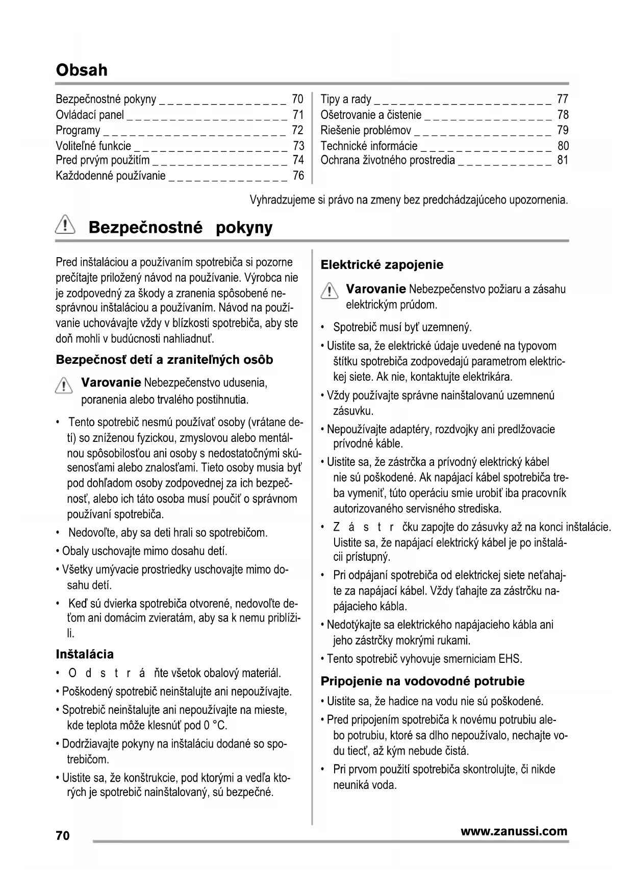 www.zanussi.comObsah Bezpečnostné pokyny _ _ _ _ _ _ _ _ _ _ _ _ _ _ _ 70 Ovládací panel _ _ _ _ _ _ _ _ _ _ _ _ _ _ _ _ _ _ _ 71 Programy _ _ _ _ _ _ _ _ _ _ _ _ _ _ _ _ _ _ _ _ _ 72 Voliteľné funkcie _ _ _ _ _ _ _ _ _ _ _ _ _ _ _ _ _ _ 73 Pred prvým použitím _ _ _ _ _ _ _ _ _ _ _ _ _ _ _ _ 74 Každodenné používanie _ _ _ _ _ _ _ _ _ _ _ _ _ _ 76 Tipy a rady _ _ _ _ _ _ _ _ _ _ _ _ _ _ _ _ _ _ _ _ _ 77 Ošetrovanie a čistenie _ _ _ _ _ _ _ _ _ _ _ _ _ _ _ 78 Riešenie problémov _ _ _ _ _ _ _ _ _ _ _ _ _ _ _ _ 79 Technické informácie _ _ _ _ _ _ _ _ _ _ _ _ _ _ _ 80 Ochrana životného prostredia _ _ _ _ _ _ _ _ _ _ _ 81 Vyhradzujeme si právo na zmeny bez predchádzajúceho upozornenia. Bezpečnostné pokyny Pred inštaláciou a používaním spotrebiča si pozorne prečítajte priložený návod na používanie. Výrobca nie je zodpovedný za škody a zranenia spôsobené ne- správnou inštaláciou a používaním. Návod na použí- vanie uchovávajte vždy v blízkosti spotrebiča, aby ste doň mohli v budúcnosti nahliadnuť. Bezpečnosť detí a zraniteľných osôb Varovanie Nebezpečenstvo udusenia, poranenia alebo trvalého postihnutia.