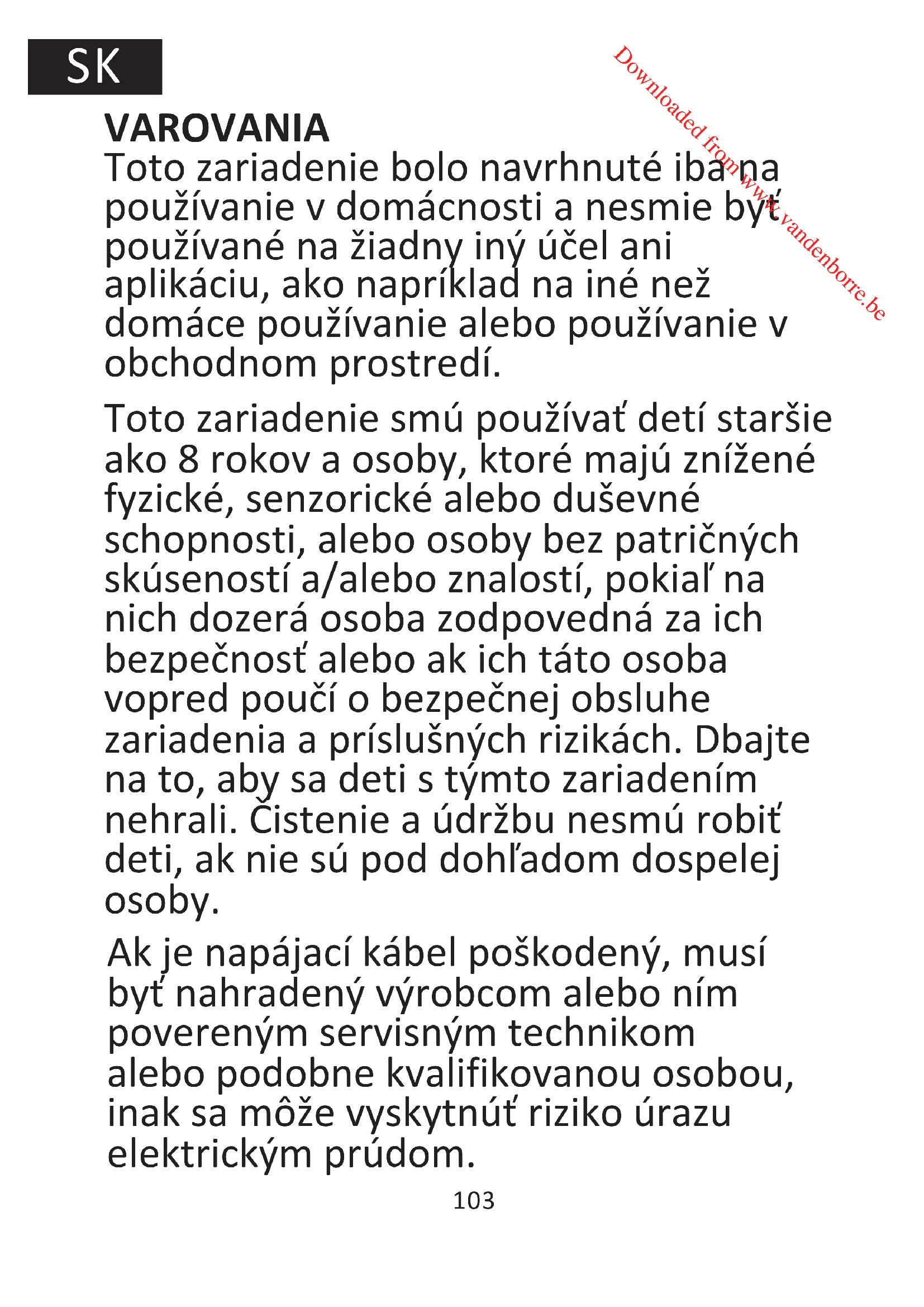 Downloaded from www.vandenborre.beVAROVANIA Toto zariadenie bolo navrhnuté iba na používanie v domácnosti a nesmie byť používané na žiadny iný účel ani aplikáciu, ako napríklad na iné než domáce používanie alebo používanie v obchodnom prostredí.
