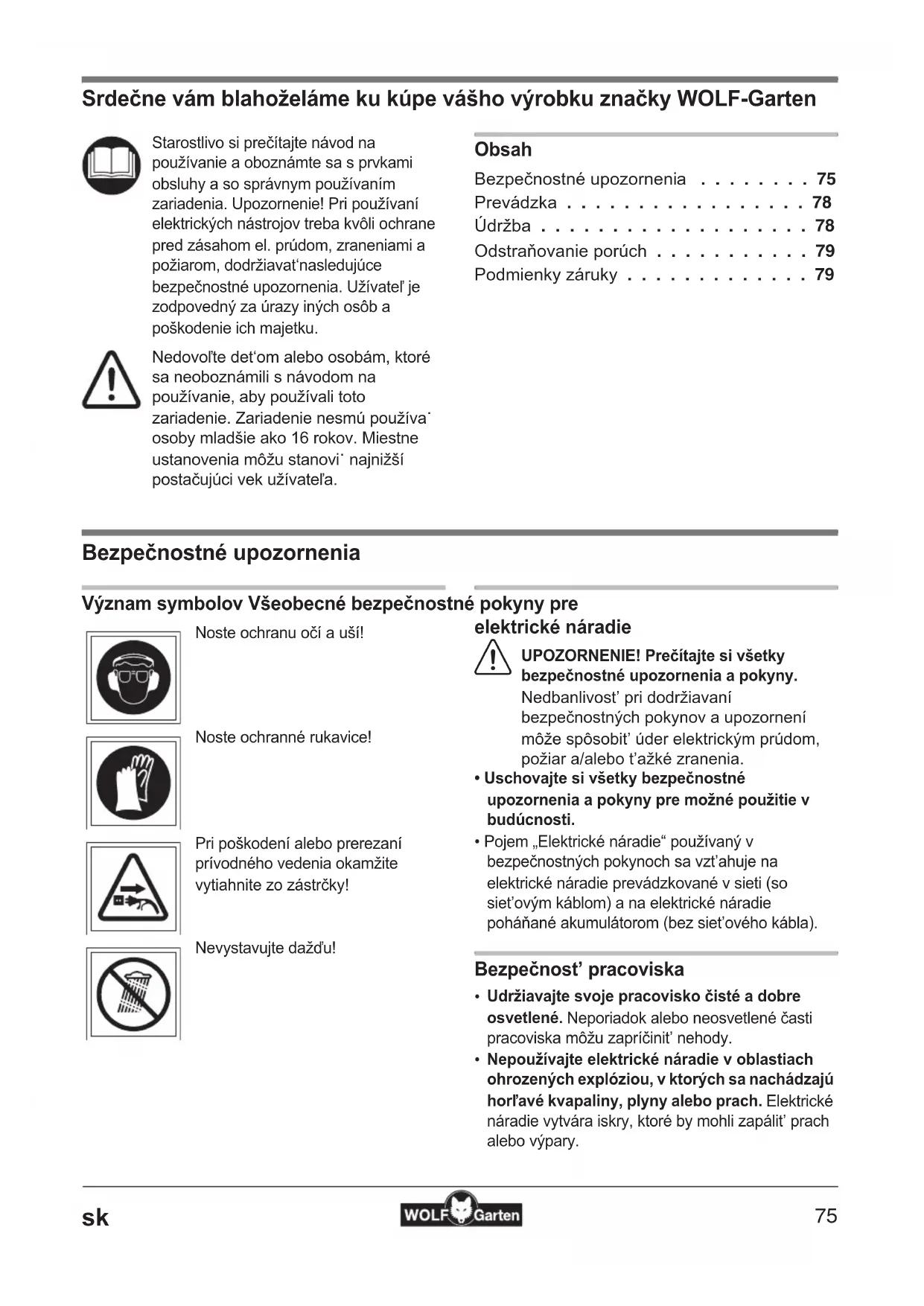 Udržiavajte svoje pracovisko isté a dobre osvetlené. Neporiadok alebo neosvetlené asti pracoviska môžu zapríinit’ nehody. Nepoužívajte elektrické náradie v oblastiach ohrozených explóziou, v ktorých sa nachádzajú horavé kvapaliny, plyny alebo prach. Elektrické náradie vytvára iskry, ktoré by mohli zapálit’ prach alebo výpary.Starostlivo si preítajte návod na používanie a oboznámte sa s prvkami obsluhy a so správnym používaním zariadenia. Upozornenie! Pri používaní elektrických nástrojov treba kvôli ochrane pred zásahom el. prúdom, zraneniami a požiarom, dodržiavat‘nasledujúce bezpenostné upozornenia. Užívate je zodpovedný za úrazy iných osôb a poškodenie ich majetku.Nedovote det‘om alebo osobám, ktoré sa neoboznámili s návodom na používanie, aby používali toto zariadenie. Zariadenie nesmú používa³ osoby mladšie ako 16 rokov. Miestne ustanovenia môžu stanovi³ najnižší postaujúci vek užívatea.Noste ochranu oí a uší!Noste ochranné rukavice!Pri poškodení alebo prerezaní prívodného vedenia okamžite vytiahnite zo zástrky!Nevystavujte daž¨u! Originálny návod na obsluhu - sk76