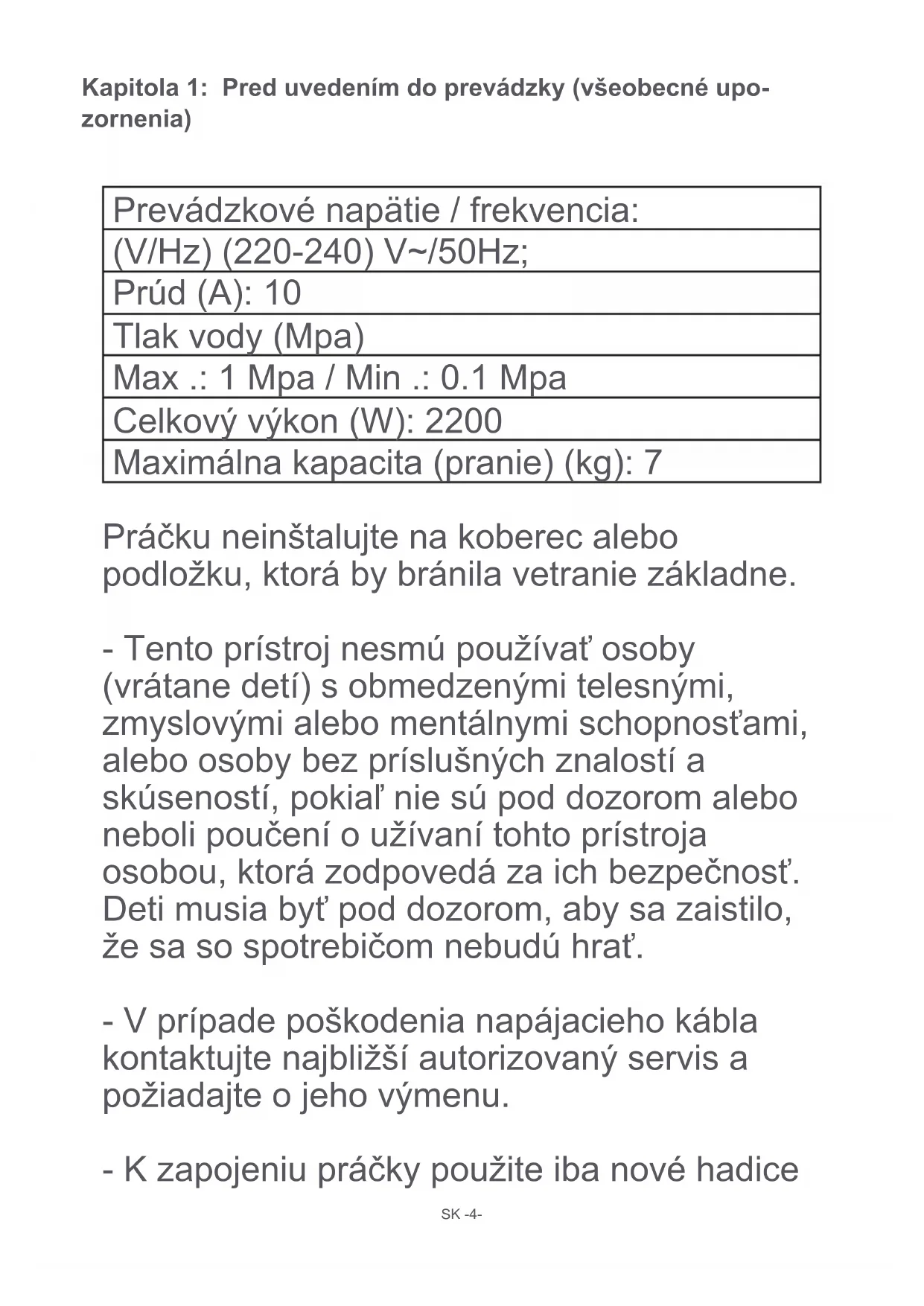 - Likvidácia starého spotrebiča 82 ObsahSK -4- Kapitola 1: Pred uvedením do prevádzky (všeobecné upo- zornenia) Prevádzkovénapätie/frekvencia: (V/Hz)(220-240)V~/50Hz; Prúd(A):10 Tlakvody(Mpa) Max.:1Mpa/Min.:0.1Mpa Celkovývýkon(W):2200 Maximálnakapacita(pranie)(kg):7 Práčkuneinštalujtenakoberecalebo podložku,ktorábybránilavetraniezákladne. -Tentoprístrojnesmúpoužívaťosoby (vrátanedetí)sobmedzenýmitelesnými, zmyslovýmialebomentálnymischopnosťami, aleboosobybezpríslušnýchznalostía skúseností,pokiaľniesúpoddozoromalebo nebolipoučeníoužívanítohtoprístroja osobou,ktorázodpovedázaichbezpečnosť. Detimusiabyťpoddozorom,abysazaistilo, žesasospotrebičomnebudúhrať. -Vprípadepoškodenianapájaciehokábla kontaktujtenajbližšíautorizovanýservisa požiadajteojehovýmenu. -KzapojeniupráčkypoužiteibanovéhadiceSK -5- preprívodvodydodávanejsvašoupráčkou. Nikdynepoužívajtestaré,použitéalebo poškodenéhadice. -Tentospotrebičmôžupoužívaťdetistaršie ako8rokovaosobysobmedzenými telesnými,zmyslovýmialebomentálnymi schopnosťami,aleboosobybezpríslušných znalostíaskúseností,pokiaľsúpod dozoromalebobolipoučenéobezpečnom používanítohtoprístrojaachápusúvisiace nebezpečenstvo. Detisasozariadenímnesmúhrať. Čistenieaúdržbanesmiebyťvykonávané deťmibezdohľadudospelejosoby. Poznámka:Akpotrebujetekópiutohtonávodu napoužitie,pošlitesprávunanasledujúcu adresu:“washingmachine@standardtest.info”. Vosvojome-mailuuveďtenázovmodelu asériovéčíslo(20číslic),ktorénájdetena dveráchspotrebiča. Kapitola 1: Pred uvedením do prevádzky (všeobecné upo- zornenia)SK-6- Kapitola 1: Pred uvedením do prevádzky (správne použitie)