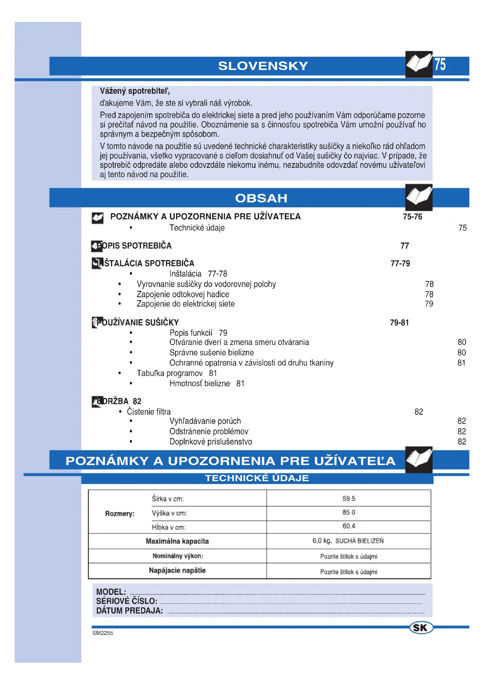 ▼ Táto sušička bielizne je určená výhradne na použitie v domácnosti. Každé iné používanie sa bude považovať za nevhodné a preto nebezpečné. ▼ Odložte si tento návod na použitie, aby ste doňho mohli v prípade potreby rýchlo nazrieť. ▼ Akákoľvek zmena alebo pokus o manipuláciu so spotrebičom môžu znamenať nebezpečenstvo pre používateľa a môžu spôsobiť poškodenie výrobku. ▼ Pri dodávke spotrebiča skontrolujte, či sa počas prepravy nepoškodil. Ak by ste zistili poškodenia, okamžite ich ohláste predajcovi. ▼ Sušičku neprikrývajte bielizňou, ani inými materiálmi. ▼ Pri umiestňovaní spotrebiča zabezpečte, aby napájací elektrický kábel nebol zalomený, stlačený a aby bol v prípade nevyhnutných zásahov prístupný ▼ Po používaní sušičky vždy zatvorte dvere. ▼ Takto zamedzíte tomu, že sa deti budú opierať o dvierka, čím by mohli spôsobiť prevrhnutie sušičky. ▼ Je zakázané používanie spotrebiča deťmi bez dozoru. ▼ Nezabudnite, že počas cyklu sušenia sa odtoková hadica zohreje a môže dosiahnuť teplotu vyššiu ako 60°C. Nedotýkajte sa týchto častí pred ukončením cyklu chladenia. ▼ Spotrebič nepoužívajte na sušenie špinavých odevov. ▼ Nesušte odevy zašpinené od kuchynského oleja, nafty, acetónu, alkoholu, benzínu, kerosénu, odstraňovačov škvŕn, rozpúšťadiel, vosku. ▼ Z takto zašpinených odevov, pred ich vložením do sušičky, odstráňte uvedené látky vypraním v teplej vode s väčším prídavkom pracieho prostriedku. ▼ Nikdy nesušte odevy z penovej gumy, latexu, nepriepustné odevy, impregnované tkaniny, gumené koberčeky, odevy s potlačou, ani odevy a vankúše s časťami z penovej gumy, pretože tieto materiály by sa mohli rozpustiť a poškodiť iné odevy alebo dokonca aj spotrebič. ▼ Avivážne prostriedky a podobné produkty treba používať v súlade s pokynmi výrobcu uvedenými na ich obale. ▼ V prípade predaja alebo odovzdania spotrebiča nezabudnite odovzdať novému majiteľovi aj tento návod na používanie. Umožní mu to používať sušičku bielizne správnym a bezpečným spôsobom. ▼ Nepokúšajte sa opraviť poruchy spotrebiča sami; opravy vykonané inými osobami, ako odborníkmi, môžu spôsobiť vážne poškodenia a znamenajú stratu akéhokoľvek nároku na záručné opravy. ▼ Opravy spotrebiča môžu vykonať výhradne autorizovaní pracovníci servisného strediska. Pri opravách môžu byť použité výhradne originálne náhradné diely. ▼ Pred vložením do sušičky bielizeň dôkladne odstreďte alebo vyžmýkajte. Dobre odstredená bielizeň sa vysuší rýchlejšie. ▼ Pri každom použití sušičky dobre vyčistite filter, aby sa zabezpečilo dokonalé prúdenie vzduchu. ▼ Zástrčku do zásuvky elektrickej siete nevsúvajte, ani ju nevyťahujte mokrými rukami. ▼ Spotrebič musí byť zapojený do elektrickej zásuvky s uzemnením, ktorá vyhovuje bezpečnostným normám. ▼ Pri zapojení spotrebiča do elektrickej siete nepoužívajte predlžovačky, ani adaptéry. ▼ Spotrebič nevystavujte atmosferickým vplyvom. ▼ Pred vykonaním údržby alebo čistenia spotrebiča ho nezabudnite odpojiť od elektrickej siete. Neťahajte za napájací elektrický kábel, uchopte zástrčku. ▼ Tento spotrebič je označený značkou potvrdzujúcou, že je v súlade s európskou smernicou 2002/96/ES, Elektrický a elektronický odpadový materiál (WEEE). Zabezpečte likvidáciu spotrebiča správnym spôsobom. Povinnosťou užívateľa je prispievať k predchádzaniu akýchkoľvek škodlivých dopadov na zdravie a životné prostredie. ▼ Tento symbol na spotrebiči alebo na sprievodných dokumentoch znamená, že s týmto výrobkom sa nesmie zaobchádzať ako s bežným mestským odpadom, ale treba ho odovzdať v autorizovanom zbernom stredisku, aby bola umožnená recyklácia elektrických a elektronických častí. ▼ Pri likvidácii spotrebiča dodržiavajte platné miestne predpisy. Podrobnejšie informácie o zaobchádzaní a opätovnom použití spotrebiča získate na príslušných úradoch, v miestnych zberných strediskách alebo u predajcu, u ktorého ste spotrebič kúpili.