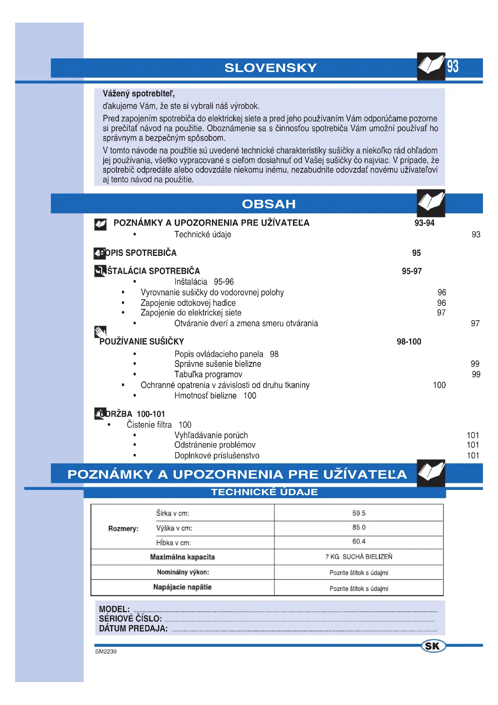 CZ93 SM2239 OBSAH MODEL: .................................................................................................................................................................................................................. SÉRIOVÉ ČÍSLO: ........................................................................................................................................................................................... DÁTUM PREDAJA: ....................................................................................................................................................................................... SLOVENSKY Vážený spotrebiteľ, ďakujeme Vám, že ste si vybrali náš výrobok. Pred zapojením spotrebiča do elektrickej siete a pred jeho používaním Vám odporúčame pozorne si prečítať návod na použitie. Oboznámenie sa s činnosťou spotrebiča Vám umožní používať ho správnym a bezpečným spôsobom. V tomto návode na použitie sú uvedené technické charakteristiky sušičky a niekoľko rád ohľadom jej používania, všetko vypracované s cieľom dosiahnuť od Vašej sušičky čo najviac. V prípade, že spotrebič odpredáte alebo odovzdáte niekomu inému, nezabudnite odovzdať novému užívateľovi aj tento návod na použitie.