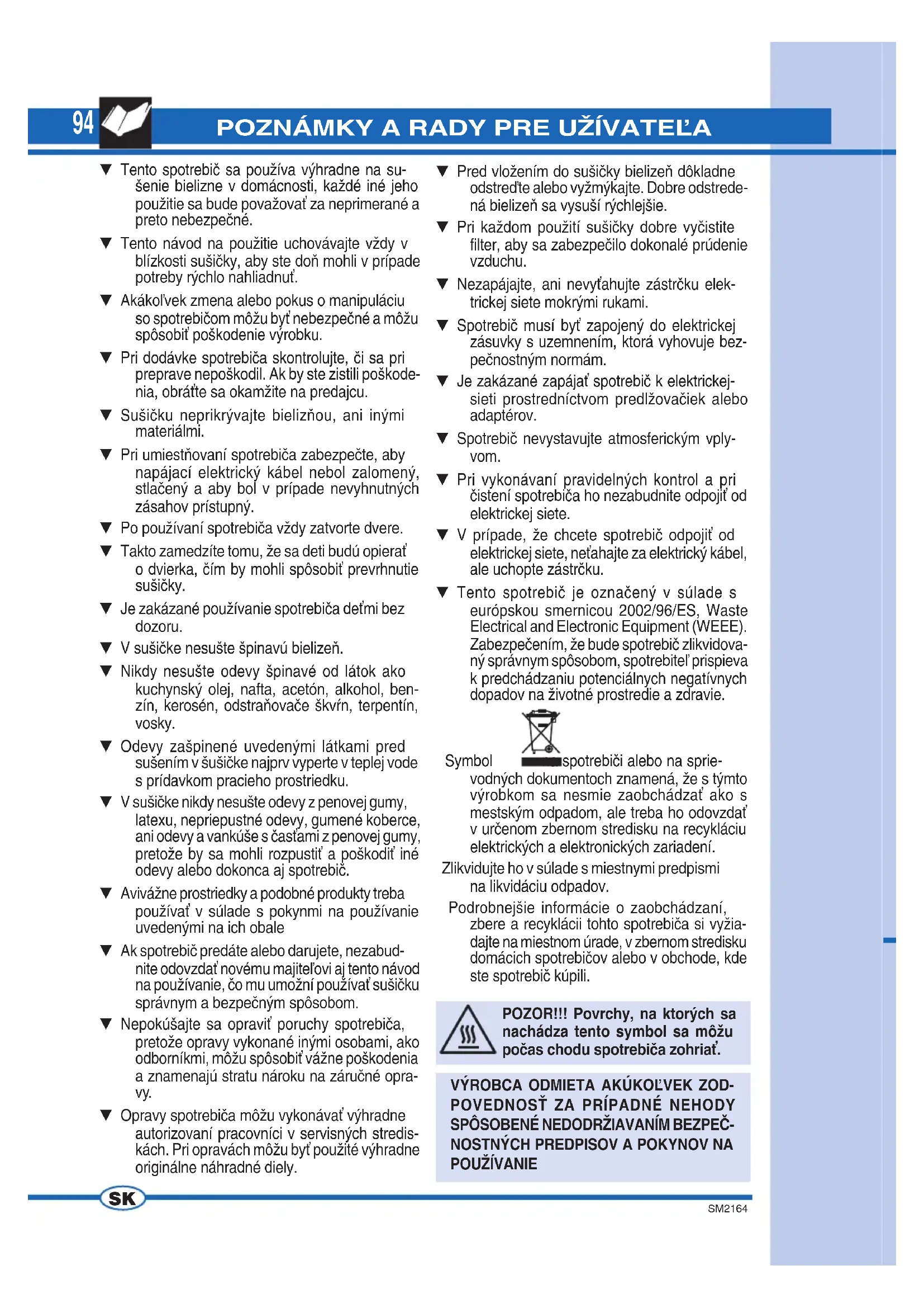 - Řešení problémů 10194 SM2164 POZNÁMKY A RADY PRE UŽÍVATEĽA ▼ Tento spotrebič sa používa výhradne na su- šenie bielizne v domácnosti, každé iné jeho použitie sa bude považovať za neprimerané a preto nebezpečné. ▼ Tento návod na použitie uchovávajte vždy v blízkosti sušičky, aby ste doň mohli v prípade potreby rýchlo nahliadnuť. ▼ Akákoľvek zmena alebo pokus o manipuláciu so spotrebičom môžu byť nebezpečné a môžu spôsobiť poškodenie výrobku. ▼ Pri dodávke spotrebiča skontrolujte, či sa pri preprave nepoškodil. Ak by ste zistili poškode- nia, obráťte sa okamžite na predajcu. ▼ Sušičku neprikrývajte bielizňou, ani inými materiálmi. ▼ Pri umiestňovaní spotrebiča zabezpečte, aby napájací elektrický kábel nebol zalomený, stlačený a aby bol v prípade nevyhnutných zásahov prístupný. ▼ Po používaní spotrebiča vždy zatvorte dvere. ▼ Takto zamedzíte tomu, že sa deti budú opierať o dvierka, čím by mohli spôsobiť prevrhnutie sušičky. ▼ Je zakázané používanie spotrebiča deťmi bez dozoru. ▼ V sušičke nesušte špinavú bielizeň. ▼ Nikdy nesušte odevy špinavé od látok ako kuchynský olej, nafta, acetón, alkohol, ben- zín, kerosén, odstraňovače škvŕn, terpentín, vosky. ▼ Odevy zašpinené uvedenými látkami pred sušením v šušičke najprv vyperte v teplej vode s prídavkom pracieho prostriedku. ▼ V sušičke nikdy nesušte odevy z penovej gumy, latexu, nepriepustné odevy, gumené koberce, ani odevy a vankúše s časťami z penovej gumy, pretože by sa mohli rozpustiť a poškodiť iné odevy alebo dokonca aj spotrebič. ▼ Avivážne prostriedky a podobné produkty treba používať v súlade s pokynmi na používanie uvedenými na ich obale ▼ Ak spotrebič predáte alebo darujete, nezabud- nite odovzdať novému majiteľovi aj tento návod na používanie, čo mu umožní používať sušičku správnym a bezpečným spôsobom. ▼ Nepokúšajte sa opraviť poruchy spotrebiča, pretože opravy vykonané inými osobami, ako odborníkmi, môžu spôsobiť vážne poškodenia a znamenajú stratu nároku na záručné opra- vy. ▼ Opravy spotrebiča môžu vykonávať výhradne autorizovaní pracovníci v servisných stredis- kách. Pri opravách môžu byť použité výhradne originálne náhradné diely. ▼ Pred vložením do sušičky bielizeň dôkladne odstreďte alebo vyžmýkajte. Dobre odstrede- ná bielizeň sa vysuší rýchlejšie. ▼ Pri každom použití sušičky dobre vyčistite filter, aby sa zabezpečilo dokonalé prúdenie vzduchu. ▼ Nezapájajte, ani nevyťahujte zástrčku elek- trickej siete mokrými rukami. ▼ Spotrebič musí byť zapojený do elektrickej zásuvky s uzemnením, ktorá vyhovuje bez- pečnostným normám. ▼ Je zakázané zapájať spotrebič k elektrickej- sieti prostredníctvom predlžovačiek alebo adaptérov. ▼ Spotrebič nevystavujte atmosferickým vply- vom. ▼ Pri vykonávaní pravidelných kontrol a pri čistení spotrebiča ho nezabudnite odpojiť od elektrickej siete. ▼ V prípade, že chcete spotrebič odpojiť od elektrickej siete, neťahajte za elektrický kábel, ale uchopte zástrčku. ▼ Tento spotrebič je označený v súlade s európskou smernicou 2002/96/ES, Waste Electrical and Electronic Equipment (WEEE). Zabezpečením, že bude spotrebič zlikvidova- ný správnym spôsobom, spotrebiteľ prispieva k predchádzaniu potenciálnych negatívnych dopadov na životné prostredie a zdravie. Symbol na spotrebiči alebo na sprie- vodných dokumentoch znamená, že s týmto výrobkom sa nesmie zaobchádzať ako s mestským odpadom, ale treba ho odovzdať v určenom zbernom stredisku na recykláciu elektrických a elektronických zariadení. Zlikvidujte ho v súlade s miestnymi predpismi na likvidáciu odpadov. Podrobnejšie informácie o zaobchádzaní, zbere a recyklácii tohto spotrebiča si vyžia- dajte na miestnom úrade, v zbernom stredisku domácich spotrebičov alebo v obchode, kde ste spotrebič kúpili. POZOR!!! Povrchy, na ktorých sa nachádza tento symbol sa môžu počas chodu spotrebiča zohriať. VÝROBCA ODMIETA AKÚKOĽVEK ZOD-