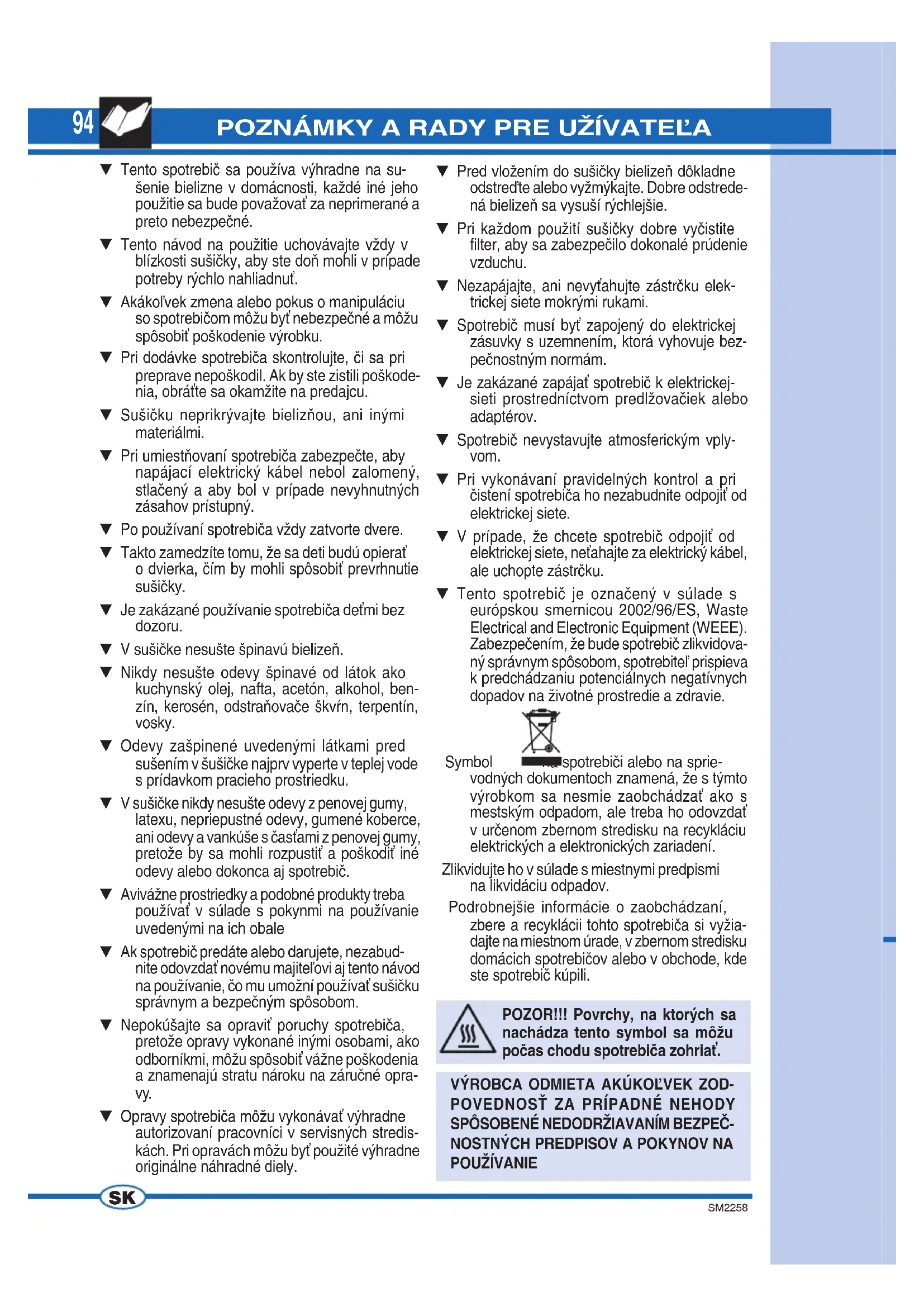- Řešení problémů 10194 SM2258 POZNÁMKY A RADY PRE UŽÍVATEĽA ▼ Tento spotrebič sa používa výhradne na su- šenie bielizne v domácnosti, každé iné jeho použitie sa bude považovať za neprimerané a preto nebezpečné. ▼ Tento návod na použitie uchovávajte vždy v blízkosti sušičky, aby ste doň mohli v prípade potreby rýchlo nahliadnuť. ▼ Akákoľvek zmena alebo pokus o manipuláciu so spotrebičom môžu byť nebezpečné a môžu spôsobiť poškodenie výrobku. ▼ Pri dodávke spotrebiča skontrolujte, či sa pri preprave nepoškodil. Ak by ste zistili poškode- nia, obráťte sa okamžite na predajcu. ▼ Sušičku neprikrývajte bielizňou, ani inými materiálmi. ▼ Pri umiestňovaní spotrebiča zabezpečte, aby napájací elektrický kábel nebol zalomený, stlačený a aby bol v prípade nevyhnutných zásahov prístupný. ▼ Po používaní spotrebiča vždy zatvorte dvere. ▼ Takto zamedzíte tomu, že sa deti budú opierať o dvierka, čím by mohli spôsobiť prevrhnutie sušičky. ▼ Je zakázané používanie spotrebiča deťmi bez dozoru. ▼ V sušičke nesušte špinavú bielizeň. ▼ Nikdy nesušte odevy špinavé od látok ako kuchynský olej, nafta, acetón, alkohol, ben- zín, kerosén, odstraňovače škvŕn, terpentín, vosky. ▼ Odevy zašpinené uvedenými látkami pred sušením v šušičke najprv vyperte v teplej vode s prídavkom pracieho prostriedku. ▼ V sušičke nikdy nesušte odevy z penovej gumy, latexu, nepriepustné odevy, gumené koberce, ani odevy a vankúše s časťami z penovej gumy, pretože by sa mohli rozpustiť a poškodiť iné odevy alebo dokonca aj spotrebič. ▼ Avivážne prostriedky a podobné produkty treba používať v súlade s pokynmi na používanie uvedenými na ich obale ▼ Ak spotrebič predáte alebo darujete, nezabud- nite odovzdať novému majiteľovi aj tento návod na používanie, čo mu umožní používať sušičku správnym a bezpečným spôsobom. ▼ Nepokúšajte sa opraviť poruchy spotrebiča, pretože opravy vykonané inými osobami, ako odborníkmi, môžu spôsobiť vážne poškodenia a znamenajú stratu nároku na záručné opra- vy. ▼ Opravy spotrebiča môžu vykonávať výhradne autorizovaní pracovníci v servisných stredis- kách. Pri opravách môžu byť použité výhradne originálne náhradné diely. ▼ Pred vložením do sušičky bielizeň dôkladne odstreďte alebo vyžmýkajte. Dobre odstrede- ná bielizeň sa vysuší rýchlejšie. ▼ Pri každom použití sušičky dobre vyčistite filter, aby sa zabezpečilo dokonalé prúdenie vzduchu. ▼ Nezapájajte, ani nevyťahujte zástrčku elek- trickej siete mokrými rukami. ▼ Spotrebič musí byť zapojený do elektrickej zásuvky s uzemnením, ktorá vyhovuje bez- pečnostným normám. ▼ Je zakázané zapájať spotrebič k elektrickej- sieti prostredníctvom predlžovačiek alebo adaptérov. ▼ Spotrebič nevystavujte atmosferickým vply- vom. ▼ Pri vykonávaní pravidelných kontrol a pri čistení spotrebiča ho nezabudnite odpojiť od elektrickej siete. ▼ V prípade, že chcete spotrebič odpojiť od elektrickej siete, neťahajte za elektrický kábel, ale uchopte zástrčku. ▼ Tento spotrebič je označený v súlade s európskou smernicou 2002/96/ES, Waste Electrical and Electronic Equipment (WEEE). Zabezpečením, že bude spotrebič zlikvidova- ný správnym spôsobom, spotrebiteľ prispieva k predchádzaniu potenciálnych negatívnych dopadov na životné prostredie a zdravie. Symbol na spotrebiči alebo na sprie- vodných dokumentoch znamená, že s týmto výrobkom sa nesmie zaobchádzať ako s mestským odpadom, ale treba ho odovzdať v určenom zbernom stredisku na recykláciu elektrických a elektronických zariadení. Zlikvidujte ho v súlade s miestnymi predpismi na likvidáciu odpadov. Podrobnejšie informácie o zaobchádzaní, zbere a recyklácii tohto spotrebiča si vyžia- dajte na miestnom úrade, v zbernom stredisku domácich spotrebičov alebo v obchode, kde ste spotrebič kúpili. POZOR!!! Povrchy, na ktorých sa nachádza tento symbol sa môžu počas chodu spotrebiča zohriať. VÝROBCA ODMIETA AKÚKOĽVEK ZOD-