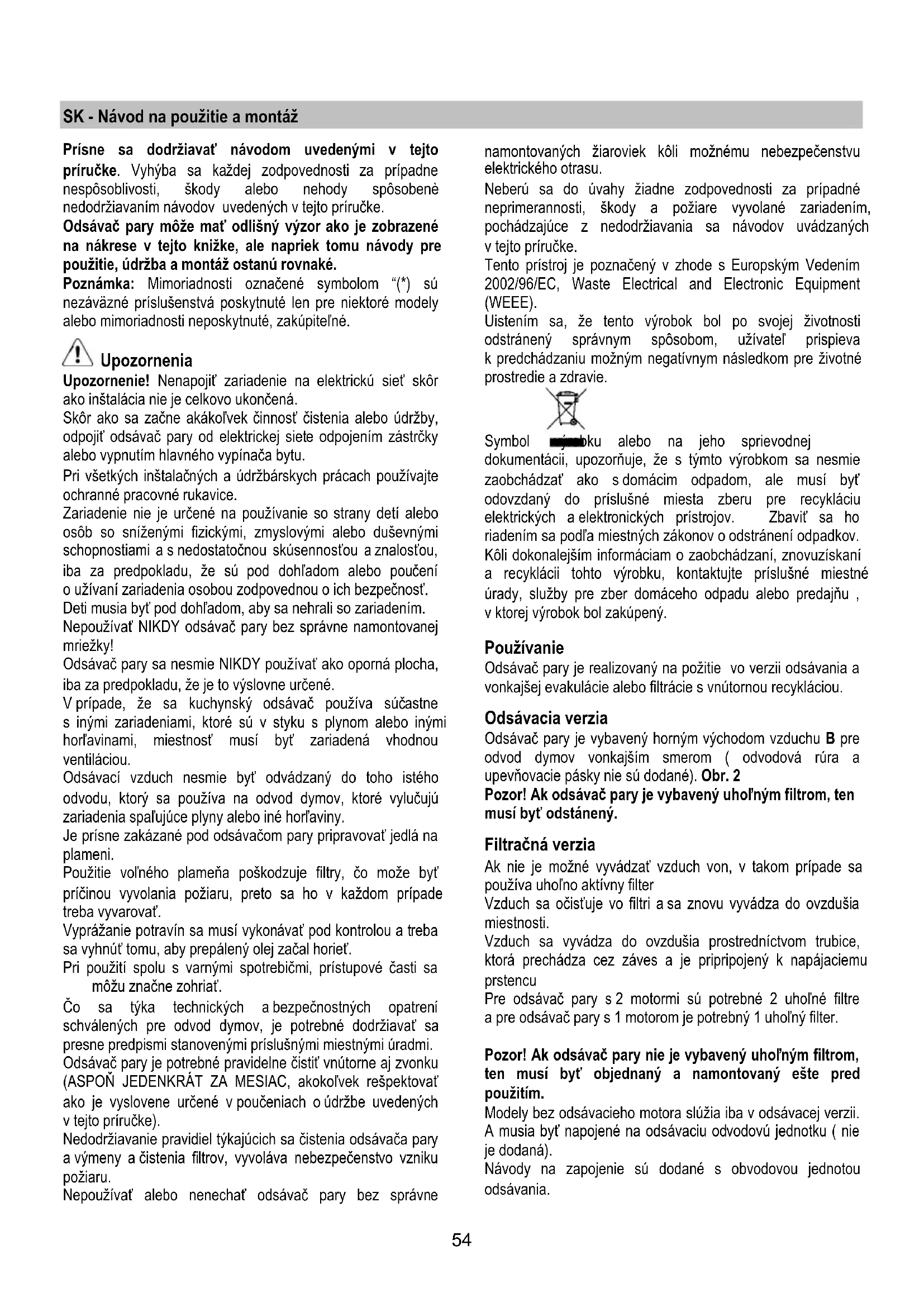 Poté co jste ho vyčistili, postupujte opačným způsobem k jeho namontování. Tukový filtr Tukový filtr se musí 1 x do mìsíce vyèistit . Je možné jej èistit ruènì jemným mycím prostøedkem nebo v kuchyòské myèce pøi nejnižší teplotì a kratším programu. Demontáž tukového filtru je znázorněna - zatlačte na západku filtru. Obr. 9 Filtr s aktivním uhlíkem (jen u filtrační verze) Tento filtr pohlcuje nepříjemné pachy vznikající při vaření. Pro digestoř s 2 motry jsou zapotřebí 2 filtry s uhlíkem a 1 filtr s uhlíkem pro digestoř s 1 motorem. Saturace filtru s uhlíkem nastane po více či méně dlouhém užití, tj. závisí na typu kuchyně a pravidelném čištění filtru proti mastnotám. V každém případě je nutné nahradit patronu maximálně jednou za 4 měsíce. NEMŮŽE být umýván či regenerován. Obr. 10 Umístěte filtr s uhlíkem jako kryt ochranné mřížky motorového rotoru a pak otočte hlavní rukojeť filtru P ve směru hodinových ručiček. K odmontování otočte hlavní rukojeť filtru P ve směru proti hodinovým ručičkám. Výměna žárovek Obr. 11 Odpojte přístroj z elektrické sítě. Pozor! Dříve než se doktnete svítidel si ověřte že vychladla. Přístup do úložného prostoru svítidla: vyjměte stropní svítidlo malým plochým šroubovákem či podobným nástrojem, použitým jako páka. Vyměňte poškozené svítidlo. Podle toho jaký model vlastníte: Používejte oválná svítidla max. 40 (E14) anebo halogenová svítidla max 20W (G4 12V) Uzavřete opět stropní svítidlo (upevnění na západku). Jestliže osvětlení nefunguje, dříve než zavoláte servis si ověřte, zda jste správně nasadili žárovky do uložení.54 SK - Návod na použitie a montáž Prísne sa dodržiavať návodom uvedenými v tejto príručke. Vyhýba sa každej zodpovednosti za prípadne nespôsoblivosti, škody alebo nehody spôsobenè nedodržiavaním návodov uvedených v tejto príručke. Odsávač pary môže mať odlišný výzor ako je zobrazené na nákrese v tejto knižke, ale napriek tomu návody pre použitie, údržba a montáž ostanú rovnaké. Poznámka: Mimoriadnosti označené symbolom “(*) sú nezáväzné príslušenstvá poskytnuté len pre niektoré modely alebo mimoriadnosti neposkytnuté, zakúpiteľné. Upozornenia Upozornenie! Nenapojiť zariadenie na elektrickú sieť skôr ako inštalácia nie je celkovo ukončená. Skôr ako sa začne akákoľvek činnosť čistenia alebo údržby, odpojiť odsávač pary od elektrickej siete odpojením zástrčky alebo vypnutím hlavného vypínača bytu. Pri všetkých inštalačných a údržbárskych prácach používajte ochranné pracovné rukavice. Zariadenie nie je určené na používanie so strany detí alebo osôb so sníženými fizickými, zmyslovými alebo duševnými schopnostiami a s nedostatočnou skúsennosťou a znalosťou, iba za predpokladu, že sú pod dohľadom alebo poučení o užívaní zariadenia osobou zodpovednou o ich bezpečnosť. Deti musia byť pod dohľadom, aby sa nehrali so zariadením. Nepoužívať NIKDY odsávač pary bez správne namontovanej mriežky! Odsávač pary sa nesmie NIKDY používať ako oporná plocha, iba za predpokladu, že je to výslovne určené. V prípade, že sa kuchynský odsávač používa súčastne s inými zariadeniami, ktoré sú v styku s plynom alebo inými horľavinami, miestnosť musí byť zariadená vhodnou ventiláciou. Odsávací vzduch nesmie byť odvádzaný do toho istého odvodu, ktorý sa používa na odvod dymov, ktoré vylučujú zariadenia spaľujúce plyny alebo iné horľaviny. Je prísne zakázané pod odsávačom pary pripravovať jedlá na plameni. Použitie voľného plameňa poškodzuje filtry, čo može byť príčinou vyvolania požiaru, preto sa ho v každom prípade treba vyvarovať. Vyprážanie potravín sa musí vykonávať pod kontrolou a treba sa vyhnúť tomu, aby prepálený olej začal horieť. Pri použití spolu s varnými spotrebičmi, prístupové časti sa môžu značne zohriať. Čo sa týka technických a bezpečnostných opatrení schválených pre odvod dymov, je potrebné dodržiavať sa presne predpismi stanovenými príslušnými miestnými úradmi. Odsávač pary je potrebné pravidelne čistiť vnútorne aj zvonku (ASPOŇ JEDENKRÁT ZA MESIAC, akokoľvek rešpektovať ako je vyslovene určené v poučeniach o údržbe uvedených v tejto príručke). Nedodržiavanie pravidiel týkajúcich sa čistenia odsávača pary a výmeny a čistenia filtrov, vyvoláva nebezpečenstvo vzniku požiaru. Nepoužívať alebo nenechať odsávač pary bez správne namontovaných žiaroviek kôli možnému nebezpečenstvu elektrického otrasu. Neberú sa do úvahy žiadne zodpovednosti za prípadné neprimerannosti, škody a požiare vyvolané zariadením, pochádzajúce z nedodržiavania sa návodov uvádzaných v tejto príručke. Tento prístroj je poznačený v zhode s Europským Vedením 2002/96/EC, Waste Electrical and Electronic Equipment (WEEE). Uistením sa, že tento výrobok bol po svojej životnosti odstránený správnym spôsobom, užívateľ prispieva k predchádzaniu možným negatívnym následkom pre životné prostredie a zdravie. Symbol výrobku alebo na jeho sprievodnej dokumentácii, upozorňuje, že s týmto výrobkom sa nesmie zaobchádzať ako s domácim odpadom, ale musí byť odovzdaný do príslušné miesta zberu pre recykláciu elektrických a elektronických prístrojov. Zbaviť sa ho riadením sa podľa miestných zákonov o odstránení odpadkov. Kôli dokonalejším informáciam o zaobchádzaní, znovuzískaní a recyklácii tohto výrobku, kontaktujte príslušné miestné úrady, služby pre zber domáceho odpadu alebo predajňu , v ktorej výrobok bol zakúpený. Používanie Odsávač pary je realizovaný na požitie vo verzii odsávania a vonkajšej evakulácie alebo filtrácie s vnútornou recykláciou. O