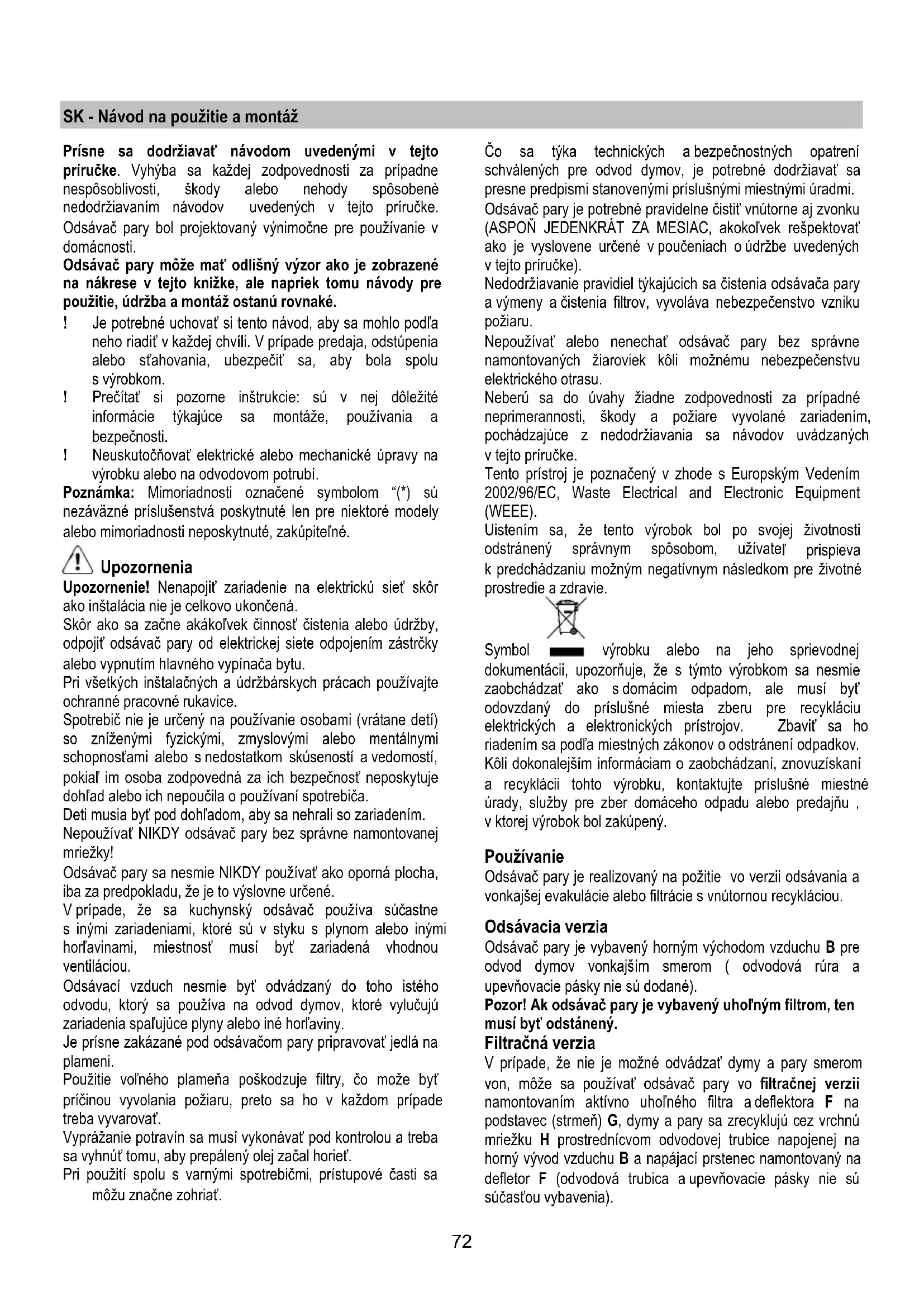 V priade, ze nie je mozné odvadzat dmy a pary smerom von, moze sa pouzivat odsavac pary vo filtračnej verzii namontovanim aktivno uholného filtra a deflektora F na podstavec (strmen) G, dmy a pary sa zrecyklujć cez vrchnu mriežku H prostrednicvom odvodovej trabice napojenej na horný vývod vzduchu B a napajaci prstenec namontovany na defletor F (odvodová trabica aupevnovacie pásky nie su sučastou vyavenia).