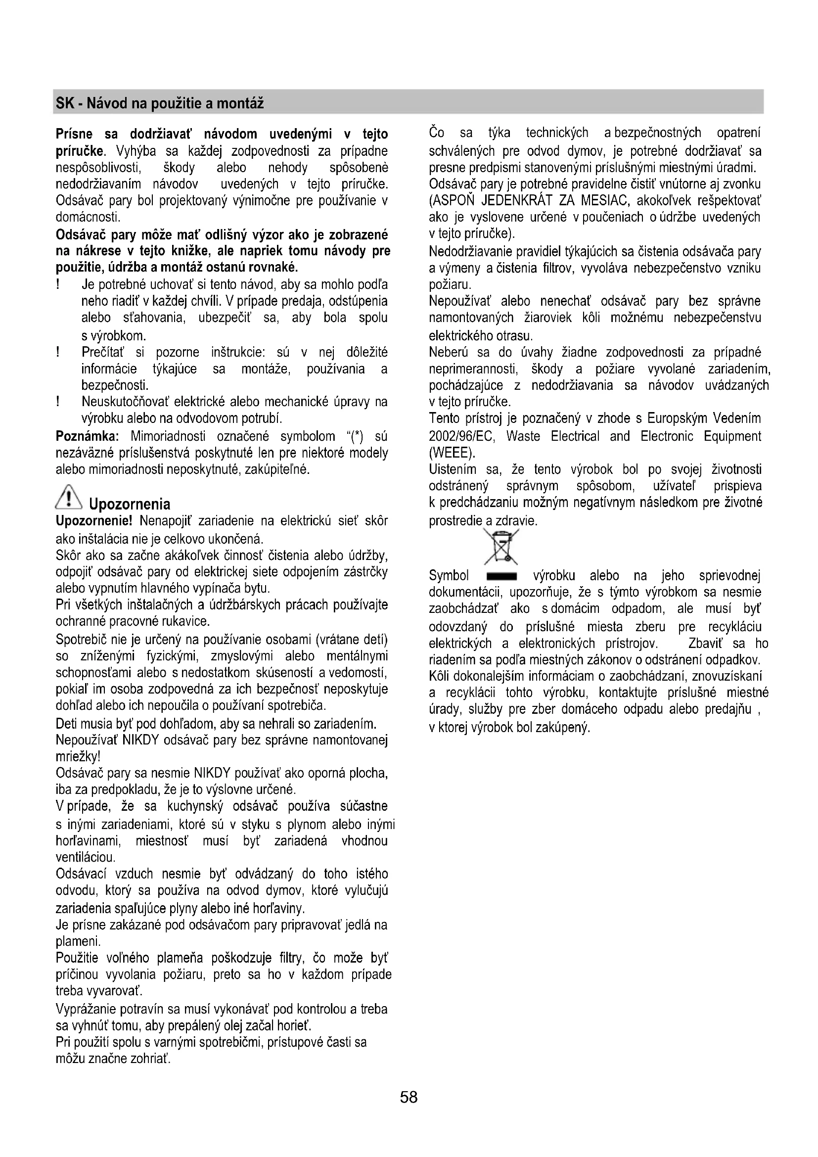 - A lépések fordított sorrendben való elvégzésével szerelje be az új izzót. Amennyiben a világítás nem működik, mielőtt a műszaki szervizszolgálatot hívná ,ellenőrizze, hogy az égők helyesen illeszkednek-e a foglalatba.58 SK - Návod na použitie a montáž Prísne sa dodržiavať návodom uvedenými v tejto príručke. Vyhýba sa každej zodpovednosti za prípadne nespôsoblivosti, škody alebo nehody spôsobenè nedodržiavaním návodov uvedených v tejto príručke. Odsávač pary bol projektovaný výnimočne pre používanie v domácnosti. Odsávač pary môže mať odlišný výzor ako je zobrazené na nákrese v tejto knižke, ale napriek tomu návody pre použitie, údržba a montáž ostanú rovnaké. ! Je potrebné uchovať si tento návod, aby sa mohlo podľa neho riadiť v každej chvíli. V prípade predaja, odstúpenia alebo sťahovania, ubezpečiť sa, aby bola spolu s výrobkom. ! Prečítať si pozorne inštrukcie: sú v nej dôležité informácie týkajúce sa montáže, používania a bezpečnosti. ! Neuskutočňovať elektrické alebo mechanické úpravy na výrobku alebo na odvodovom potrubí. Poznámka: Mimoriadnosti označené symbolom “(*) sú nezáväzné príslušenstvá poskytnuté len pre niektoré modely alebo mimoriadnosti neposkytnuté, zakúpiteľné. Upozornenia Upozornenie! Nenapojiť zariadenie na elektrickú sieť skôr ako inštalácia nie je celkovo ukončená. Skôr ako sa začne akákoľvek činnosť čistenia alebo údržby, odpojiť odsávač pary od elektrickej siete odpojením zástrčky alebo vypnutím hlavného vypínača bytu. Pri všetkých inštalačných a údržbárskych prácach používajte ochranné pracovné rukavice. Spotrebič nie je určený na používanie osobami (vrátane detí) so zníženými fyzickými, zmyslovými alebo mentálnymi schopnosťami alebo s nedostatkom skúseností a vedomostí, pokiaľ im osoba zodpovedná za ich bezpečnosť neposkytuje dohľad alebo ich nepoučila o používaní spotrebiča. Deti musia byť pod dohľadom, aby sa nehrali so zariadením. Nepoužívať NIKDY odsávač pary bez správne namontovanej mriežky! Odsávač pary sa nesmie NIKDY používať ako oporná plocha, iba za predpokladu, že je to výslovne určené. V prípade, že sa kuchynský odsávač používa súčastne s inými zariadeniami, ktoré sú v styku s plynom alebo inými horľavinami, miestnosť musí byť zariadená vhodnou ventiláciou. Odsávací vzduch nesmie byť odvádzaný do toho istého odvodu, ktorý sa používa na odvod dymov, ktoré vylučujú zariadenia spaľujúce plyny alebo iné horľaviny. Je prísne zakázané pod odsávačom pary pripravovať jedlá na plameni. Použitie voľného plameňa poškodzuje filtry, čo može byť príčinou vyvolania požiaru, preto sa ho v každom prípade treba vyvarovať. Vyprážanie potravín sa musí vykonávať pod kontrolou a treba sa vyhnúť tomu, aby prepálený olej začal horieť. Pri použití spolu s varnými spotrebičmi, prístupové časti sa môžu značne zohriať. Čo sa týka technických a bezpečnostných opatrení schválených pre odvod dymov, je potrebné dodržiavať sa presne predpismi stanovenými príslušnými miestnými úradmi. Odsávač pary je potrebné pravidelne čistiť vnútorne aj zvonku (ASPOŇ JEDENKRÁT ZA MESIAC, akokoľvek rešpektovať ako je vyslovene určené v poučeniach o údržbe uvedených v tejto príručke). Nedodržiavanie pravidiel týkajúcich sa čistenia odsávača pary a výmeny a čistenia filtrov, vyvoláva nebezpečenstvo vzniku požiaru. Nepoužívať alebo nenechať odsávač pary bez správne namontovaných žiaroviek kôli možnému nebezpečenstvu elektrického otrasu. Neberú sa do úvahy žiadne zodpovednosti za prípadné neprimerannosti, škody a požiare vyvolané zariadením, pochádzajúce z nedodržiavania sa návodov uvádzaných v tejto príručke. Tento prístroj je poznačený v zhode s Europským Vedením 2002/96/EC, Waste Electrical and Electronic Equipment (WEEE). Uistením sa, že tento výrobok bol po svojej životnosti odstránený správnym spôsobom, užívateľ prispieva k predchádzaniu možným negatívnym následkom pre životné prostredie a zdravie. Symbol výrobku alebo na jeho sprievodnej dokumentácii, upozorňuje, že s týmto výrobkom sa nesmie zaobchádzať ako s domácim odpadom, ale musí byť odovzdaný do príslušné miesta zberu pre recykláciu elektrických a elektronických prístrojov. Zbaviť sa ho riadením sa podľa miestných zákonov o odstránení odpadkov. Kôli dokonalejším informáciam o zaobchádzaní, znovuzískaní a recyklácii tohto výrobku, kontaktujte príslušné miestné úrady, služby pre zber domáceho odpadu alebo predajňu , v ktorej výrobok bol zakúpený.59 Používanie Odsávač pary je realizovaný na požitie vo verzii odsávania a vonkajšej evakulácie alebo filtrácie s vnútornou recykláciou. Odsávacia verzia Výpary sú vypúšťané von prostredníctvom výfukového potrubia upevneného na spojovacej prírube. Priemer výfukového potrubia sa musí zhodovaž s priemerom spojovacieho prstenca. Upozornenie! Evakuačné potrubie nie je dodané, musí byť zakúpené. Na vodorovnej (horizontálnej) časti, potrubie musí mať mierny náklon smerom nahor (približne 10°), aby sa vzduch mohol ľahšie odvádzal smerom von. Ak odsávač pary je vybavený uhlíkovými filtrami, tak tie musia byť odstránené. Napojiť odsávač pary o odvodové trubice a otvory pre múry s rovnakým priemerom ako vývod vzduchu (spojovacia príruba). Použitie odvodových trubíc a otvorov do steny s menším priemerom má za následok zníženie odsávadsej výkonnosti e drastické zvýšenie hlučnosti. V tejto zásluhe sa vyhýba každej zodpovednosti. ! Použiť potrubie dlhé, ktoré je minimálne nevyhnutné. ! Používať potrubie s najmenším možným počtom ohnutím (maximálny uhol ohnutia: 90°). ! Vyhnúť sa d