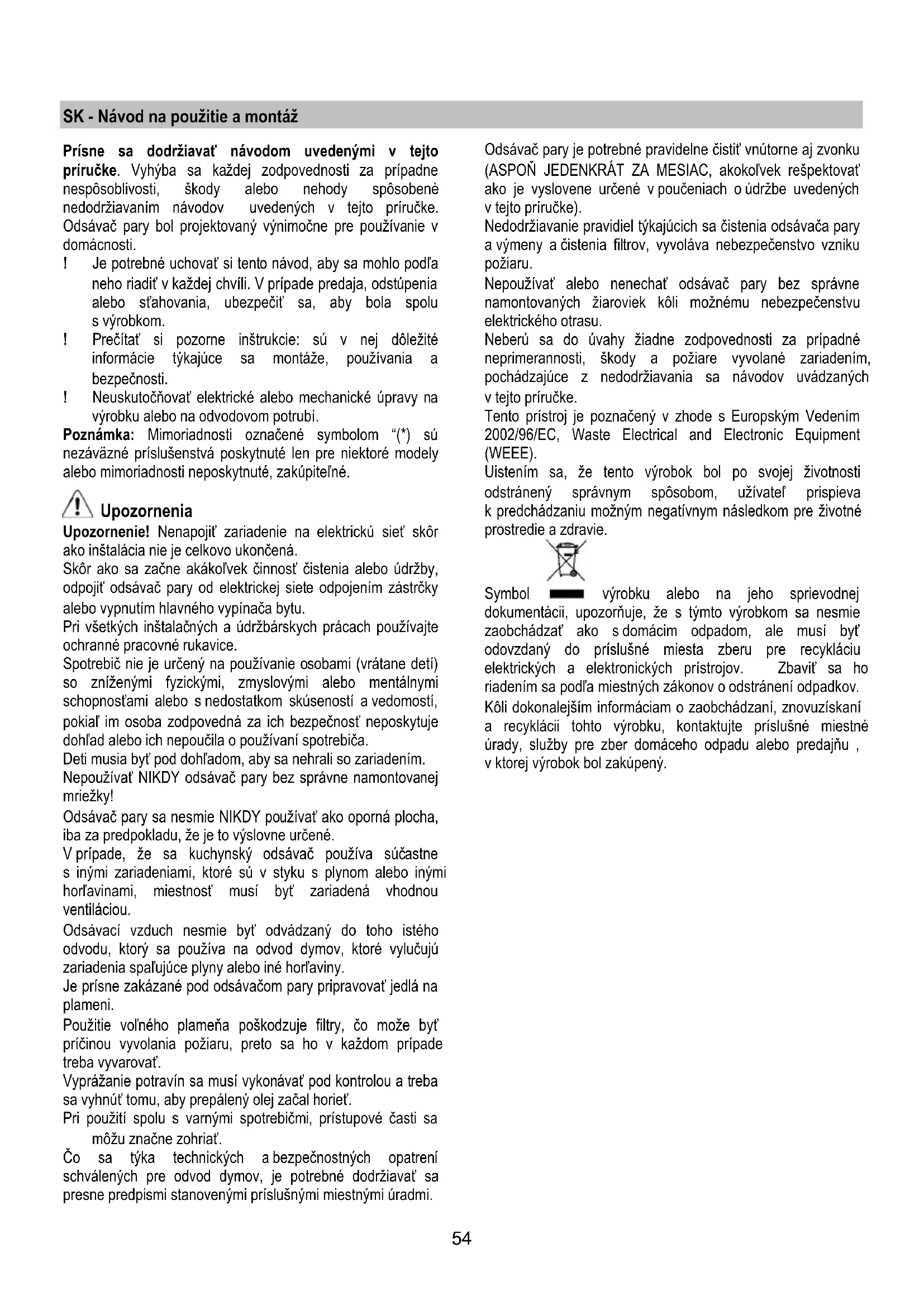 Amennyiben a világítás nem működik, mielőtt a műszaki szervizszolgálatot hívná ,ellenőrizze, hogy az égők helyesen illeszkednek-e a foglalatba.54 SK - Návod na použitie a montáž Prísne sa dodržiavať návodom uvedenými v tejto príručke. Vyhýba sa každej zodpovednosti za prípadne nespôsoblivosti, škody alebo nehody spôsobenè nedodržiavaním návodov uvedených v tejto príručke. Odsávač pary bol projektovaný výnimočne pre používanie v domácnosti. ! Je potrebné uchovať si tento návod, aby sa mohlo podľa neho riadiť v každej chvíli. V prípade predaja, odstúpenia alebo sťahovania, ubezpečiť sa, aby bola spolu s výrobkom. ! Prečítať si pozorne inštrukcie: sú v nej dôležité informácie týkajúce sa montáže, používania a bezpečnosti. ! Neuskutočňovať elektrické alebo mechanické úpravy na výrobku alebo na odvodovom potrubí. Poznámka: Mimoriadnosti označené symbolom “(*) sú nezáväzné príslušenstvá poskytnuté len pre niektoré modely alebo mimoriadnosti neposkytnuté, zakúpiteľné. Upozornenia Upozornenie! Nenapojiť zariadenie na elektrickú sieť skôr ako inštalácia nie je celkovo ukončená. Skôr ako sa začne akákoľvek činnosť čistenia alebo údržby, odpojiť odsávač pary od elektrickej siete odpojením zástrčky alebo vypnutím hlavného vypínača bytu. Pri všetkých inštalačných a údržbárskych prácach používajte ochranné pracovné rukavice. Spotrebič nie je určený na používanie osobami (vrátane detí) so zníženými fyzickými, zmyslovými alebo mentálnymi schopnosťami alebo s nedostatkom skúseností a vedomostí, pokiaľ im osoba zodpovedná za ich bezpečnosť neposkytuje dohľad alebo ich nepoučila o používaní spotrebiča. Deti musia byť pod dohľadom, aby sa nehrali so zariadením. Nepoužívať NIKDY odsávač pary bez správne namontovanej mriežky! Odsávač pary sa nesmie NIKDY používať ako oporná plocha, iba za predpokladu, že je to výslovne určené. V prípade, že sa kuchynský odsávač používa súčastne s inými zariadeniami, ktoré sú v styku s plynom alebo inými horľavinami, miestnosť musí byť zariadená vhodnou ventiláciou. Odsávací vzduch nesmie byť odvádzaný do toho istého odvodu, ktorý sa používa na odvod dymov, ktoré vylučujú zariadenia spaľujúce plyny alebo iné horľaviny. Je prísne zakázané pod odsávačom pary pripravovať jedlá na plameni. Použitie voľného plameňa poškodzuje filtry, čo može byť príčinou vyvolania požiaru, preto sa ho v každom prípade treba vyvarovať. Vyprážanie potravín sa musí vykonávať pod kontrolou a treba sa vyhnúť tomu, aby prepálený olej začal horieť. Pri použití spolu s varnými spotrebičmi, prístupové časti sa môžu značne zohriať. Čo sa týka technických a bezpečnostných opatrení schválených pre odvod dymov, je potrebné dodržiavať sa presne predpismi stanovenými príslušnými miestnými úradmi. Odsávač pary je potrebné pravidelne čistiť vnútorne aj zvonku (ASPOŇ JEDENKRÁT ZA MESIAC, akokoľvek rešpektovať ako je vyslovene určené v poučeniach o údržbe uvedených v tejto príručke). Nedodržiavanie pravidiel týkajúcich sa čistenia odsávača pary a výmeny a čistenia filtrov, vyvoláva nebezpečenstvo vzniku požiaru. Nepoužívať alebo nenechať odsávač pary bez správne namontovaných žiaroviek kôli možnému nebezpečenstvu elektrického otrasu. Neberú sa do úvahy žiadne zodpovednosti za prípadné neprimerannosti, škody a požiare vyvolané zariadením, pochádzajúce z nedodržiavania sa návodov uvádzaných v tejto príručke. Tento prístroj je poznačený v zhode s Europským Vedením 2002/96/EC, Waste Electrical and Electronic Equipment (WEEE). Uistením sa, že tento výrobok bol po svojej životnosti odstránený správnym spôsobom, užívateľ prispieva k predchádzaniu možným negatívnym následkom pre životné prostredie a zdravie. Symbol výrobku alebo na jeho sprievodnej dokumentácii, upozorňuje, že s týmto výrobkom sa nesmie zaobchádzať ako s domácim odpadom, ale musí byť odovzdaný do príslušné miesta zberu pre recykláciu elektrických a elektronických prístrojov. Zbaviť sa ho riadením sa podľa miestných zákonov o odstránení odpadkov. Kôli dokonalejším informáciam o zaobchádzaní, znovuzískaní a recyklácii tohto výrobku, kontaktujte príslušné miestné úrady, služby pre zber domáceho odpadu alebo predajňu , v ktorej výrobok bol zakúpený.55 Používanie Odsávač pary je realizovaný na požitie vo verzii odsávania a vonkajšej evakulácie alebo filtrácie s vnútornou recykláciou. Odsávacia verzia Výpary sú vypúšťané von prostredníctvom výfukového potrubia upevneného na spojovacej prírube. Priemer výfukového potrubia sa musí zhodovaž s priemerom spojovacieho prstenca. Upozornenie! Evakuačné potrubie nie je dodané, musí byť zakúpené. Na vodorovnej (horizontálnej) časti, potrubie musí mať mierny náklon smerom nahor (približne 10°), aby sa vzduch mohol ľahšie odvádzal smerom von. Ak odsávač pary je vybavený uhlíkovými filtrami, tak tie musia byť odstránené. Napojiť odsávač pary o odvodové trubice a otvory pre múry s rovnakým priemerom ako vývod vzduchu (spojovacia príruba). Použitie odvodových trubíc a otvorov do steny s menším priemerom má za následok zníženie odsávadsej výkonnosti e drastické zvýšenie hlučnosti. V tejto zásluhe sa vyhýba každej zodpovednosti. ! Použiť potrubie dlhé, ktoré je minimálne nevyhnutné. ! Používať potrubie s najmenším možným počtom ohnutím (maximálny uhol ohnutia: 90°). ! Vyhnúť sa drastickým zmenám sekcií potrubia. ! Používať potrubie s čím viac hladkou vnútornou stranou. ! Materiál potrubia musí byť zákonom schválený (v norme). Filtračná verzia Nasatý vzduch sa pred znovu privodením do miestnosti najprv odmastí