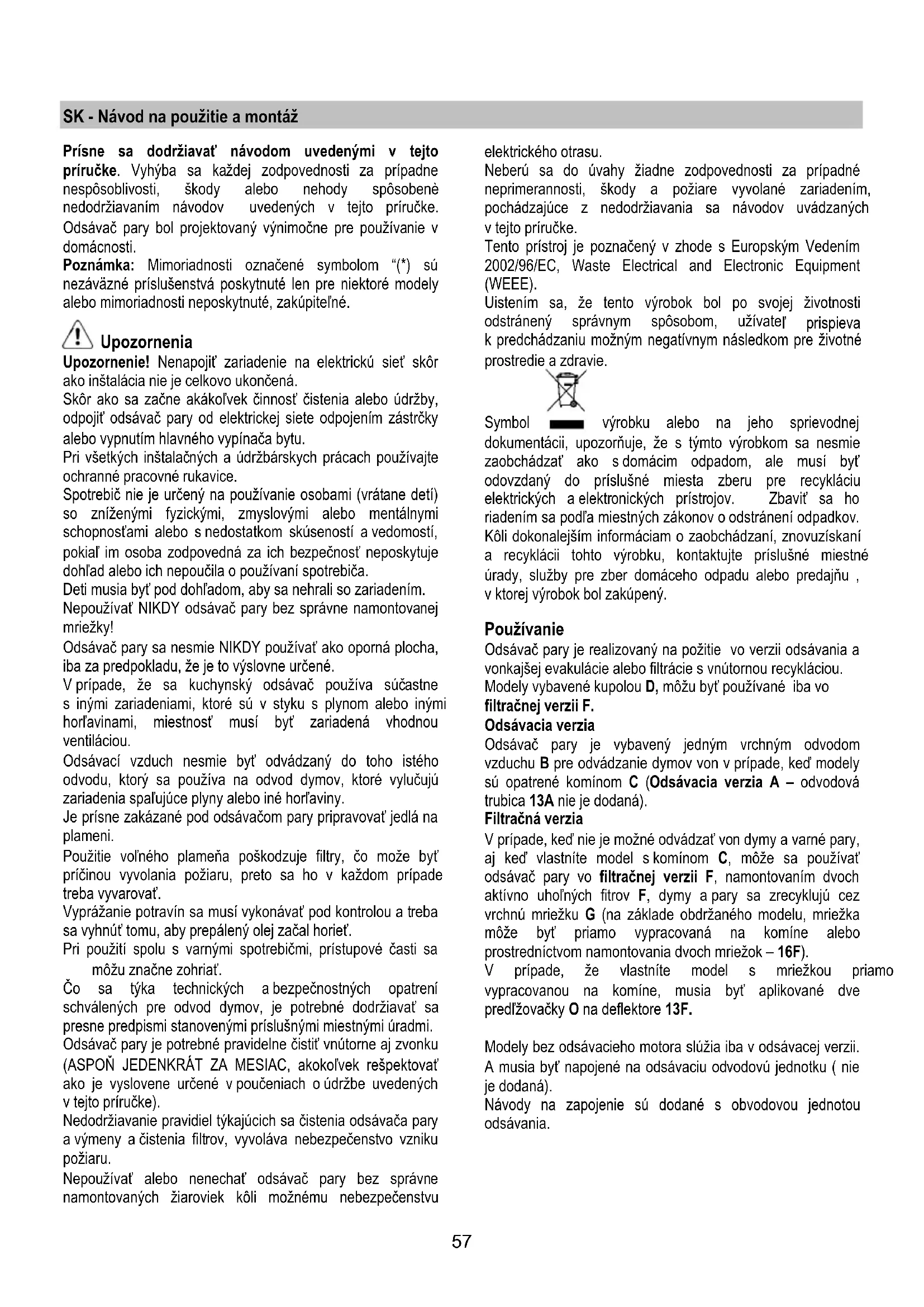 V prípade možných nepravidelností počas činnosti odsávača pary, skôr ako sa obrátite na odborný servis, odpojte zariadenie aspoň na 5 secúnd z elektrickej siete vytiahnutím zástrčky a znovu sa napojte. V prípade, že by nepravidelnosti v činnosti zotrvávali, obrátiť sa na servis odbornej asistencie. Údržba Skôr ako začína ktorákoľvek údržba, odpojiť odsávač pary z elektrického vedenia. Čistenie Odsávač pary sa pravidelne čistí zvonku aj zvnútra (aspoň rovnako častým opakovaním ako sa vykonáva údržba filtrov tuku). Na čistenie používať vlhké plátno s neutrálnymi tekutými čistiacími prostriedkami. Vyhnúť sa používania prostriedkov obsahujúcich škrabacie látky. NEPOUŽÍVAŤ ALKOHOL! Upozornenie: Nedodržanie noriem na čistenie zariadenia a výmenu filtrov predstavuje riziko požiaru. Odporúča sa preto dodržiavať uvedené pokyny. Odmieta sa akákoľvek zodpovednosť za prípadné škody na motore, požiare vyvolané nesprávnou údržbou alebo nedodržaním vyššie uvedených upozornení.