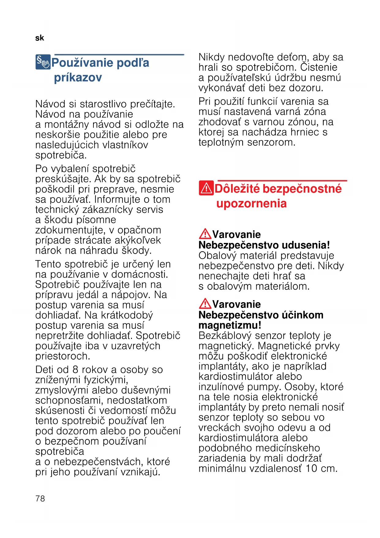 8 Používanie podľa príkazov Použí vani e podľ a pr í k azov Návod si starostlivo prečítajte. Návod na používanie a montážny návod si odložte na neskoršie použitie alebo pre nasledujúcich vlastníkov spotrebiča. Po vybalení spotrebič preskúšajte. Ak by sa spotrebič poškodil pri preprave, nesmie sa používať. Informujte o tom technický zákaznícky servis a škodu písomne zdokumentujte, v opačnom prípade strácate akýkoľvek nárok na náhradu škody. Tento spotrebič je určený len na používanie v domácnosti. Spotrebič používajte len na prípravu jedál a nápojov. Na postup varenia sa musí dohliadať. Na krátkodobý postup varenia sa musí nepretržite dohliadať. Spotrebič používajte iba v uzavretých priestoroch. Deti od 8 rokov a osoby so zníženými fyzickými, zmyslovými alebo duševnými schopnosťami, nedostatkom skúsenosti či vedomostí môžu tento spotrebič používať len pod dozorom alebo po poučení o bezpečnom používaní spotrebiča a o nebezpečenstvách, ktoré pri jeho používaní vznikajú. Nikdy nedovoľte deťom, aby sa hrali so spotrebičom. Čistenie a používateľskú údržbu nesmú vykonávať deti bez dozoru. Pri použití funkcií varenia sa musí nastavená varná zóna zhodovať s varnou zónou, na ktorej sa nachádza hrniec s teplotným senzorom. ( Dôležité bezpečnostné upozornenia Dô l e ž i t é bezpeč nost né upozor neni a :Varovanie Nebezpečenstvo udusenia! Obalový materiál predstavuje nebezpečenstvo pre deti. Nikdy nenechajte deti hrať sa s obalovým materiálom. :Varovanie Nebezpečenstvo účinkom magnetizmu! Bezkáblový senzor teploty je magnetický. Magnetické prvky môžu poškodiť elektronické implantáty, ako je napríklad kardiostimulátor alebo inzulínové pumpy. Osoby, ktoré na tele nosia elektronické implantáty by preto nemali nosiť senzor teploty so sebou vo vreckách svojho odevu a od kardiostimulátora alebo podobného medicínskeho zariadenia by mali dodržať minimálnu vzdialenosť 10 cm.sk