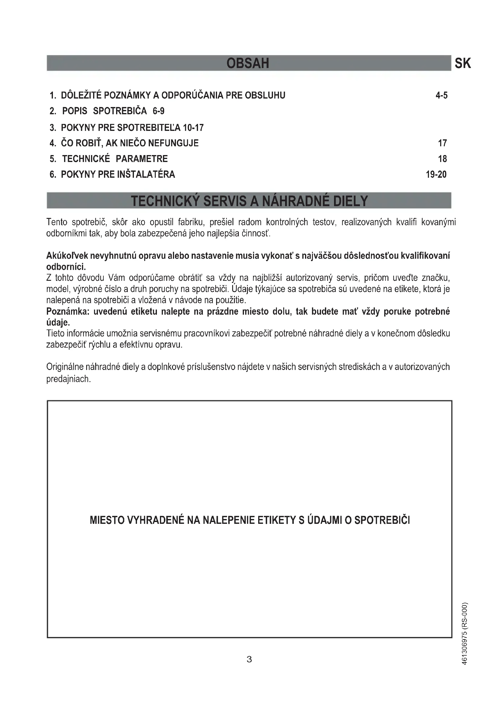 Tento spotrebič, skôr ako opustil fabriku, prešiel radom kontrolných testov, realizovaných kvalifi kovanými odborníkmi tak, aby bola zabezpečená jeho najlepšia činnosť. Akúkoľvek nevyhnutnú opravu alebo nastavenie musia vykonať s najväčšou dôslednosťou kvalifi kovaní odborníci. Z tohto dôvodu Vám odporúčame obrátiť sa vždy na najbližší autorizovaný servis, pričom uveďte značku, model, výrobné číslo a druh poruchy na spotrebiči. Údaje týkajúce sa spotrebiča sú uvedené na etikete, ktorá je nalepená na spotrebiči a vložená v návode na použitie. Poznámka: uvedenú etiketu nalepte na prázdne miesto dolu, tak budete mať vždy poruke potrebné údaje. Tieto informácie umožnia servisnému pracovníkovi zabezpečiť potrebné náhradné diely a v konečnom dôsledku zabezpečiť rýchlu a efektívnu opravu. Originálne náhradné diely a doplnkové príslušenstvo nájdete v našich servisných strediskách a v autorizovaných predajniach. MIESTO VYHRADENÉ NA NALEPENIE ETIKETY S ÚDAJMI O SPOTREBIČI OBSAH461306975 (RS-000)