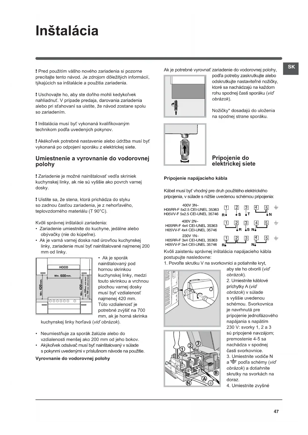 ! Pred použitím vášho nového zariadenia si pozorne precítajte tento návod. Je zdrojom dôležitých informácií, týkajúcich sa inštalácie a použitia zariadenia. ! Uschovajte ho, aby ste doňho mohli kedykoľvek nahliadnuť. V prípade predaja, darovania zariadenia alebo pri sťahovaní sa uistite, že návod zostane spolu so zariadením. ! Inštalácia musí byť vykonaná kvalifi kovaným technikom podľa uvedených pokynov. ! Akékoľvek potrebné nastavenie alebo údržba musí byť vykonaná po odpojení sporáku z elektrickej siete. Umiestnenie a vyrovnanie do vodorovnej polohy ! Zariadenie je možné nainštalovať vedľa skriniek kuchynskej linky, ak nie sú vyššie ako povrch varnej dosky. ! Uistite sa, že stena, ktorá prichádza do styku so zadnou časťou zariadenia, je z nehorľavého, teplovzdorného materiálu (T 90°C). Kvôli správnej inštalácii zariadenia: