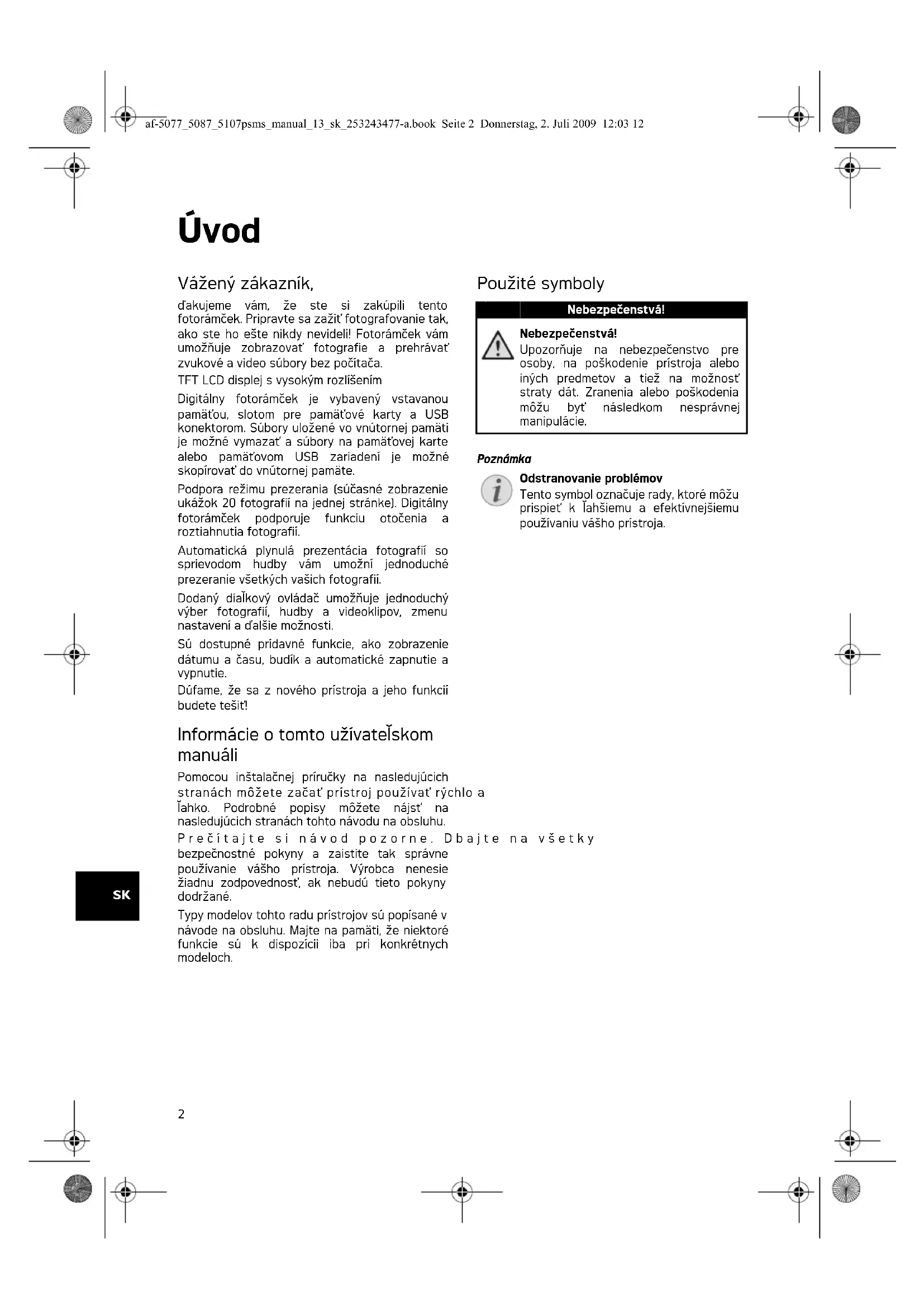 Upozronije na nebezpečenstvo pre osoby, na poskodenie pristroja alebo inych predmetov a tiež na možnost straty dát. Zranenia alebo poskodenia možu byt' následkom nesprávnéj manipulácie.