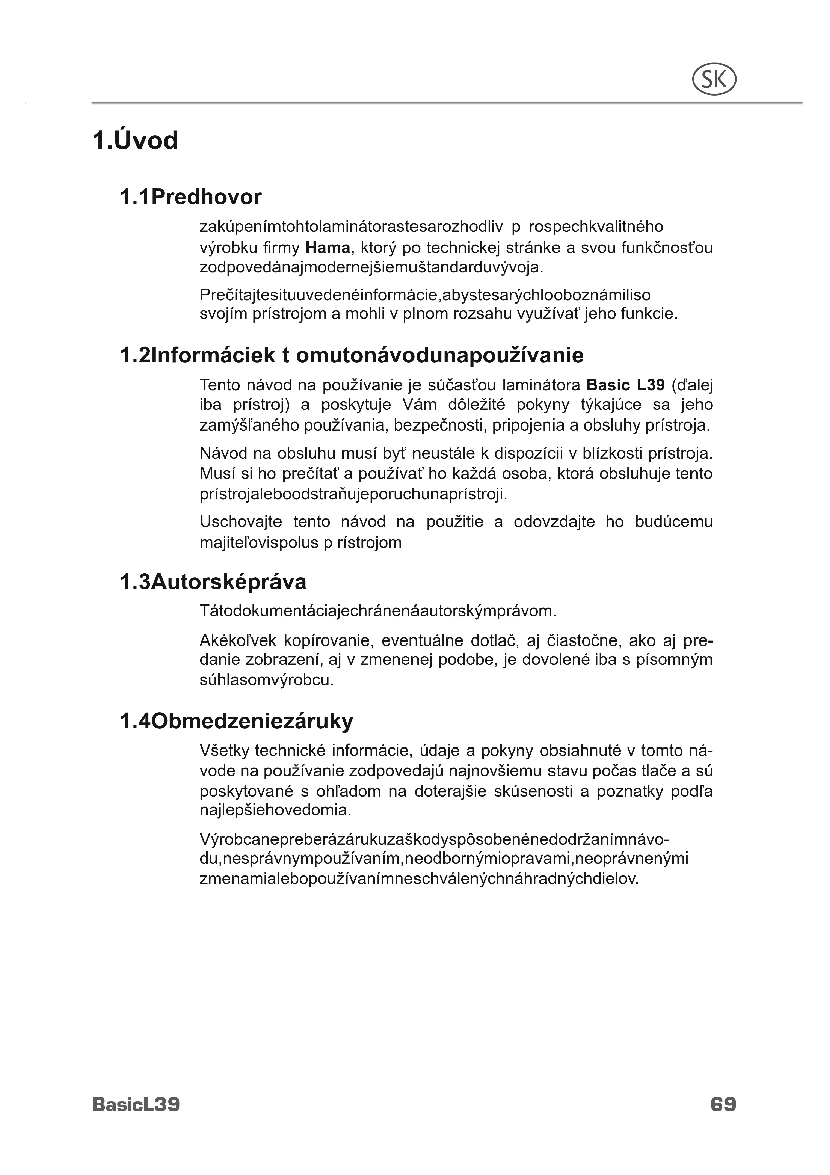 Tento návod na pouÍívanie je súFasou laminátora Basic L39 (ûalej iba prístroj) aposkytuje Vám dôleÍité pokyny týkajúce sa jeho zamýšÒaného pouÍívania, bezpeFnosti, pripojenia aobsluhyprístroja. Návod na obsluhu musí by neustále kdispozícii vblízkosti prístroja. Musí si ho preFíta apouÍíva ho kaÍdá osoba, ktorá obsluhuje tento prístroj alebo odstraËuje poruchu na prístroji. Uschovajte tento návod na pouÍitie aodovzdajte ho budúcemu majiteÒovi spolu sprístrojom