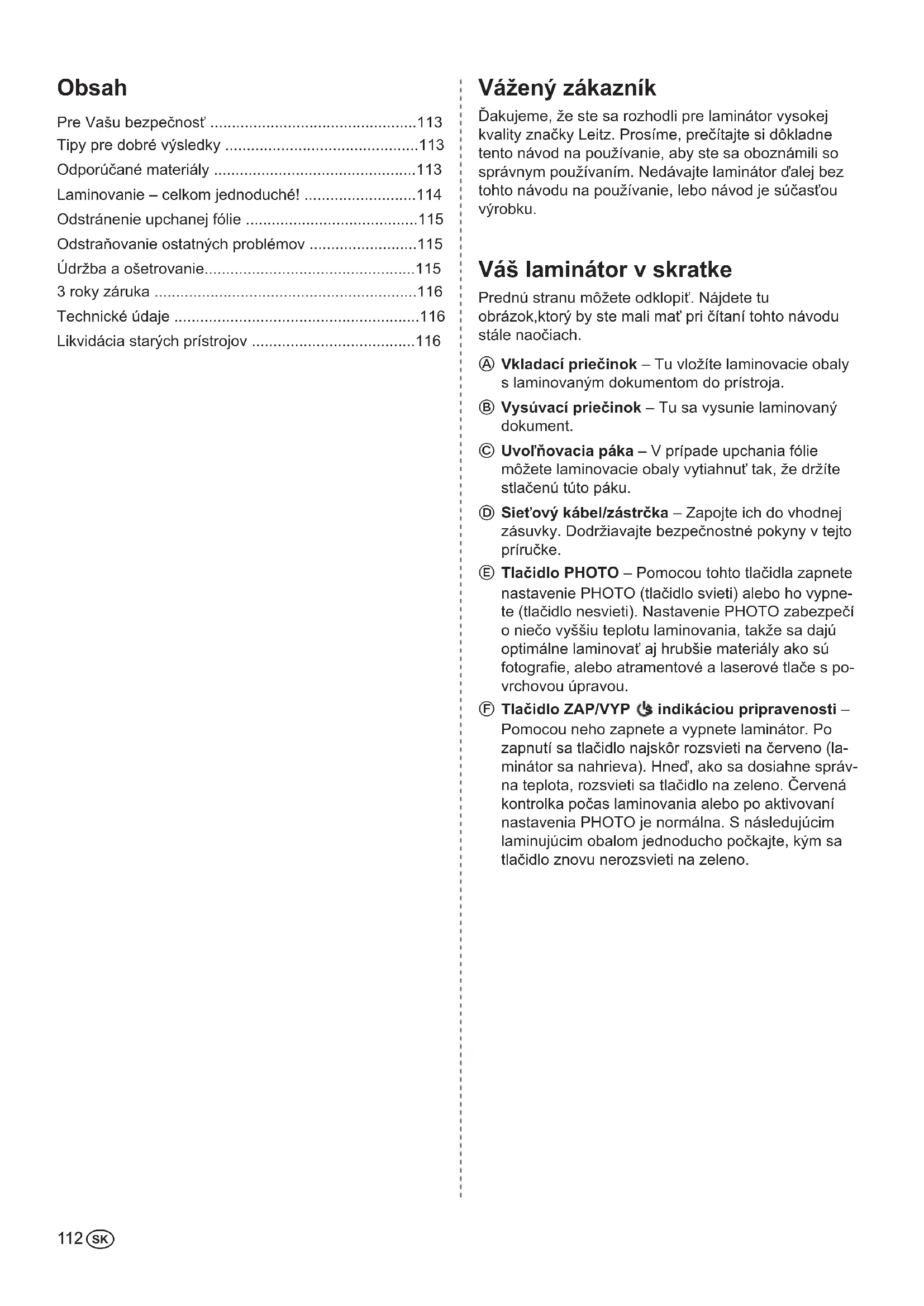 - Tlačidlo ZAP/VYP s indikáciou pripravenosti – Pomocou neho zapnete a vypnete laminátor. Po zapnutí sa tlačidlo najskôr rozsvieti na červeno (la- minátor sa nahrieva). Hneď, ako sa dosiahne správ- na teplota, rozsvieti sa tlačidlo na zeleno. Červená kontrolka počas laminovania alebo po aktivovaní nastavenia PHOTO je normálna. S následujúcim laminujúcim obalom jednoducho počkajte, kým sa tlačidlo znovu nerozsvieti na zeleno. Obsah Pre Vašu bezpečnosť p. 113