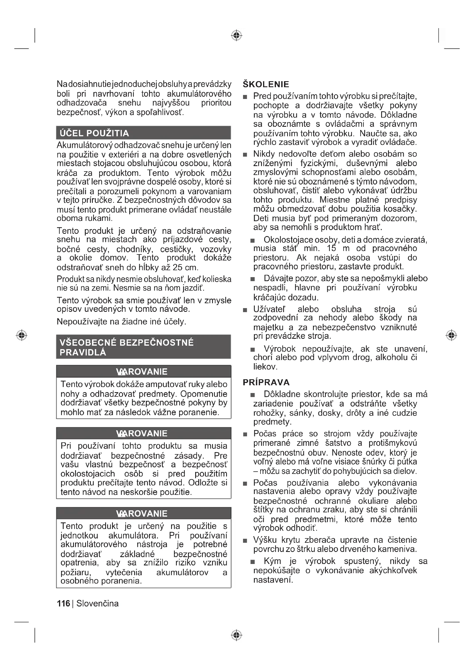 Akumulátorový odhadzovač snehu je určený len na použitie v exteriéri a na dobre osvetlených miestach stojacou obsluhujúcou osobou, ktorá kráča za produktom. Tento výrobok môžu používať len svojprávne dospelé osoby, ktoré si prečítali a porozumeli pokynom a varovaniam v tejto príručke. Z bezpečnostných dôvodov sa musí tento produkt primerane ovládať neustále oboma rukami.