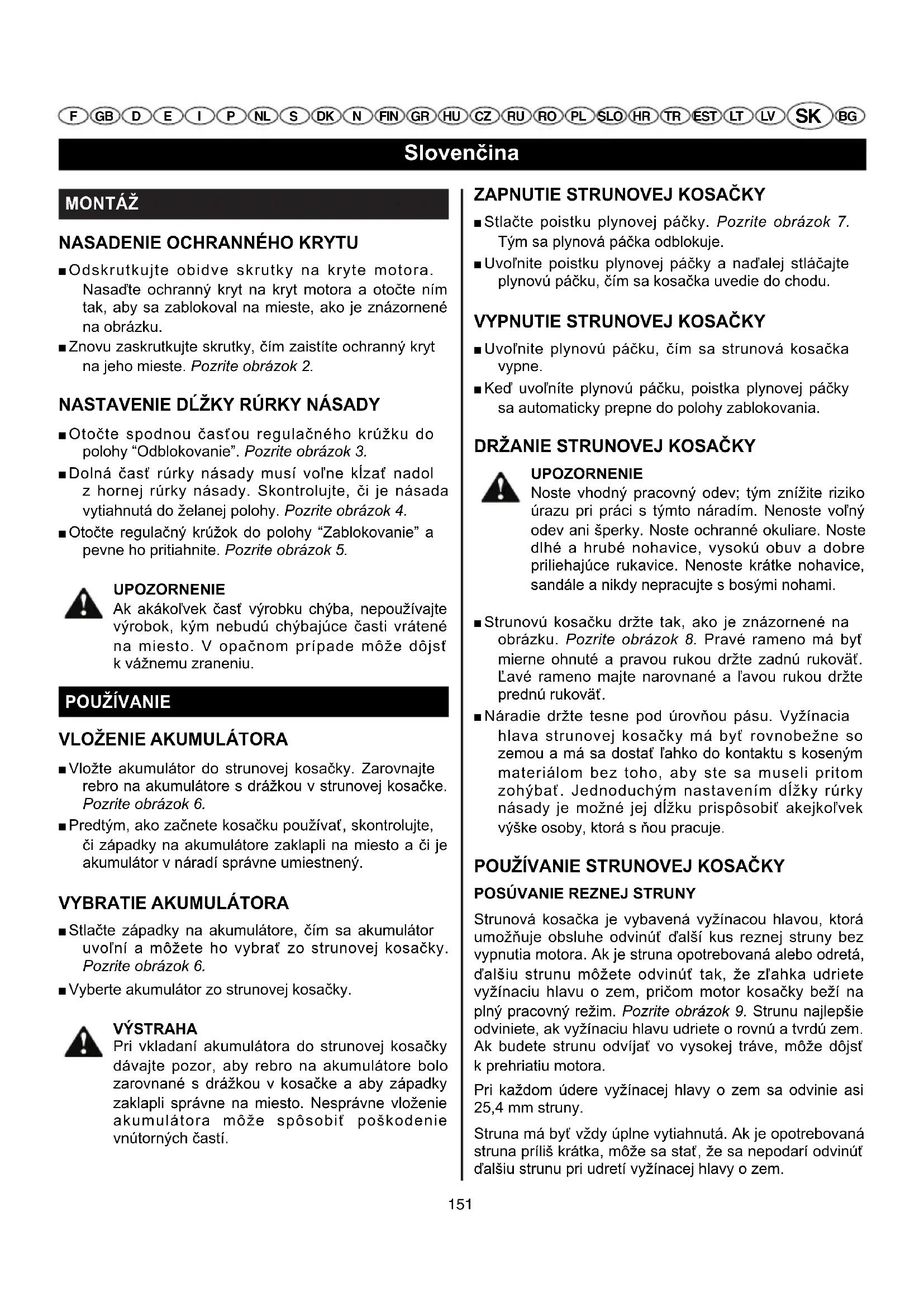 Bud'te stale ostražiti a venujte pozornost tomu, co robite. Pri použivani strunovej kosačky sa riad'te zdravym Rozumom.