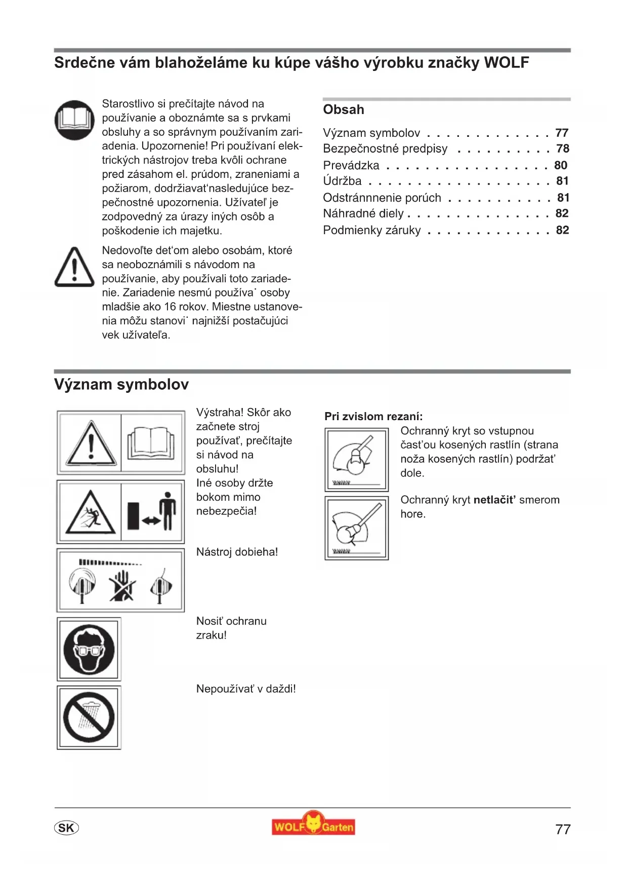 Vždy vyčkajte na zastavenie rezného nastroja. - Udržbárske a Čistiace práce na kosačke, ako aj demon-tovanie ochrannych privkov, poprípade výmenu stru-novej kazety, je dovolné vykonávat'len pri zastanom pohybe elektromotora a pri vypnutí rezného nastroja a len vtedy, kěd ste predtým vytnhni za-strčku zo siete elektrického prúdu. Používajte len originálne strunové kazety WOLF, respektujte montážnePokyny!