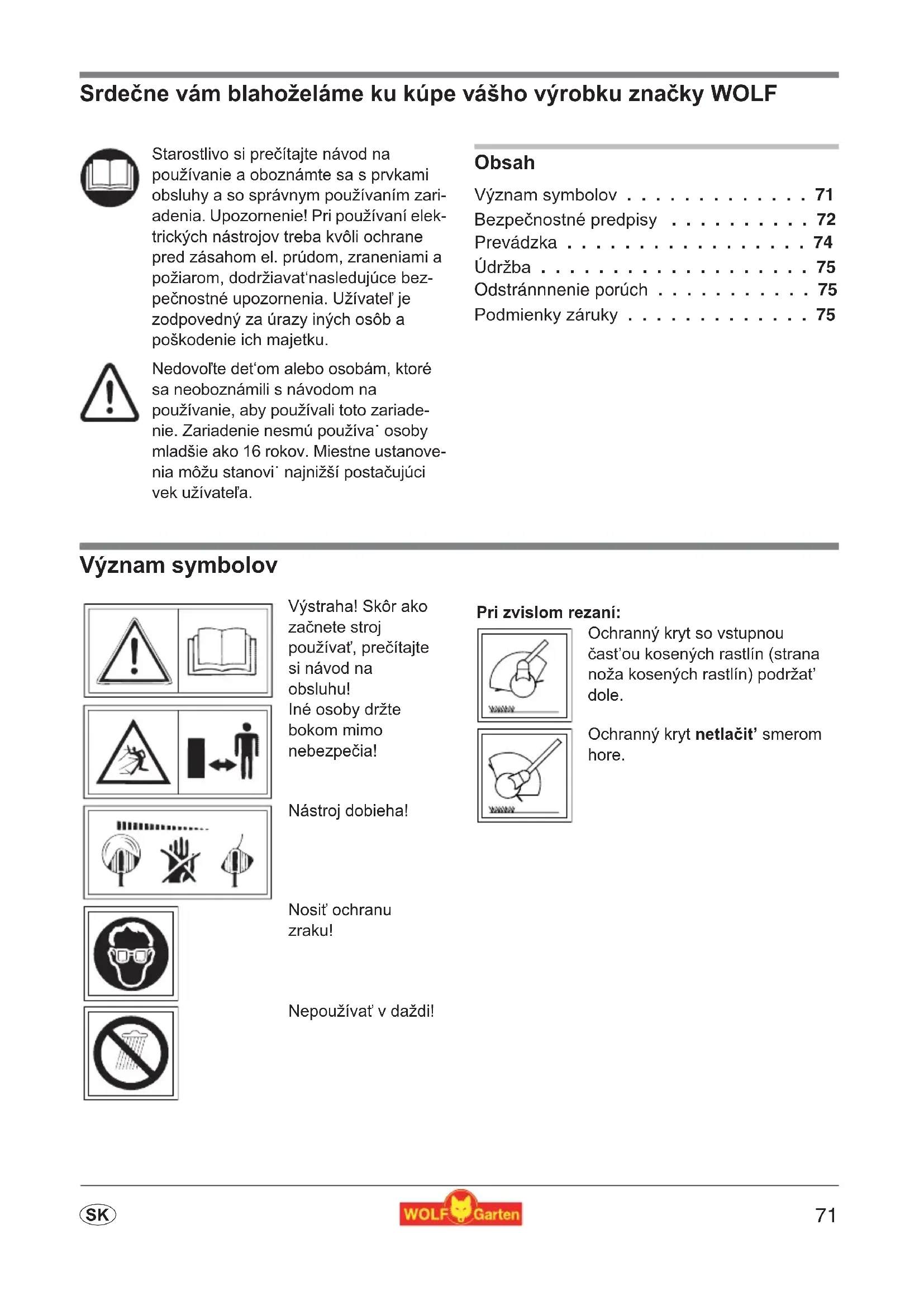 - sSrde>ne vám blahoželáme ku kúpe vášho výrobku zna>ky WOLF Obsah Význam symbolov p. 71