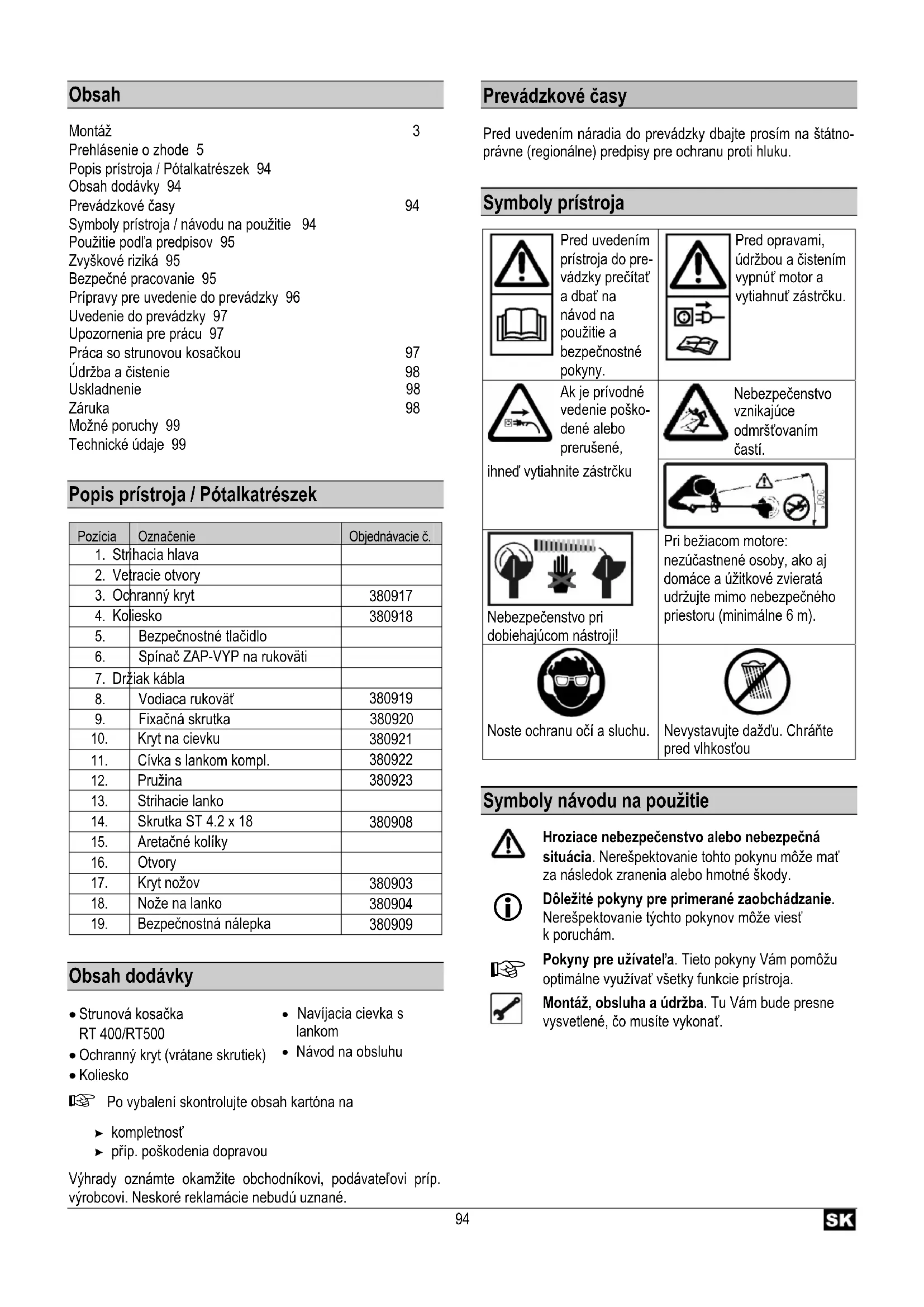 - Samovolné zmeny na strunovej kosačke vylucujú zodpovednost vyrobcu za vzniknuté škody akéhokol'vek druhu.