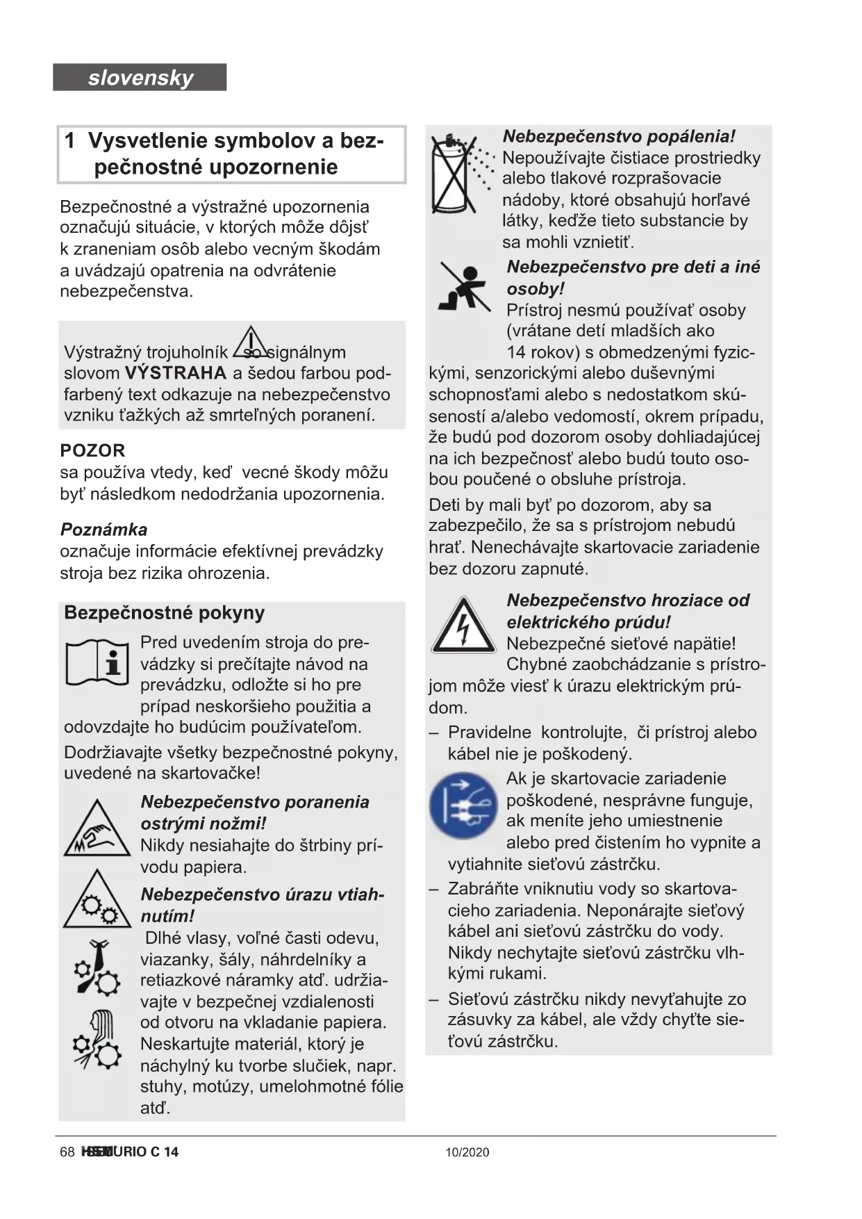 Hmotnost 4,0 kg 4,5 kg Výkon při max. počtu listů 160 W (EU) / 145 W (US) Emise hluku (běh naprázdno/plné zatížení) 55-60 dB(A) / 60-65 dB(A) 55-60 dB(A) / 65-70 dB(A) Pracovní šířka 225 mm Rychlost řezu 44 mm/s Napájení 220-240 V / 50/60 Hz 110-130 V / 60 Hz Spotřeba energie v pohotovostním režimu < 2 Wh Provozní doba až 15 min Okolní podmínky za provozu: Teplota Relativní vlhkost vzduchu Nadmořská výška -10 °C až +25 °C max. 90 %, bez tvorby kondenzátu max. 2000 m Rozměry Š x H x V (mm) 366 x 258 x 405 Objem odpadní nádoby 20 l Hladina akustického výkonu (LWAd v chodu naprázdno) 65,9 dB česky68 SECURIO C 14 10/2020 1 Vysvetlenie symbolov a bez- pečnostné upozornenie Bezpečnostné a výstražné upozornenia označujú situácie, v ktorých môže dôjsť k zraneniam osôb alebo vecným škodám a uvádzajú opatrenia na odvrátenie nebezpečenstva. Poznámka označuje informácie efektívnej prevádzky stroja bez rizika ohrozenia. Výstražný trojuholník so signálnym slovom VÝSTRAHA a šedou farbou pod- farbený text odkazuje na nebezpečenstvo vzniku ťažkých až smrteľných poranení. POZOR sa používa vtedy, keď vecné škody môžu byť následkom nedodržania upozornenia. Bezpečnostné pokyny Pred uvedením stroja do pre- vádzky si prečítajte návod na prevádzku, odložte si ho pre prípad neskoršieho použitia a odovzdajte ho budúcim používateľom. Dodržiavajte všetky bezpečnostné pokyny, uvedené na skartovačke! Nebezpečenstvo poranenia ostrými nožmi! Nikdy nesiahajte do štrbiny prí- vodu papiera. Nebezpečenstvo úrazu vtiah- nutím! Dlhé vlasy, voľné časti odevu, viazanky, šály, náhrdelníky a retiazkové náramky atď. udržia- vajte v bezpečnej vzdialenosti od otvoru na vkladanie papiera. Neskartujte materiál, ktorý je náchylný ku tvorbe slučiek, napr. stuhy, motúzy, umelohmotné fólie atď. Nebezpečenstvo popálenia! Nepoužívajte čistiace prostriedky alebo tlakové rozprašovacie nádoby, ktoré obsahujú horľavé látky, keďže tieto substancie by sa mohli vznietiť. Nebezpečenstvo pre deti a iné osoby! Prístroj nesmú používať osoby (vrátane detí mladších ako 14 rokov) s obmedzenými fyzic- kými, senzorickými alebo duševnými schopnosťami alebo s nedostatkom skú- seností a/alebo vedomostí, okrem prípadu, že budú pod dozorom osoby dohliadajúcej na ich bezpečnosť alebo budú touto oso- bou poučené o obsluhe prístroja. Deti by mali byť po dozorom, aby sa zabezpečilo, že sa s prístrojom nebudú hrať. Nenechávajte skartovacie zariadenie bez dozoru zapnuté. Nebezpečenstvo hroziace od elektrického prúdu! Nebezpečné sieťové napätie! Chybné zaobchádzanie s prístro- jom môže viesť k úrazu elektrickým prú- dom. – Pravidelne kontrolujte, či prístroj alebo kábel nie je poškodený. Ak je skartovacie zariadenie poškodené, nesprávne funguje, ak meníte jeho umiestnenie alebo pred čistením ho vypnite a vytiahnite sieťovú zástrčku. – Zabráňte vniknutiu vody so skartova- cieho zariadenia. Neponárajte sieťový kábel ani sieťovú zástrčku do vody. Nikdy nechytajte sieťovú zástrčku vlh- kými rukami. – Sieťovú zástrčku nikdy nevyťahujte zo zásuvky za kábel, ale vždy chyťte sie- ťovú zástrčku. slovensky10/2020 SECURIO C 14 69 3 Přehled 4 Obsah dodávky