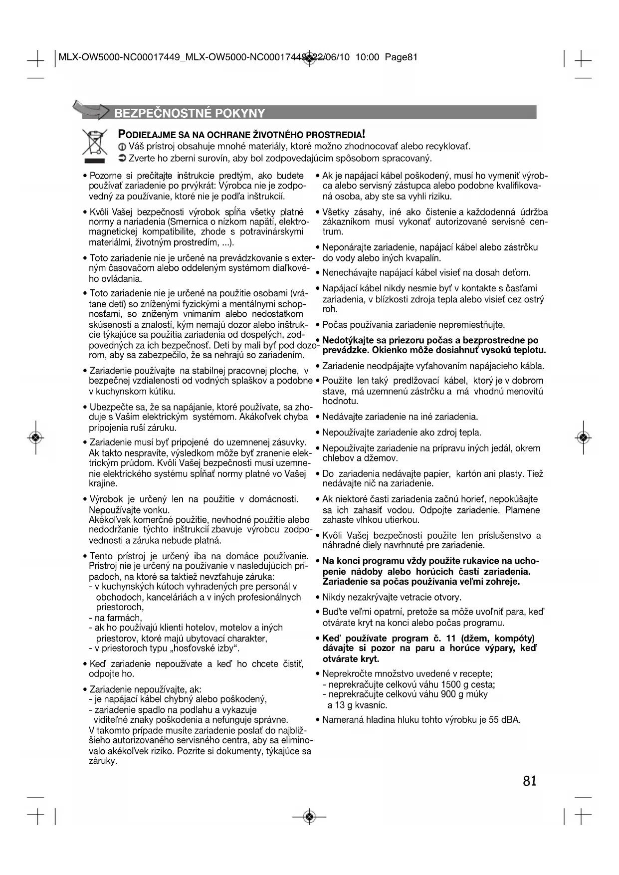 - Nameraná hladina hluku tohto výrobku je 55 dBA. PODIEĽAJME SA NA OCHRANE ŽIVOTNÉHO PROSTREDIA! Váš prístroj obsahuje mnohé materiály, ktoré možno zhodnocovať alebo recyklovať. Zverte ho zberni surovín, aby bol zodpovedajúcim spôsobom spracovaný.