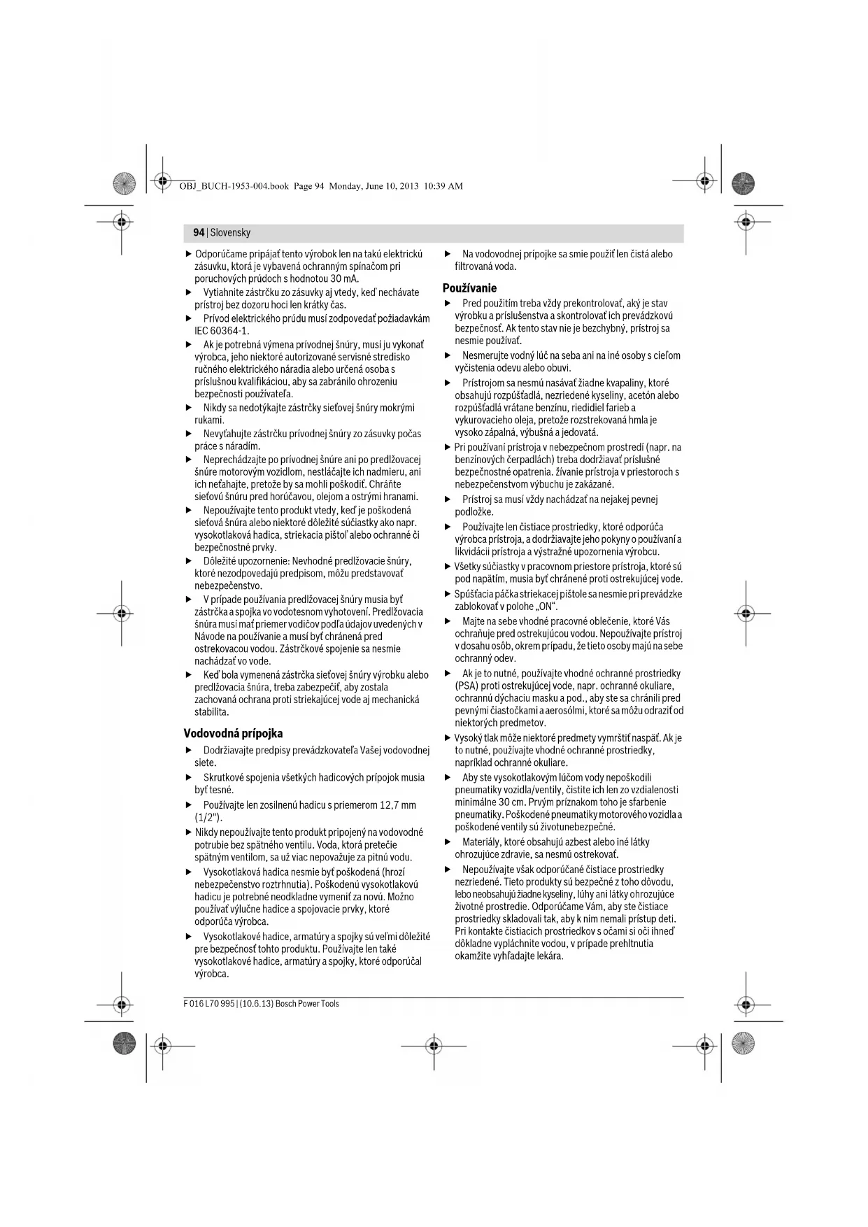 3 600 ... HA7 1.. HA7 2.. Na vlastnú zodpovednosť vyhlasujeme, že tento výrobok, popísaný nižšie v časti „Technické údaje“ sa zhoduje s nasledujúcimi normami alebo normatívnymi dokumentmi: EN 60335 podľa ustanovení smerníc 2011/65/EÚ, 2004/108/ES, 2006/42/ES, 2000/14/ES. 2000/14/ES: Garantovaná hladina akustického výkonu Spôsob hodnotenia konformity podľa prílohy V. dB(A) 99 93 Henk Becker Executive Vice President Engineering Helmut Heinzelmann Head of Product Certification PT/ETM9 Cieľ činnosti Obrázok Obsah dodávky (základná výbava) 1 Rukoväť sklopiť smerom dole 2 Pripojenie nadstavca na striekaciu pištoľ 3 Pripojenie vysokotlakovej hadice/striekacej pištole 4 Nasadenie dýzy 5 Vodovodná prípojka 6 Zapnutie/vypnutie 7 Nastavenie prúdu dýzy 8 Pripojenie fľaše s oplachovacím prostriedkom 9 Vyčistite filter 10 Vyčistite dýzu 11 Uloženie pištole 12 Uloženie pištole/nástavca/dýzy počas používania 13 Vložte hadicu do držiaka hadice 14 Skladovanie 15 Voľba príslušenstva 16 Cieľ činnosti Obrázok OBJ_BUCH-1953-004.book Page 96 Monday, June 10, 2013 10:39 AMSlovensky | 97 Bosch Power Tools F 016 L70 995 | (10.6.13) Uvedenie do prevádzky Pre Vašu bezpečnosť Pozor! Pre údržbou a čistením prístroj vždy vypnite a zástrčku sieťovej šnúry vytiahnite zo zásuvky. To isté platí v prípade, ak je poškodená, narezaná alebo zauzlená prívodná šnúra. Prevádzkové napätie výrobku je 230 V AC (striedavý prúd), 50 Hz (pre krajiny mimo EÚ 220 V, 240 V - podľa konkrétneho vyhotovenia). Používajte len schválené predlžovacie šnúry zodpovedajúce predpisom. Bližšie informácie Vám poskytne Vaše autorizované servisné stredisko. Ak chcete používať pri práci s vysokotlakovým čističom predlžovaciu šnúru, treba dodržať nasledovné priemery elektrických vodičov: – 1,5mm