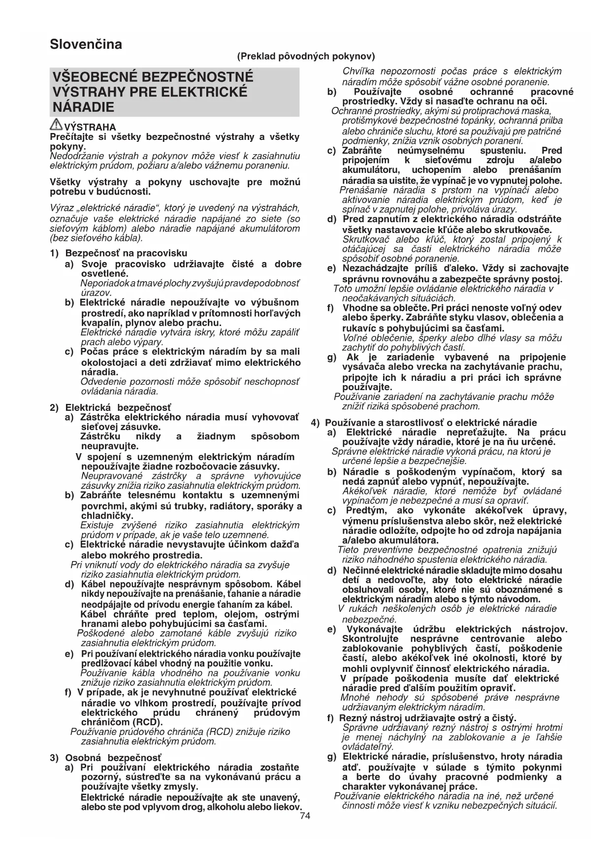NÁRADIE VÝSTRAHA Prečítajte si všetky bezpečnostné výstrahy a všetky pokyny. Nedodržanie výstrah a pokynov môže viesť k zasiahnutiu elektrickým prúdom, požiaru a/alebo vážnemu poraneniu. Všetky výstrahy a pokyny uschovajte pre možnú potrebu v budúcnosti. Výraz „elektrické náradie“, ktorý je uvedený na výstrahách, označuje vaše elektrické náradie napájané zo siete (so sieťovým káblom) alebo náradie napájané akumulátorom (bez sieťového kábla).