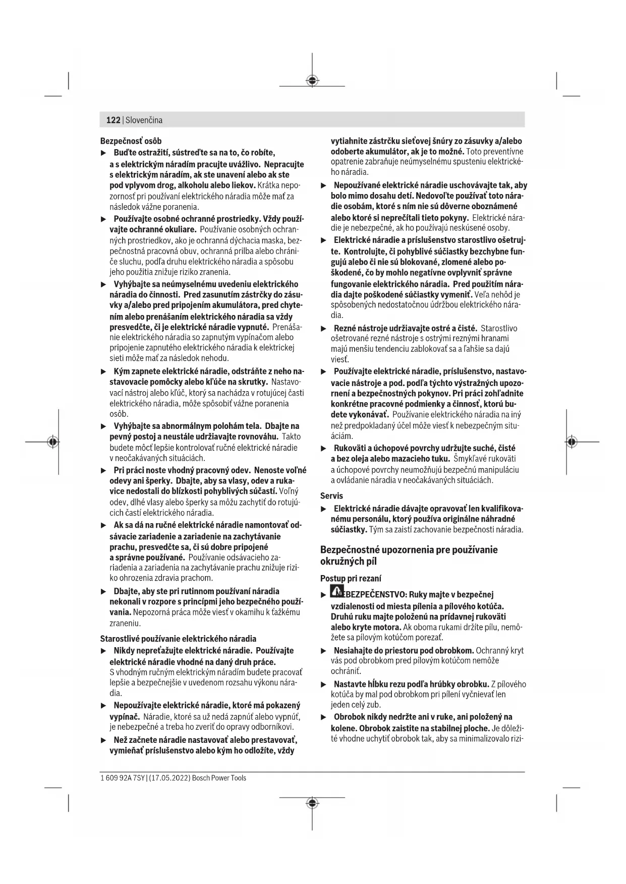 1,5 1,5 1,5 Úroveň vibrácií ahodnota emisií hluku uvedené vtýchto po- kynoch boli namerané podľa normovaného meracieho po- stupu adajú sa použiť na vzájomné porovnávanie elektrické- ho náradia. Hodia sa aj na predbežný odhad emisie vibrácií ahluku. Uvedená úroveň vibrácií ahodnota emisií hluku reprezentuje hlavné spôsoby použitia elektrického náradia. Ak sa však elektrické náradie využíva na iné spôsoby použitia, sodlišný- mi vkladacími nástrojmi alebo pri nedostatočnej údržbe, mô- že sa úroveň vibrácií ahodnota emisií hlukuodlišovať. To môže emisiu vibrácií ahluku počas celého pracovného času výrazne zvýšiť. Na presný odhad emisií vibrácií ahluku by sa mal zohľadniť aj čas, vpriebehu ktorého je náradie vypnuté alebo síce spustené, ale vskutočnosti sa nepoužíva. To môže emisie vibrácií ahluku počas celého pracovného času výrazne zní- žiť. Na ochranu obsluhujúcej osoby pred pôsobením vibrácií ur- čite doplnkové bezpečnostné opatrenia, ako napríklad: údrž- ba elektrického náradia avkladacích nástrojov, udržiavanie správnej teploty rúk, organizácia pracovných procesov. Montáž u Používajte len také pílové listy, ktorých maximálna do- volená rýchlosť je vyššia ako počet voľnobežných ob- rátok vášho elektrického náradia. Bosch Power Tools 1 609 92A 7SY | (17.05.2022)126 | Slovenčina Montáž/výmena pílového kotúča u Pred všetkými prácami na elektrickom náradí vytiah- nite sieťovú zástrčku zo zásuvky. u Pri montáži pílového listu používajte ochranné pracov- né rukavice. Pri kontakte spílovým kotúčom hrozí nebez- pečenstvo poranenia. u Vžiadnom prípade nepoužívajte ako pracovný nástroj brúsne kotúče. u Používajte len také pílové kotúče, ktorých charakte- ristika zodpovedá údajom uvedeným vtomto návode na používanie ana elektrickom náradí aktoré sú tes- tované podľa normy EN847‑1 aprimerane označené. Výber pílového listu Prehľad odporúčaných pílových listov nájdete na konci tohto Návodu na používanie. Demontáž pílového kotúča (pozri obrázok A) Pri výmene pracovného nástroja položte najlepšie ručné elektrické náradie na čelnú stranu telesa motora. – Stlačte aretačné tlačidlo vretena (5) a podržte ho stlačené. u Aretačné tlačidlo vretena (5) aktivujte len pri zastave- nom vretene píly. Inak sa môže elektrické náradie po- škodiť. – Inbusovým kľúčom (4) vyskrutkujte upínaciu skrutku (20) v smere otáčania ➊. – Otočte výkyvný ochranný kryt (12) naspäť a podržte ho. – Odoberte upínaciu prírubu (21) a pílový kotúč (22) z vre- tena píly (24). Montáž pílového kotúča (pozri obrázok A) Pri výmene pracovného nástroja položte najlepšie ručné elektrické náradie na čelnú stranu telesa motora. – Vyčistite pílový kotúč (22) avšetky upevňovacie časti, ktoré treba namontovať. – Otočte výkyvný ochranný kryt (12) naspäť apodržte ho. – Nasaďte pílový kotúč (22) na upínaciu prírubu (23). Smer rezania zubov (smer šípky na pílovom kotúči) ašíp- ka pre smer otáčania na ochrannom kryte (12) sa musia zhodovať. – Nasaďte upínaciu prírubu (21) azaskrutkujte upínaciu skrutku (20) vsmere otáčania ➋. Dbajte ma správnu montážnu polohu unášacej príruby (23) aupínacej príru- by (21). – Stlačte aretačné tlačidlo vretena (5) apodržte ho stlačené. – Inbusovým kľúčom (4) utiahnite upínaciu skrutku (20) vsmere otáčania ➋. Uťahovací moment má byť 6 – 9 Nm, čo zodpovedá dotiahnutiu rukou plus ¼ otáčky. Odsávanie prachu atriesok Prach zniektorých materiálov, napr. znáterov obsahujúcich olovo, zniektorých druhov dreva, minerálov akovu môže byť zdraviu škodlivý. Kontakt stakýmto prachom alebo jeho vdy- chovanie môže vyvolávať alergické reakcie a/alebo ochore- nia dýchacích ciest používateľa alebo osôb, ktoré sa nachá- dzajú vblízkosti. Určité druhy prachu, ako napríklad prach zdubového alebo zbukového dreva, sa považujú za rakovinotvorné, predov- šetkým vspojení sprídavnými látkami, ktoré sa používajú na ošetrenie dreva (chróman, prostriedky na ochranu dreva). Materiál, ktorý obsahuje azbest, smú opracovávať len odbor- níci. – Používajte podľa možnosti také odsávanie prachu, ktoré je pre daný materiál vhodné. – Postarajte sa odobré vetranie svojho pracoviska. – Odporúčame používať masku na ochranu dýchacích ciest sfiltrom triedy P2. Dodržiavajte aj predpisy vašej krajiny týkajúce sa obrába- ných materiálov. u Zabráňte usadzovaniu ahromadeniu prachu na praco- visku. Prach sa môže ľahko zapáliť. Montáž odsávacieho adaptéra (pozri obrázok B) Nasaďte odsávací adaptér (26) na otvor na vyhadzovanie triesok (16) tak, aby zapadol. Zaistite odsávací adaptér (26) dodatočne skrutkou (25). Na odsávací adaptér (26) sa môže pripojiť sacia hadica s priemerom 35 mm. u Odsávací adaptér nesmie byť namontovaný bez pripo- jeného externého odsávania. Inak by sa mohol odsávací kanál upchať. u Na odsávací adaptér sa nesmie pripojiť vrecko na prach. Odsávací systém by sa mohol upchať. Na zabezpečenie optimálneho odsávania treba odsávací adaptér (26) pravidelne čistiť. Externé odsávanie Spojte odsávaciu hadicu svysávačom (príslušenstvo). Pre- hľad vzťahujúci sa na pripojenie na rôzne vysávače nájdete na konci tohto návodu. Elektrické náradie sa môže pripojiť priamo do zásuvky vysá- vača Bosch so zariadením na diaľkové spustenie. Pri spuste- ní ručného elektrického náradia sa vysávač automaticky za- pne. Vysávač musí byť vhodný pre daný druh opracovávaného materiálu. Pri odsávaní materiálov mimoriadne ohrozujúcich zdravie, rakovinotvorných alebo suchých prachov používajte špeciál- ny vysávač. Prev