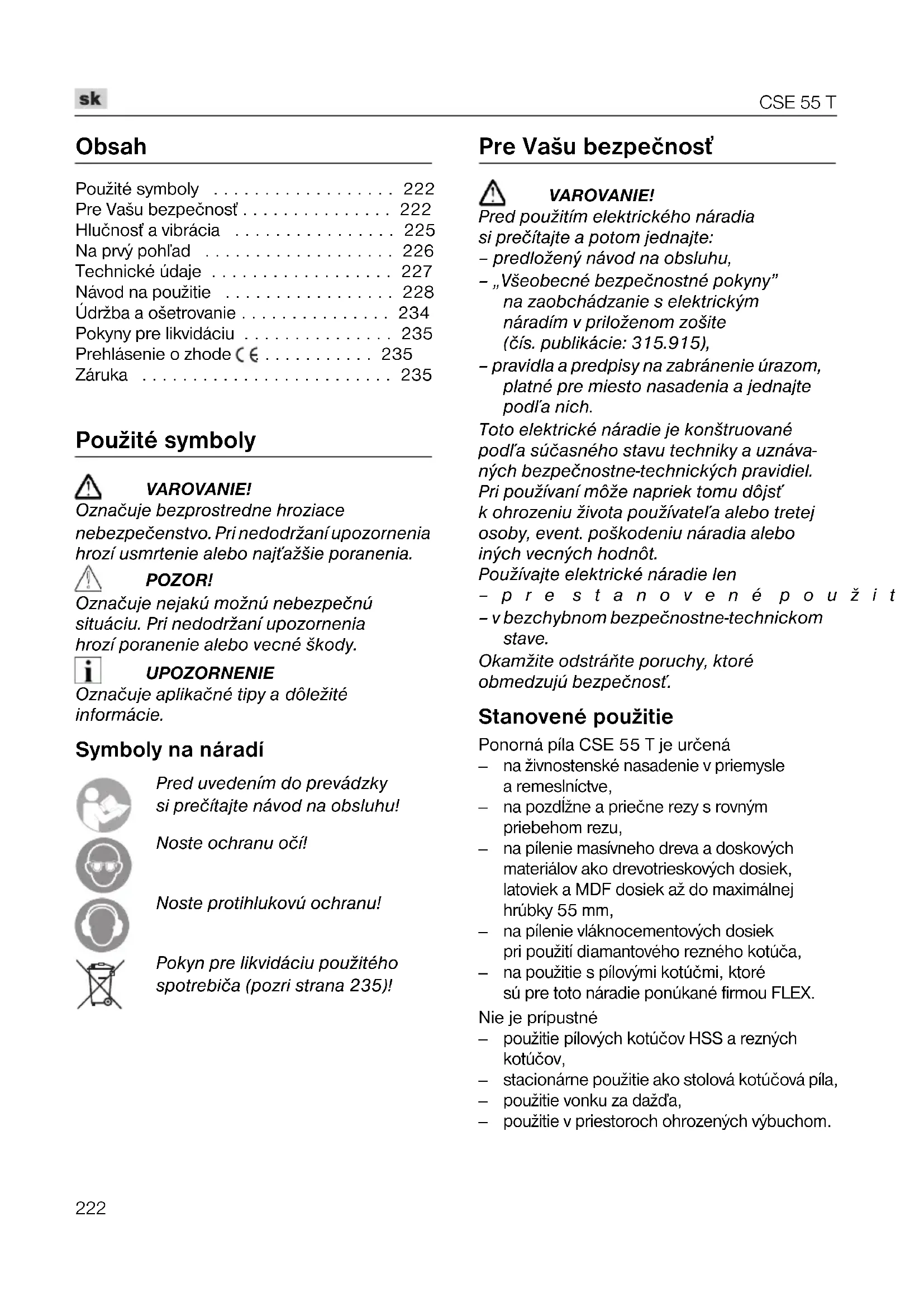 - Záruka Použité symboly VAROVANIE! Označuje bezprostredne hroziace nebezpečenstvo. Pri nedodržaní upozornenia hrozí usmrtenie alebo najˆažšie poranenia. POZOR! Označuje nejakú možnú nebezpečnú situáciu. Pri nedodržaní upozornenia hrozí poranenie alebo vecné škody. UPOZORNENIE Označuje aplikačné tipy a dôležité informácie. Symboly na náradí Pred uvedením do prevádzky si prečítajte návod na obsluhu! Noste ochranu očí! Noste protihlukovú ochranu! Pokyn pre likvidáciu použitého spotrebiča (pozri strana 235)! Pre Vašu bezpečnosˆ VAROVANIE! Pred použitím elektrického náradia si prečítajte a potom jednajte: – predložený návod na obsluhu, – „Všeobecné bezpečnostné pokyny” na zaobchádzanie s elektrickým náradím v priloženom zošite (čís. publikácie: 315.915), – pravidla a predpisy na zabránenie úrazom, platné pre miesto nasadenia a jednajte pod¾a nich. Toto elektrické náradie je konštruované pod¾a súčasného stavu techniky a uznáva- ných bezpečnostne-technických pravidiel. Pri používaní môže napriek tomu dôjsˆ k ohrozeniu života používate¾a alebo tretej osoby, event. poškodeniu náradia alebo iných vecných hodnôt. Používajte elektrické náradie len –pre stanovené použitie, – v bezchybnom bezpečnostne-technickom stave. Okamžite odstráòte poruchy, ktoré obmedzujú bezpečnosˆ. Stanovené použitie Ponorná píla CSE 55 T je určená p. 235