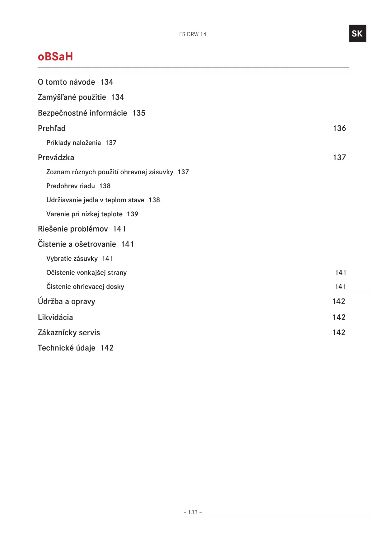 obsah O tomto návode 134 Zamýšľané použitie 134 Bezpečnostné informácie 135 Prehľad 136 Príklady naloženia 137 Prevádzka 137 Zoznam rôznych použití ohrevnej zásuvky 137 Predohrev riadu 138 Udržiavanie jedla v teplom stave 138 Varenie pri nízkej teplote 139 Riešenie problémov 141 Čistenie a ošetrovanie 141 Vybratie zásuvky 141 Očistenie vonkajšej strany 141 Čistenie ohrievacej dosky 141 Údržba a opravy 142 Likvidácia 142 Zákaznícky servis 142 Technické údaje 142FS DRW 14 – 134 –