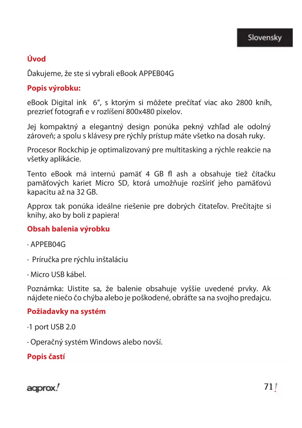 Stiahnite si návod pre váš Elektronický čítač vo formáte PDF zadarmo! Nájdite svoj návod APPEB04G - Approx a vezmite svoje elektronické zariadenie späť do rúk. Na tejto stránke sú zverejnené všetky dokumenty potrebné na používanie vášho zariadenia. APPEB04G značky Approx.