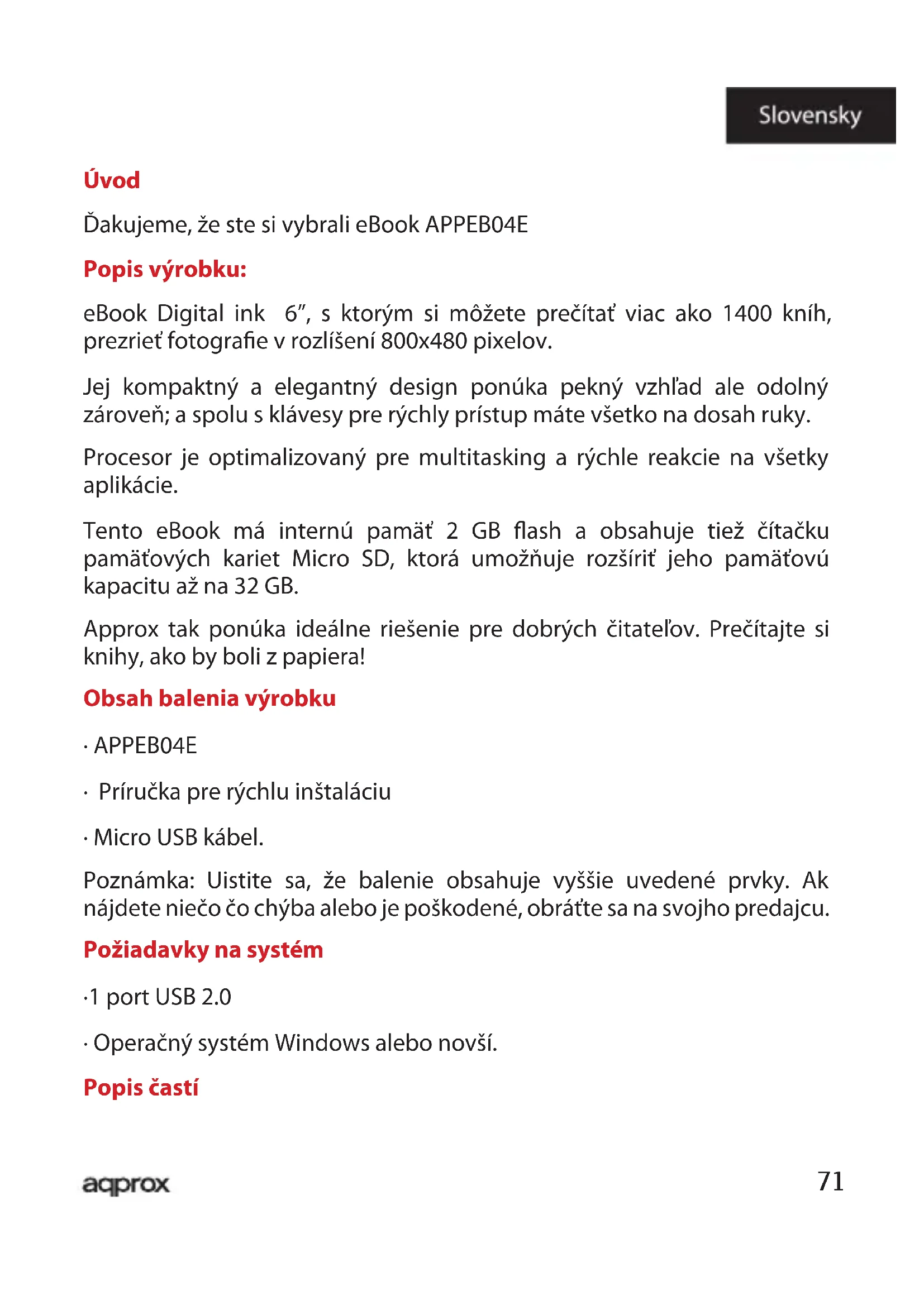 Stiahnite si návod pre váš Elektronický čítač vo formáte PDF zadarmo! Nájdite svoj návod APPEB04E - Approx a vezmite svoje elektronické zariadenie späť do rúk. Na tejto stránke sú zverejnené všetky dokumenty potrebné na používanie vášho zariadenia. APPEB04E značky Approx.