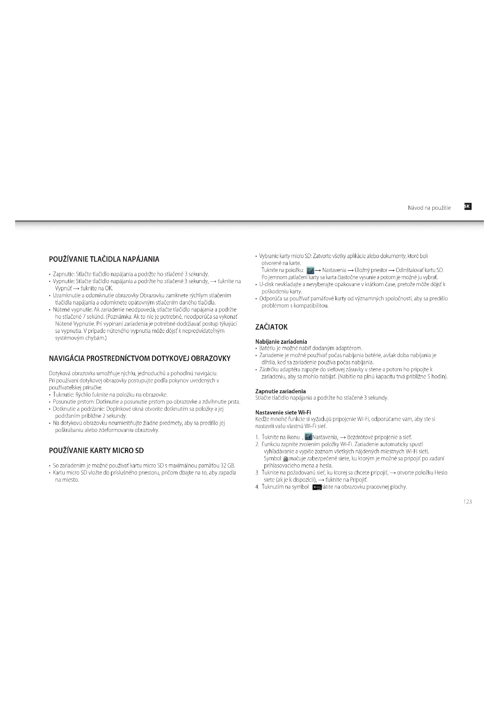 - Zástrčku adaptéra zapojte do sieťovej zásuvky v stene a potom ho pripojte k zariadeniu, aby sa mohlo nabíjať. (Nabitie na plnú kapacitu trvá približne 5 hodín). Zapnutie zariadenia Stlačte tlačidlo napájania a podržte ho stlačené 3 sekundy. Nastavenie siete Wi-Fi Keďže mnohé funkcie si vyžadujú pripojenie Wi-Fi, odporúčame vám, aby ste si nastavili vašu vlastnú Wi-Fi sieť.