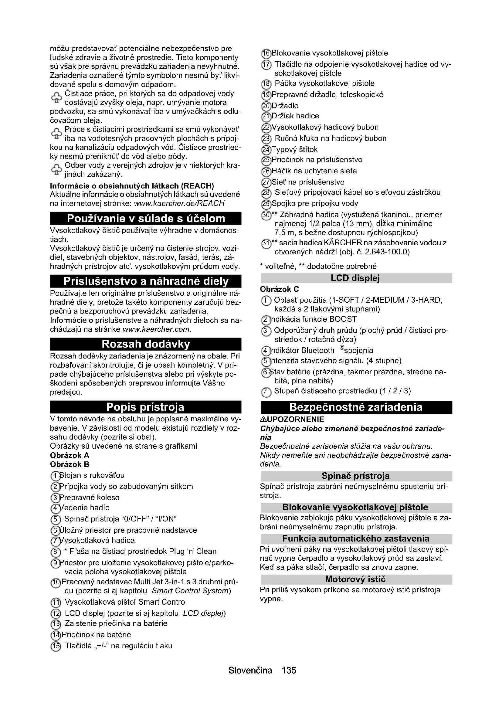 • EÚ vyhlásenie o zhode Slovenčina 135 môžu predstavovať potenciálne nebezpečenstvo pre ľudské zdravie a životné prostredie. Tieto komponenty sú však pre správnu prevádzku zariadenia nevyhnutné. Zariadenia označené týmto symbolom nesmú byť likvi- dované spolu s domovým odpadom. Čistiace práce, pri ktorých sa do odpadovej vody dostávajú zvyšky oleja, napr. umývanie motora, podvozku, sa smú vykonávať iba v umývačkách s odlu- čovačom oleja. Práce s čistiacimi prostriedkami sa smú vykonávať iba na vodotesných pracovných plochách s prípoj- kou na kanalizáciu odpadových vôd. Čistiace prostried- ky nesmú preniknúť do vôd alebo pôdy. Odber vody z verejných zdrojov je v niektorých kra- jinách zakázaný. Informácie o obsiahnutých látkach (REACH) Aktuálne informácie o obsiahnutých látkach sú uvedené na internetovej stránke: www.kaercher.de/REACH Používanie v súlade s účelom Vysokotlakový čistič používajte výhradne v domácnos- tiach. Vysokotlakový čistič je určený na čistenie strojov, vozi- diel, stavebných objektov, nástrojov, fasád, terás, zá- hradných prístrojov atď. vysokotlakovým prúdom vody. Príslušenstvo a náhradné diely Používajte len originálne príslušenstvo a originálne ná- hradné diely, pretože takéto komponenty zaručujú bez- pečnú a bezporuchovú prevádzku zariadenia. Informácie o príslušenstve a náhradných dieloch sa na- chádzajú na stránke www.kaercher.com. Rozsah dodávky Rozsah dodávky zariadenia je znázornený na obale. Pri rozbaľovaní skontrolujte, či je obsah kompletný. V prí- pade chýbajúceho príslušenstva alebo pri výskyte po- škodení spôsobených prepravou informujte Vášho predajcu. Popis prístroja V tomto návode na obsluhu je popísané maximálne vy- bavenie. V závislosti od modelu existujú rozdiely v roz- sahu dodávky (pozrite si obal). Obrázky sú uvedené na strane s grafikami Obrázok A Obrázok B 1 Stojan s rukoväťou 2 Prípojka vody so zabudovaným sitkom 3 Prepravné koleso 4 Vedenie hadíc 5 Spínač prístroja “0/OFF” / “I/ON” 6 Úložný priestor pre pracovné nadstavce 7 Vysokotlaková hadica 8 * Fľaša na čistiaci prostriedok Plug ‘n’ Clean 9 Priestor pre uloženie vysokotlakovej pištole/parko- vacia poloha vysokotlakovej pištole 10 Pracovný nadstavec Multi Jet 3-in-1 s 3 druhmi prú- du (pozrite si aj kapitolu Smart Control System) 11 Vysokotlaková pištoľ Smart Control 12 LCD displej (pozrite si aj kapitolu LCD displej) 13 Zaistenie priečinka na batérie 14 Priečinok na batérie 15 Tlačidlá „+/-“ na reguláciu tlaku 16 Blokovanie vysokotlakovej pištole 17 Tlačidlo na odpojenie vysokotlakovej hadice od vy- sokotlakovej pištole 18 Páčka vysokotlakovej pištole 19 Prepravné držadlo, teleskopické 20 Držadlo 21 Držiak hadice 22 Vysokotlakový hadicový bubon 23 Ručná kľuka na hadicový bubon 24 Typový štítok 25 Priečinok na príslušenstvo 26 Háčik na uchytenie siete 27 Sieť na príslušenstvo 28 Sieťový pripojovací kábel so sieťovou zástrčkou 29 Spojka pre prípojku vody 30 ** Záhradná hadica (vystužená tkaninou, priemer najmenej 1/2 palca (13 mm), dĺžka minimálne 7,5 m, s bežne dostupnou rýchlospojkou) 31 ** sacia hadica KÄRCHER na zásobovanie vodou z otvorených nádrží (obj. č. 2.643-100.0) p. 140