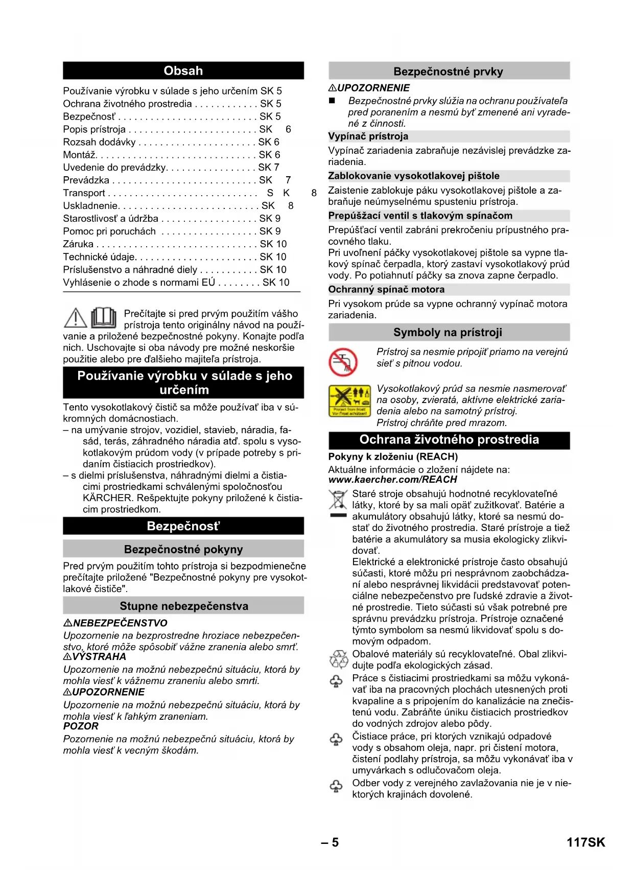 92 dB(A) Se rezervă dreptul la modificări tehnice. Accesorii şi piese de schimb Declaraţie de conformitate CE Produs: Aparat de curăţare sub presiune Tip: 1.324-xxx Directive EG respectate: 2000/14/CE 2014/30/UE 2006/42/CE (+2009/127/CE) 2011/65/UE Norme armonizate utilizate: EN 50581 EN 55014–1: 2006+A1: 2009+A2: 2011 EN 55014–2: 1997+A1: 2001+A2: 2008 EN 60335–1 EN 60335–2–79 EN 61000–3–2: 2014 EN 61000–3–3: 2013 EN 62233: 2008 Procedura de evaluare a conformităţii: 2000/14/CE: Anexa V Nivel de zgomot dB(A) măsurat: 89 garantat: 92 Winnenden, 2016/01/01 CEO Head of Approbation 116 RO– 5 Prečítajte si pred prvým použitím vášho prístroja tento originálny návod na použí- vanie a priložené bezpečnostné pokyny. Konajte podľa nich. Uschovajte si oba návody pre možné neskoršie použitie alebo pre ďalšieho majiteľa prístroja. Tento vysokotlakový čistič sa môže používať iba v sú- kromných domácnostiach. – na umývanie strojov, vozidiel, stavieb, náradia, fa- sád, terás, záhradného náradia atď. spolu s vyso- kotlakovým prúdom vody (v prípade potreby s pri- daním čistiacich prostriedkov). – s dielmi príslušenstva, náhradnými dielmi a čistia- cimi prostriedkami schválenými spoločnosťou KÄRCHER. Rešpektujte pokyny priložené k čistia- cim prostriedkom. Pred prvým použitím tohto prístroja si bezpodmienečne prečítajte priložené "Bezpečnostné pokyny pre vysokot- lakové čističe". NEBEZPEČENSTVO Upozornenie na bezprostredne hroziace nebezpečen- stvo, ktoré môže spôsobiť vážne zranenia alebo smrť. 몇 VÝSTRAHA Upozornenie na možnú nebezpečnú situáciu, ktorá by mohla viesť k vážnemu zraneniu alebo smrti. 몇 UPOZORNENIE Upozornenie na možnú nebezpečnú situáciu, ktorá by mohla viesť k ľahkým zraneniam. POZOR Pozornenie na možnú nebezpečnú situáciu, ktorá by mohla viesť k vecným škodám. 몇 UPOZORNENIE Bezpečnostné prvky slúžia na ochranu používateľa pred poranením a nesmú byť zmenené ani vyrade- né z činnosti. Vypínač zariadenia zabraňuje nezávislej prevádzke za- riadenia. Zaistenie zablokuje páku vysokotlakovej pištole a za- braňuje neúmyselnému spusteniu prístroja. Prepúšťací ventil zabráni prekročeniu prípustného pra- covného tlaku. Pri uvoľnení páčky vysokotlakovej pištole sa vypne tla- kový spínač čerpadla, ktorý zastaví vysokotlakový prúd vody. Po potiahnutí páčky sa znova zapne čerpadlo. Pri vysokom prúde sa vypne ochranný vypínač motora zariadenia. Pokyny k zloženiu (REACH) Aktuálne informácie o zložení nájdete na: www.kaercher.com/REACH Obsah Používanie výrobku v súlade s jeho určením SK 5 Ochrana životného prostredia . . . . . . . . . . . . SK 5 Bezpečnosť . . . . . . . . . . . . . . . . . . . . . . . . . . SK 5 Popis prístroja . . . . . . . . . . . . . . . . . . . . . . . . SK6 Rozsah dodávky . . . . . . . . . . . . . . . . . . . . . . SK 6 Montáž. . . . . . . . . . . . . . . . . . . . . . . . . . . . . . SK 6 Uvedenie do prevádzky. . . . . . . . . . . . . . . . . SK 7 Prevádzka . . . . . . . . . . . . . . . . . . . . . . . . . . . SK7 Transport . . . . . . . . . . . . . . . . . . . . . . . . . . . .SK 8 Uskladnenie. . . . . . . . . . . . . . . . . . . . . . . . . . SK8 Starostlivosť a údržba . . . . . . . . . . . . . . . . . . SK 9 Pomoc pri poruchách . . . . . . . . . . . . . . . . . . SK 9 Záruka . . . . . . . . . . . . . . . . . . . . . . . . . . . . . . SK 10 Technické údaje. . . . . . . . . . . . . . . . . . . . . . . SK 10 Príslušenstvo a náhradné diely . . . . . . . . . . . SK 10 Vyhlásenie o zhode s normami EÚ . . . . . . . . SK 10 Používanie výrobku v súlade s jeho určením Bezpečnosť Bezpečnostné pokyny Stupne nebezpečenstva Bezpečnostné prvky Vypínač prístroja Zablokovanie vysokotlakovej pištole Prepúšžací ventil s tlakovým spínačom Ochranný spínač motora Symboly na prístroji Prístroj sa nesmie pripojiť priamo na verejnú sieť s pitnou vodou. Vysokotlakový prúd sa nesmie nasmerovať na osoby, zvieratá, aktívne elektrické zaria- denia alebo na samotný prístroj. Prístroj chráňte pred mrazom. Ochrana životného prostredia Staré stroje obsahujú hodnotné recyklovateľné látky, ktoré by sa mali opäť zužitkovať. Batérie a akumulátory obsahujú látky, ktoré sa nesmú do- stať do životného prostredia. Staré prístroje a tiež batérie a akumulátory sa musia ekologicky zlikvi- dovať. Elektrické a elektronické prístroje často obsahujú súčasti, ktoré môžu pri nesprávnom zaobchádza- ní alebo nesprávnej likvidácii predstavovať poten- ciálne nebezpečenstvo pre ľudské zdravie a život- né prostredie. Tieto súčasti sú však potrebné pre správnu prevádzku prístroja. Prístroje označené týmto symbolom sa nesmú likvidovať spolu s do- movým odpadom. Obalové materiály sú recyklovateľné. Obal zlikvi- dujte podľa ekologických zásad. Práce s čistiacimi prostriedkami sa môžu vykoná- vať iba na pracovných plochách utesnených proti kvapaline a s pripojením do kanalizácie na znečis- tenú vodu. Zabráňte úniku čistiacich prostriedkov do vodných zdrojov alebo pôdy. Čistiace práce, pri ktorých vznikajú odpadové vody s obsahom oleja, napr. pri čistení motora, čistení podlahy prístroja, sa môžu vykonávať iba v umyvárkach s odlučovačom oleja. Odber vody z verejného zavlažovania nie je v nie- ktorých krajinách dovolené. 117SK– 6 V tomto návode na prevádzku je popísaná maximálna výbava. Podľa modelu existujú rozdiely v rozsahu do- dávky (pozri obal). Obrázky nájdete na vyklápajúcej sa strane 4 1 Spojovací diel na pripojenie prívodu vody 2 Prípojka vody so zabudovaným sitkom 3 Vysokotlaková hadica 4 Hadicový rozvod 5 Uloženie pre oceľové rúrky 6 Uskladnenie / Parkovacia poloha vysokotlakovej pištole 7 Prípojka pre čistiac