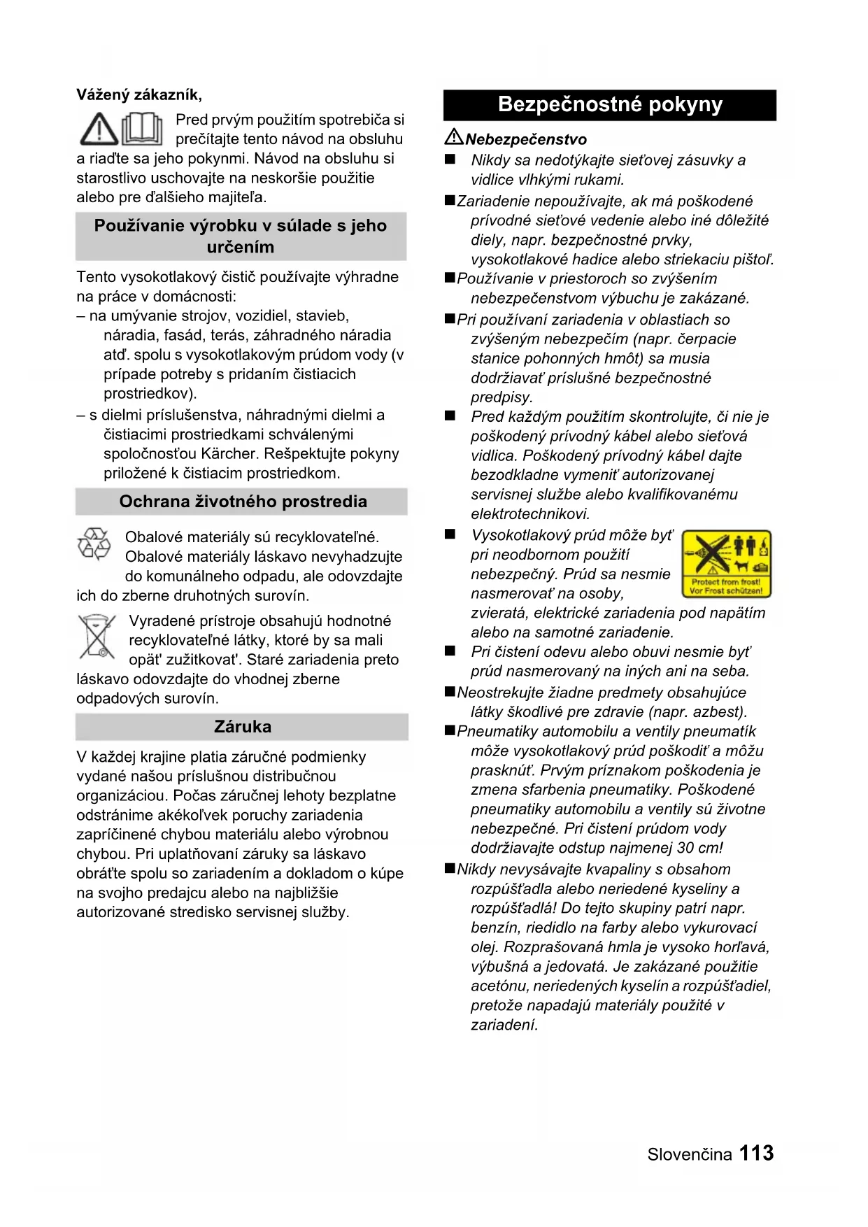 CEE) 2000/14/CE Norme armonizate utilizate: EN 60335–1 EN 60335–2–79 EN 55014–1: 2000 + A1: 2001 + A2: 2002 EN 55014–2: 1997 + A1: 2001 EN 61000–3–2: 2000 + A2: 2005 EN 61000–3–3: 1995 + A1: 2001 Procedura de evaluare a conformităţii: Anexa V Nivel de zgomot dB(A) măsurat: 85 dB(A) garantat: 87 dB(A)Slovenčina 113 Vážený zákazník, Pred prvým použitím spotrebiča si prečítajte tento návod na obsluhu a riaďte sa jeho pokynmi. Návod na obsluhu si starostlivo uschovajte na neskoršie použitie alebo pre ďalšieho majiteľa. Tento vysokotlakový čistič používajte výhradne na práce v domácnosti: – na umývanie strojov, vozidiel, stavieb, náradia, fasád, terás, záhradného náradia atď. spolu s vysokotlakovým prúdom vody (v prípade potreby s pridaním čistiacich prostriedkov). – s dielmi príslušenstva, náhradnými dielmi a čistiacimi prostriedkami schválenými spoločnosťou Kärcher. Rešpektujte pokyny priložené k čistiacim prostriedkom. Obalové materiály sú recyklovateľné. Obalové materiály láskavo nevyhadzujte do komunálneho odpadu, ale odovzdajte ich do zberne druhotných surovín. Vyradené prístroje obsahujú hodnotné recyklovateľné látky, ktoré by sa mali opät' zužitkovat'. Staré zariadenia preto láskavo odovzdajte do vhodnej zberne odpadových surovín. V každej krajine platia záručné podmienky vydané našou príslušnou distribučnou organizáciou. Počas záručnej lehoty bezplatne odstránime akékoľvek poruchy zariadenia zapríčinené chybou materiálu alebo výrobnou chybou. Pri uplatňovaní záruky sa láskavo obráťte spolu so zariadením a dokladom o kúpe na svojho predajcu alebo na najbližšie autorizované stredisko servisnej služby. Nebezpečenstvo ! Nikdy sa nedotýkajte sieťovej zásuvky a vidlice vlhkými rukami. ! Zariadenie nepoužívajte, ak má poškodené prívodné sieťové vedenie alebo iné dôležité diely, napr. bezpečnostné prvky, vysokotlakové hadice alebo striekaciu pištoľ. ! Používanie v priestoroch so zvýšením nebezpečenstvom výbuchu je zakázané. ! Pri používaní zariadenia v oblastiach so zvýšeným nebezpečím (napr. čerpacie stanice pohonných hmôt) sa musia dodržiavať príslušné bezpečnostné predpisy. ! Pred každým použitím skontrolujte, či nie je poškodený prívodný kábel alebo sieťová vidlica. Poškodený prívodný kábel dajte bezodkladne vymeniť autorizovanej servisnej službe alebo kvalifikovanému elektrotechnikovi. ! Vysokotlakový prúd môže byť pri neodbornom použití nebezpečný. Prúd sa nesmie nasmerovať na osoby, zvieratá, elektrické zariadenia pod napätím alebo na samotné zariadenie. ! Pri čistení odevu alebo obuvi nesmie byť prúd nasmerovaný na iných ani na seba. ! Neostrekujte žiadne predmety obsahujúce látky škodlivé pre zdravie (napr. azbest). ! Pneumatiky automobilu a ventily pneumatík môže vysokotlakový prúd poškodiť a môžu prasknúť. Prvým príznakom poškodenia je zmena sfarbenia pneumatiky. Poškodené pneumatiky automobilu a ventily sú životne nebezpečné. Pri čistení prúdom vody dodržiavajte odstup najmenej 30 cm! ! Nikdy nevysávajte kvapaliny s obsahom rozpúšťadla alebo neriedené kyseliny a rozpúšťadlá! Do tejto skupiny patrí napr. benzín, riedidlo na farby alebo vykurovací olej. Rozprašovaná hmla je vysoko horľavá, výbušná a jedovatá. Je zakázané použitie acetónu, neriedených kyselín a rozpúšťadiel, pretože napadajú materiály použité v zariadení. Používanie výrobku v súlade s jeho určením Ochrana životného prostredia Záruka Bezpečnostné pokyny114 Slovenčina 몇 Pozor ! Nevhodné predlžovacie vedenia môžu byť nebezpečné. Vo vonkajšom prostredí používajte výhradne schválené a patrične označené predlžovacie káble s dostatočným priemerom vodiča: