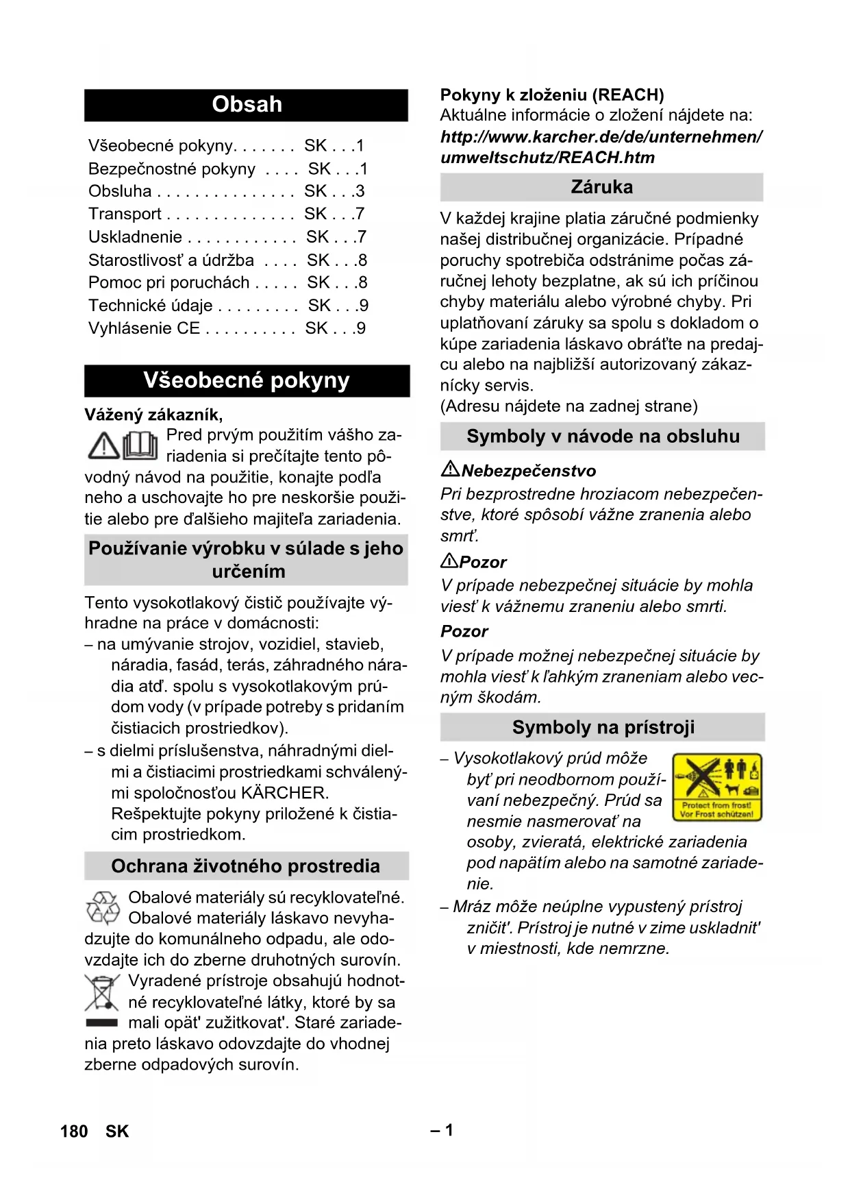 - dB(A) 89 Declaraţia CE Produs: Aparat de curăţare sub pre- siune Tip: 1.180-xxx 1.181-xxx Directive EG respectate: 2006/42/CE (+2009/127/CE) 2004/108/CE 2000/14/CE Norme armonizate utilizate: EN 55014–1: 2006 + A1: 2009 EN 55014–2: 1997 + A2: 2008 EN 60335–1 EN 60335–2–79 EN 61000–3–2: 2006 + A2: 2009 EN 61000–3–3: 2008 EN 62233: 2008 Procedura de evaluare a conformităţii: 2000/14/CE: Anexa V Nivel de zgomot dB(A) măsurat: 87 garantat: 89 CEO Head of Approbation 179RO– 1 Vážený zákazník, Pred prvým použitím vášho za- riadenia si prečítajte tento pô- vodný návod na použitie, konajte podľa neho a uschovajte ho pre neskoršie použi- tie alebo pre ďalšieho majiteľa zariadenia. Tento vysokotlakový čistič používajte vý- hradne na práce v domácnosti: – na umývanie strojov, vozidiel, stavieb, náradia, fasád, terás, záhradného nára- dia atď. spolu s vysokotlakovým prú- dom vody (v prípade potreby s pridaním čistiacich prostriedkov). – s dielmi príslušenstva, náhradnými diel- mi a čistiacimi prostriedkami schválený- mi spoločnosťou KÄRCHER. Rešpektujte pokyny priložené k čistia- cim prostriedkom. Obalové materiály sú recyklovateľné. Obalové materiály láskavo nevyha- dzujte do komunálneho odpadu, ale odo- vzdajte ich do zberne druhotných surovín. Vyradené prístroje obsahujú hodnot- né recyklovateľné látky, ktoré by sa mali opät' zužitkovat'. Staré zariade- nia preto láskavo odovzdajte do vhodnej zberne odpadových surovín. Pokyny k zloženiu (REACH) Aktuálne informácie o zložení nájdete na: http://www.karcher.de/de/unternehmen/ umweltschutz/REACH.htm V každej krajine platia záručné podmienky našej distribučnej organizácie. Prípadné poruchy spotrebiča odstránime počas zá- ručnej lehoty bezplatne, ak sú ich príčinou chyby materiálu alebo výrobné chyby. Pri uplatňovaní záruky sa spolu s dokladom o kúpe zariadenia láskavo obráťte na predaj- cu alebo na najbližší autorizovaný zákaz- nícky servis. (Adresu nájdete na zadnej strane) Nebezpečenstvo Pri bezprostredne hroziacom nebezpečen- stve, ktoré spôsobí vážne zranenia alebo smrť. 몇 Pozor V prípade nebezpečnej situácie by mohla viesť k vážnemu zraneniu alebo smrti. Pozor V prípade možnej nebezpečnej situácie by mohla viesť k ľahkým zraneniam alebo vec- ným škodám. – Vysokotlakový prúd môže byť pri neodbornom použí- vaní nebezpečný. Prúd sa nesmie nasmerovať na osoby, zvieratá, elektrické zariadenia pod napätím alebo na samotné zariade- nie. – Mráz môže neúplne vypustený prístroj zničit'. Prístroj je nutné v zime uskladnit' v miestnosti, kde nemrzne. Obsah Všeobecné pokyny