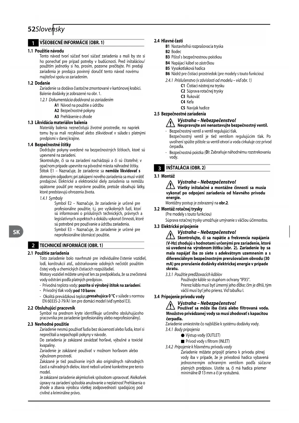 Toto zariadenie bolo navrhnuté pre individuálne čistenie vozidiel, lodí, konštrukcií atď., odstraňovanie odolných nečistôt použitím čistej vody a chemických čistiacich rozpúšťadiel. Motory vozidiel môžete umývať len za predpokladu, že sa znečistená vody odstráni podľa platných predpisov.- Prívodná teplota vody: pozrite si výrobný štítok na zariadení.- Prívodný tlak vody: pod 10 barov.- Okolitá prevádzková teplota presahujúca 0 °C v súlade s normou EN 60335-2-79/A1 len pre domáci model (viď symbol E3).