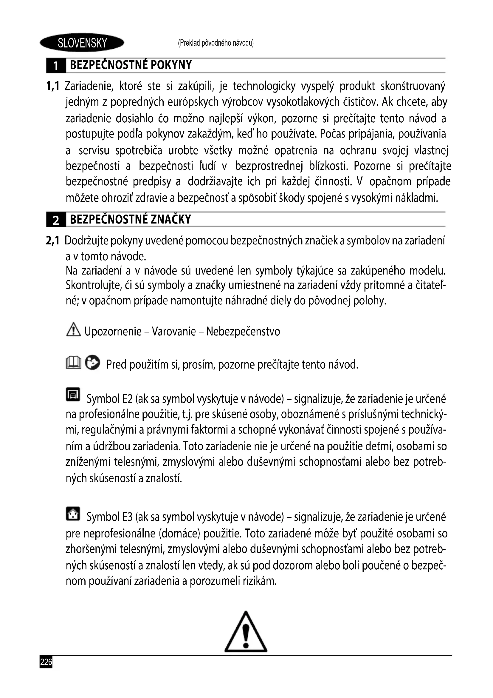 né; v opačnom prípade namontujte náhradné diely do pôvodnej polohy. Upozornenie – Varovanie – Nebezpečenstvo Pred použitím si, prosím, pozorne prečítajte tento návod. Symbol E2 (ak sa symbol vyskytuje v návode) – signalizuje, že zariadenie je určené na profesionálne použitie, t.j. pre skúsené osoby, oboznámené s príslušnými technický- mi, regulačnými a právnymi faktormi a schopné vykonávať činnosti spojené s používa- ním a údržbou zariadenia. Toto zariadenie nie je určené na použitie deťmi, osobami so zníženými telesnými, zmyslovými alebo duševnými schopnosťami alebo bez potreb- ných skúseností aznalostí. Symbol E3 (ak sa symbol vyskytuje v návode) – signalizuje, že zariadenie je určené pre neprofesionálne (domáce) použitie. Toto zariadené môže byť použité osobami so zhoršenými telesnými, zmyslovými alebo duševnými schopnosťami alebo bez potreb