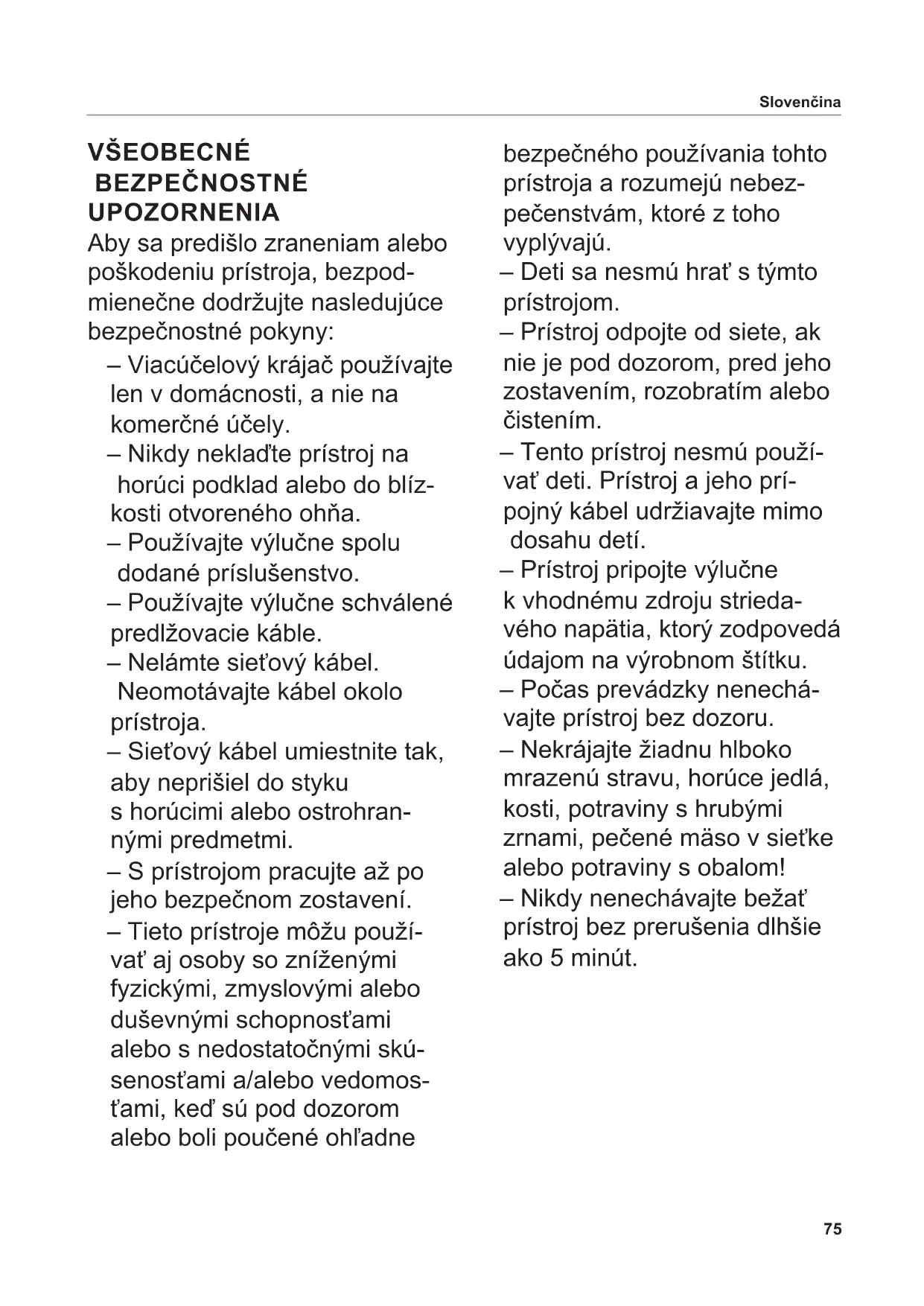 ПОЯСНЕНИЯ К СИМВОЛАМ Символ Пояснение Маркировка CE: данное изделие соответствует действующим требованиям Европейского союза. Данное изделие выведено на рынок после 13 августа 2005 г. Его запрещается утилизировать вместе с обычным бытовым мусором. Символ с зачеркнутым мусорным контейнером указывает на необходимость раздельного сбора. Подходит для контакта с пищевыми продуктами Устройство класса защиты II75 VŠEOBECNÉ BEZPEČNOSTNÉ UPOZORNENIA Aby sa predišlo zraneniam alebo poškodeniu prístroja, bezpod- mienečne dodržujte nasledujúce bezpečnostné pokyny: – Viacúčelový krájač používajte len v domácnosti, a nie na komerčné účely. – Nikdy neklaďte prístroj na horúci podklad alebo do blíz- kosti otvoreného ohňa. – Používajte výlučne spolu dodané príslušenstvo. – Používajte výlučne schválené predlžovacie káble. – Nelámte sieťový kábel. Neomotávajte kábel okolo prístroja. – Sieťový kábel umiestnite tak, aby neprišiel do styku s horúcimi alebo ostrohran- nými predmetmi. – S prístrojom pracujte až po jeho bezpečnom zostavení. – Tieto prístroje môžu použí- vať aj osoby so zníženými fyzickými, zmyslovými alebo duševnými schopnosťami alebo s nedostatočnými skú- senosťami a/alebo vedomos- ťami, keď sú pod dozorom alebo boli poučené ohľadne bezpečného používania tohto prístroja a rozumejú nebez- pečenstvám, ktoré z toho vyplývajú. – Deti sa nesmú hrať s týmto prístrojom. – Prístroj odpojte od siete, ak nie je pod dozorom, pred jeho zostavením, rozobratím alebo čistením. – Tento prístroj nesmú použí- vať deti. Prístroj a jeho prí- pojný kábel udržiavajte mimo dosahu detí. – Prístroj pripojte výlučne k vhodnému zdroju strieda- vého napätia, ktorý zodpovedá údajom na výrobnom štítku. – Počas prevádzky nenechá- vajte prístroj bez dozoru. – Nekrájajte žiadnu hlboko mrazenú stravu, horúce jedlá, kosti, potraviny s hrubými zrnami, pečené mäso v sieťke alebo potraviny s obalom! – Nikdy nenechávajte bežať prístroj bez prerušenia dlhšie ako 5 minút. Slovenčina76 Nebezpečenstvo zasiahnutia elektrickým prúdom – Pri každej prevádzkovej poruche, pred každým čis- tením a ak nie je prístroj v prevádzke, vždy vytiahnite sieťový kábel zo zástrčky. Neťahajte pritom za kábel, ale za zástrčku. – Nikdy neponárajte prístroj do vody. Nevystavujte prístroj dažďu alebo inej vlhkosti.