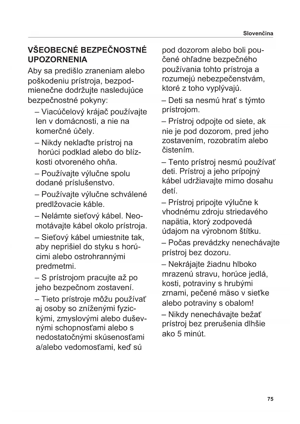 UPOZORNENIA Aby sa predišlo zraneniam alebo poškodeniu prístroja, bezpod- mienečne dodržujte nasledujúce bezpečnostné pokyny: – Viacúčelový krájač používajte len v domácnosti, a nie na komerčné účely. – Nikdy neklaďte prístroj na horúci podklad alebo do blíz- kosti otvoreného ohňa. – Používajte výlučne spolu dodané príslušenstvo. – Používajte výlučne schválené predlžovacie káble. – Nelámte sieťový kábel. Neo- motávajte kábel okolo prístroja. – Sieťový kábel umiestnite tak, aby neprišiel do styku s horú- cimi alebo ostrohrannými predmetmi. – S prístrojom pracujte až po jeho bezpečnom zostavení. – Tieto prístroje môžu používať aj osoby so zníženými fyzic- kými, zmyslovými alebo dušev- nými schopnosťami alebo s nedostatočnými skúsenosťami a/alebo vedomosťami, keď sú pod dozorom alebo boli pou- čené ohľadne bezpečného používania tohto prístroja a rozumejú nebezpečenstvám, ktoré z toho vyplývajú. – Deti sa nesmú hrať s týmto prístrojom. – Prístroj odpojte od siete, ak nie je pod dozorom, pred jeho zostavením, rozobratím alebo čistením. – Tento prístroj nesmú používať deti. Prístroj a jeho prípojný kábel udržiavajte mimo dosahu detí. – Prístroj pripojte výlučne k vhodnému zdroju striedavého napätia, ktorý zodpovedá údajom na výrobnom štítku. – Počas prevádzky nenechávajte prístroj bez dozoru. – Nekrájajte žiadnu hlboko mrazenú stravu, horúce jedlá, kosti, potraviny s hrubými zrnami, pečené mäso v sieťke alebo potraviny s obalom! – Nikdy nenechávajte bežať prístroj bez prerušenia dlhšie ako 5 minút.76 Nebezpečenstvo zasiahnutia elektrickým prúdom – Pri každej prevádzkovej poru- che, pred každým čistením a ak nie je prístroj v prevádzke, vždy vytiahnite sieťový kábel zo zástrčky. Neťahajte pritom za kábel, ale za zástrčku. – Nikdy neponárajte prístroj do vody. Nevystavujte prístroj dažďu alebo inej vlhkosti. V prípade, ak by prístroj predsa len spadol do vody, najprv vytiahnite koncovku zo zásuvky a až potom vyberte prístroj z vody. Pred opätovným uve- dením do prevádzky nechajte prístroj preskúšať schválenému servisnému miestu. – Nepoužívajte prístroj s vlhkými rukami. Nepoužívajte prístroj, ak je vlhký alebo mokrý alebo ak stojíte na vlhkej podlahe. Nepoužívajte prístroj vonku. – V prípade poškodenia častí prístroja okamžite zastavte prevádzku a skontaktujte sa so zákazníckou službou spoloč- nosti ritter. – Ak sa poškodí sieťový kábel, musí byť vymenený výrobcom, jeho servisnou službou alebo podobnými kvalikovanými osobami, aby sa predišlo ohrozeniu. Nebezpečenstvo poranenia – Prístroj sa nesmie používať bez posúvača rezanej suroviny alebo bez prítlačnej dosky, iba ak veľkosť a tvar rezanej suro- viny nedovoľuje ich použitie. – Pred výmenou príslušenstva alebo prídavných dielcov, ktoré sa počas prevádzky pohybujú, sa prístroj musí vypnúť a odpo- jiť od siete. – Kotúčový nôž je veľmi ostrý. – Pri prevádzke prístroja sa v žiadnom prípade nesmiete dotknúť kotúčového noža! – Pred čistením prístroj vypnite, vytiahnite zo siete a otočte regulátor hrúbky narezania do polohy „0“. – Po vypnutí kotúčový nôž ešte chvíľu dobieha. Slovenčina77 Vyberte obrázky na prednej a zadnej obálke príručky. Pred uvedením prístroja do prevádzky si starostlivo prečítajte návod. Uschovajte si návod na použitie a v prípade odovzdania prístroja inej osobe ho priložte k prístroju. Alternatívne je k dispozícii aktu- álny návod na použitie na stránke www.ritterwerk.de.