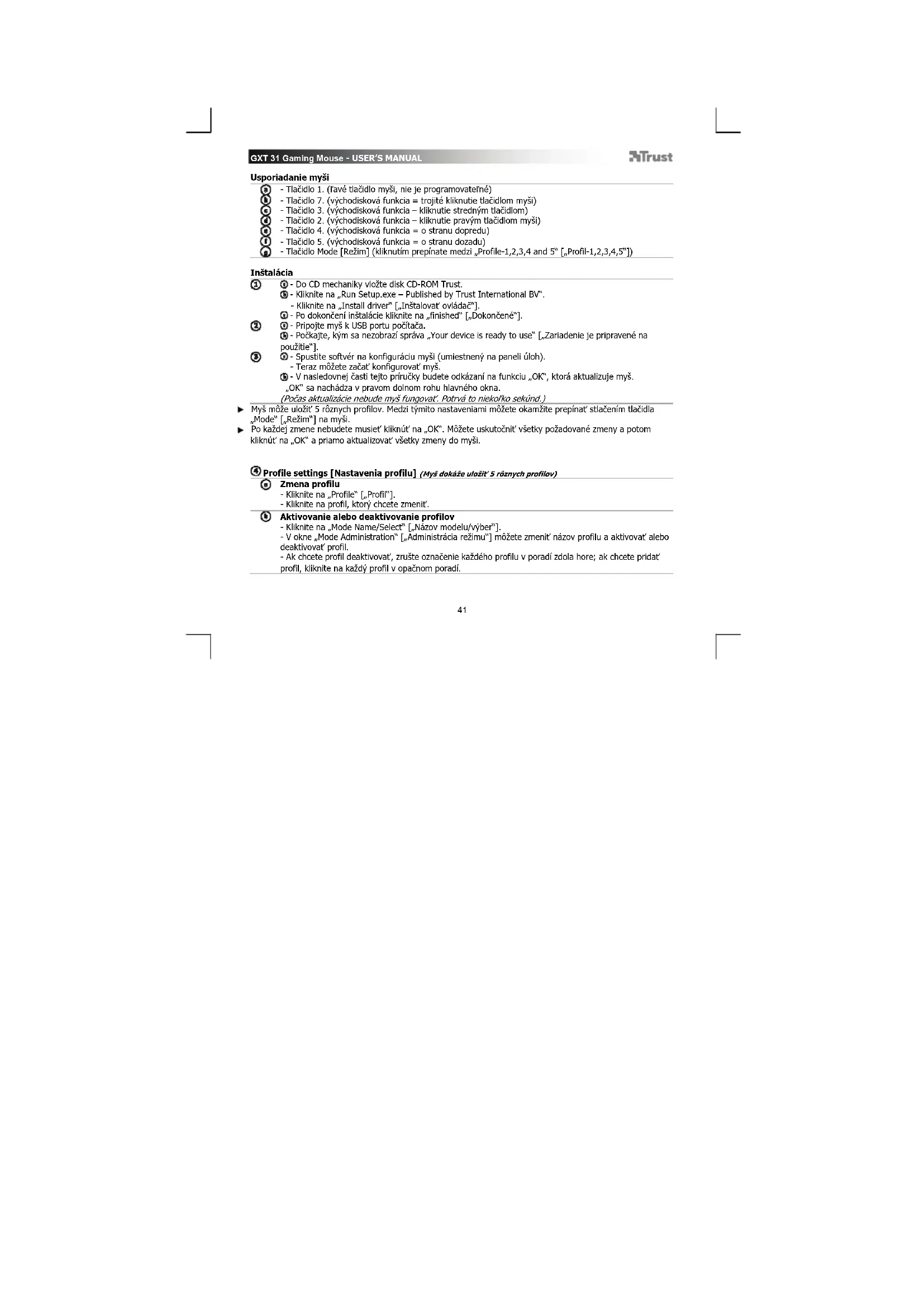 - Do CD mechaniky vložte disk CD-ROM Trust. - Kliknite na „Run Setup.exe – Published by Trust International BV“. - Kliknite na „Install driver“ [„Inštalovať ovládač“]. - Po dokončení inštalácie kliknite na „finished“ [„Dokončené“]. - Pripojte myš k USB portu počítača. - Počkajte, kým sa nezobrazí správa „Your device is ready to use“ [„Zariadenie je pripravené na použitie“]. - Spustite softvér na konfiguráciu myši (umiestnený na paneli úloh). - Teraz môžete začať konfigurovať myš. - V nasledovnej časti tejto príručky budete odkázaní na funkciu „OK“, ktorá aktualizuje myš. „OK“ sa nachádza v pravom dolnom rohu hlavného okna. (Počas aktualizácie nebude myš fungovať. Potrvá to niekoľko sekúnd.) Myš môže uložiť 5 rôznych profilov. Medzi týmito nastaveniami môžete okamžite prepínať stlačením tlačidla „Mode“ [„Režim“] na myši. Po každej zmene nebudete musieť kliknúť na „OK“. Môžete uskutočniť všetky požadované zmeny a potom kliknúť na „OK“ a priamo aktualizovať všetky zmeny do myši.