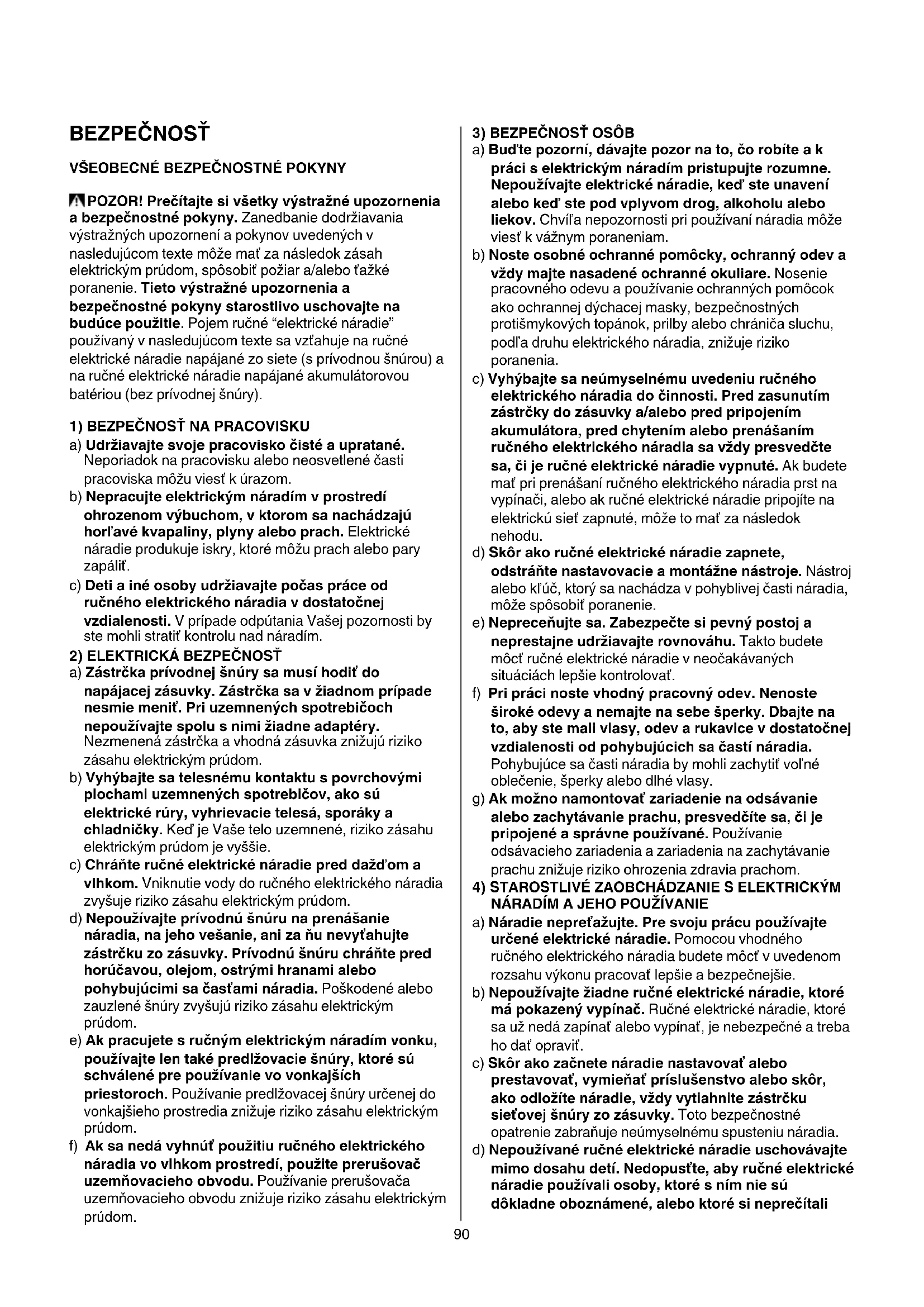 POZOR! Prečítajte si všetky výstražné upozornenia a bezpečnostné pokyny. Zanedbanie dodržiavania výstražných upozornení a pokynov uvedených v nasledujúcom texte môže mať za následok zásah elektrickým prúdom, spôsobiť požiar a/alebo ťažké poranenie. Tieto výstražné upozornenia a bezpečnostné pokyny starostlivo uschovajte na budúce použitie. Pojem ručné “elektrické náradie” používaný v nasledujúcom texte sa vzťahuje na ručné elektrické náradie napájané zo siete (s prívodnou šnúrou) a na ručné elektrické náradie napájané akumulátorovou batériou (bez prívodnej šnúry).