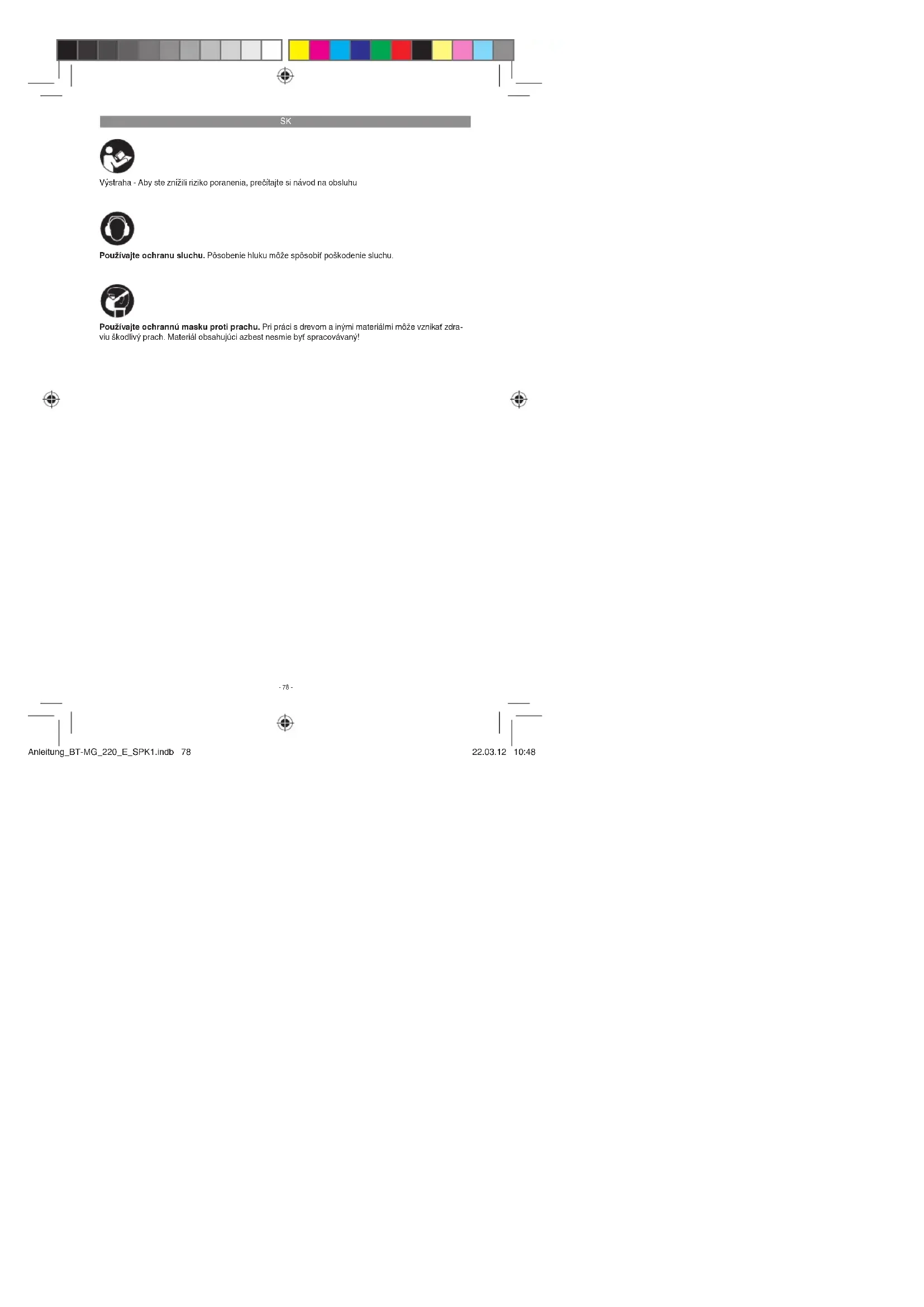 Výstraha - Aby ste znížili riziko poranenia, prečítajte si návod na obsluhu Používajte ochranu sluchu. Pôsobenie hluku môže spôsobiť poškodenie sluchu. Používajte ochrannú masku proti prachu. Pri práci s drevom a inými materiálmi môže vznikať zdra- viu škodlivý prach. Materiál obsahujúci azbest nesmie byť spracovávaný! Anleitung_BT-MG_220_E_SPK1.indb 78Anleitung_BT-MG_220_E_SPK1.indb 78 22.03.12 10:4822.03.12 10:48SK